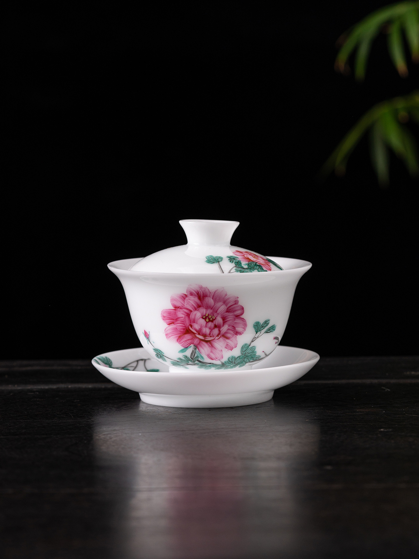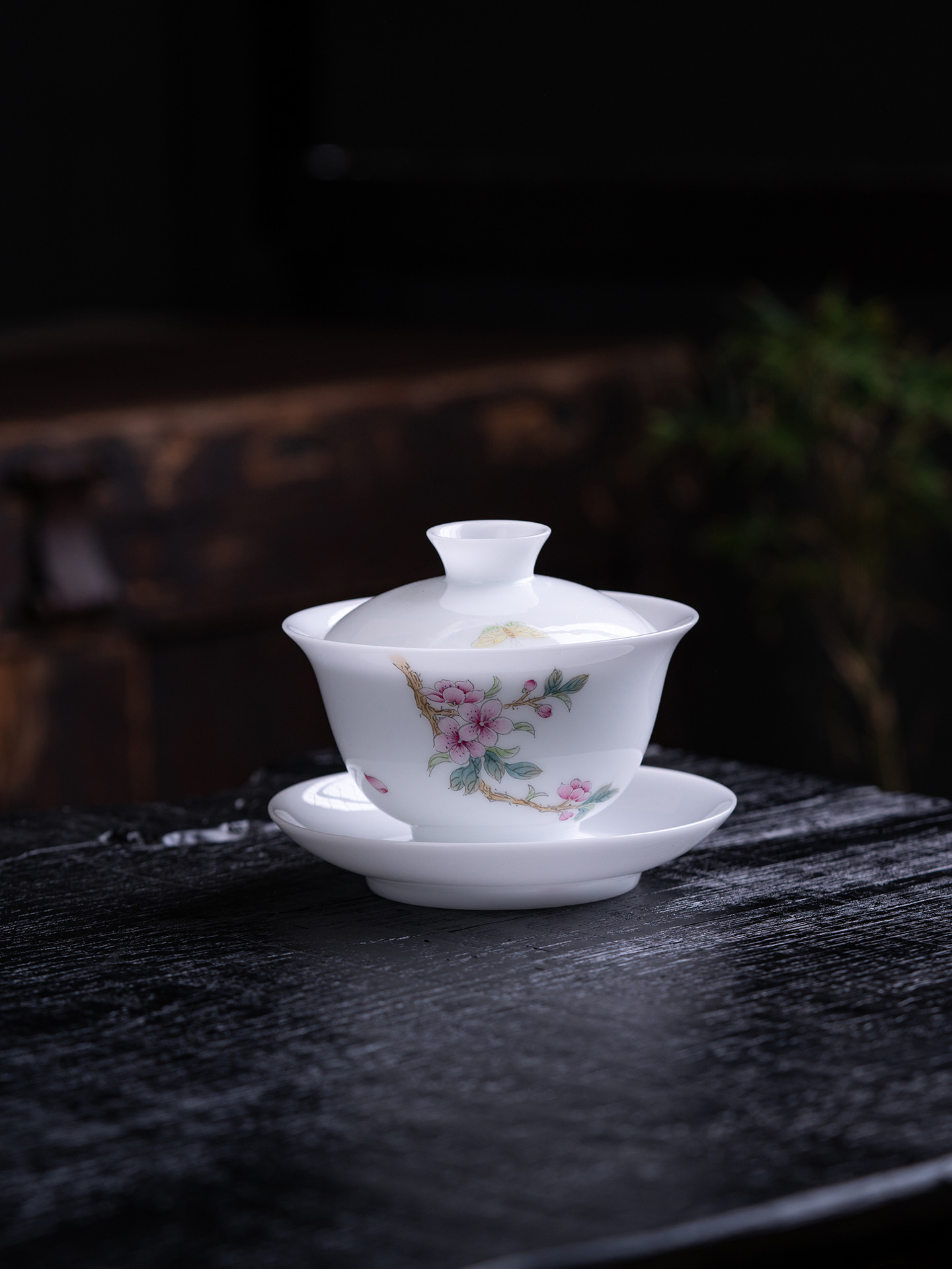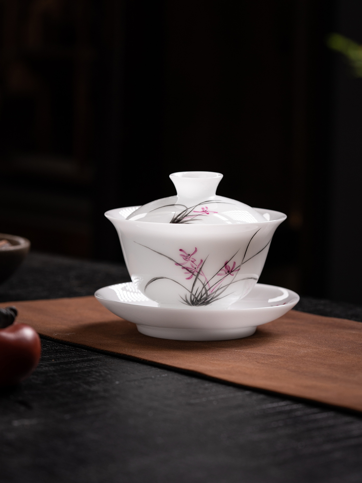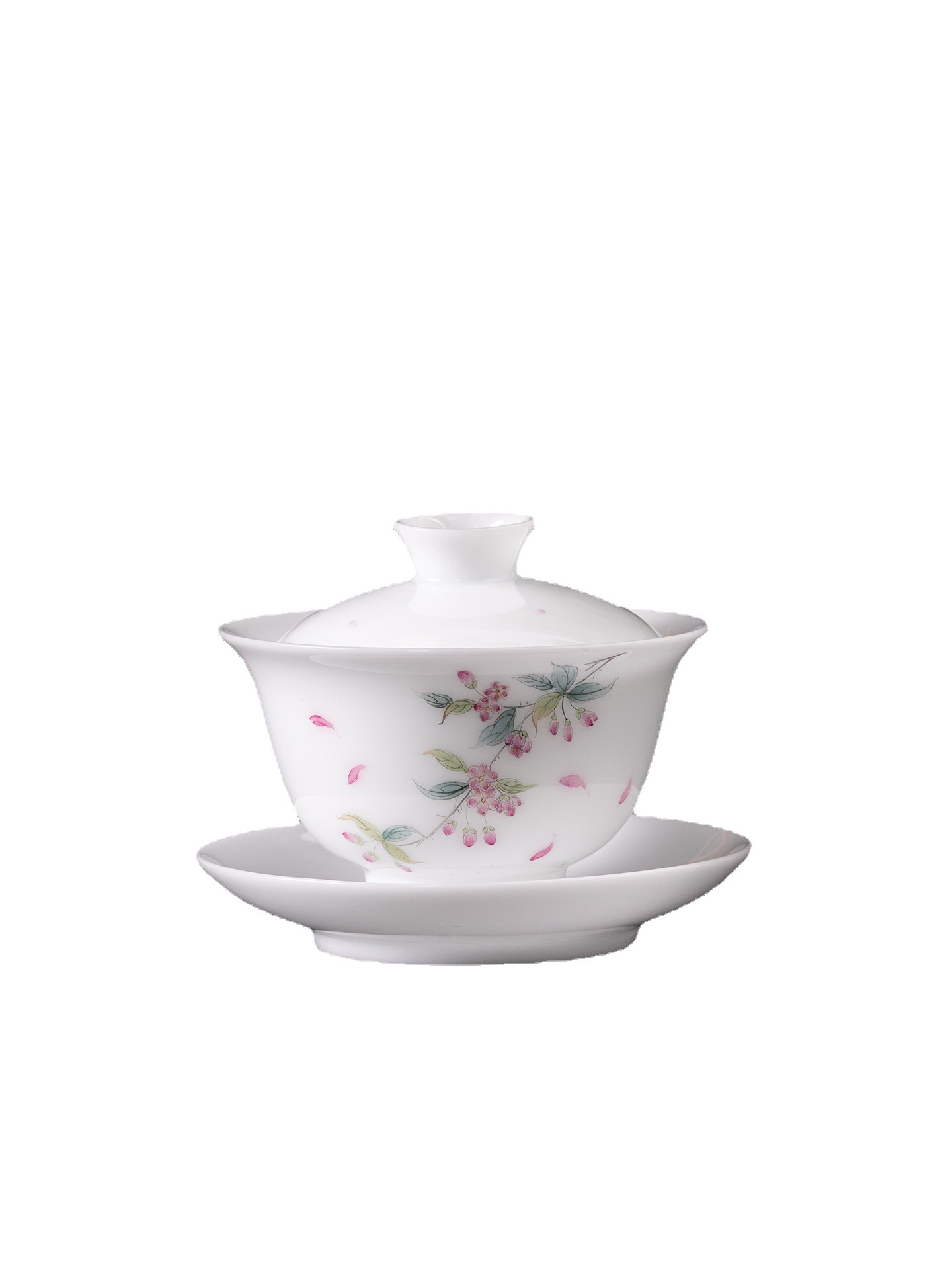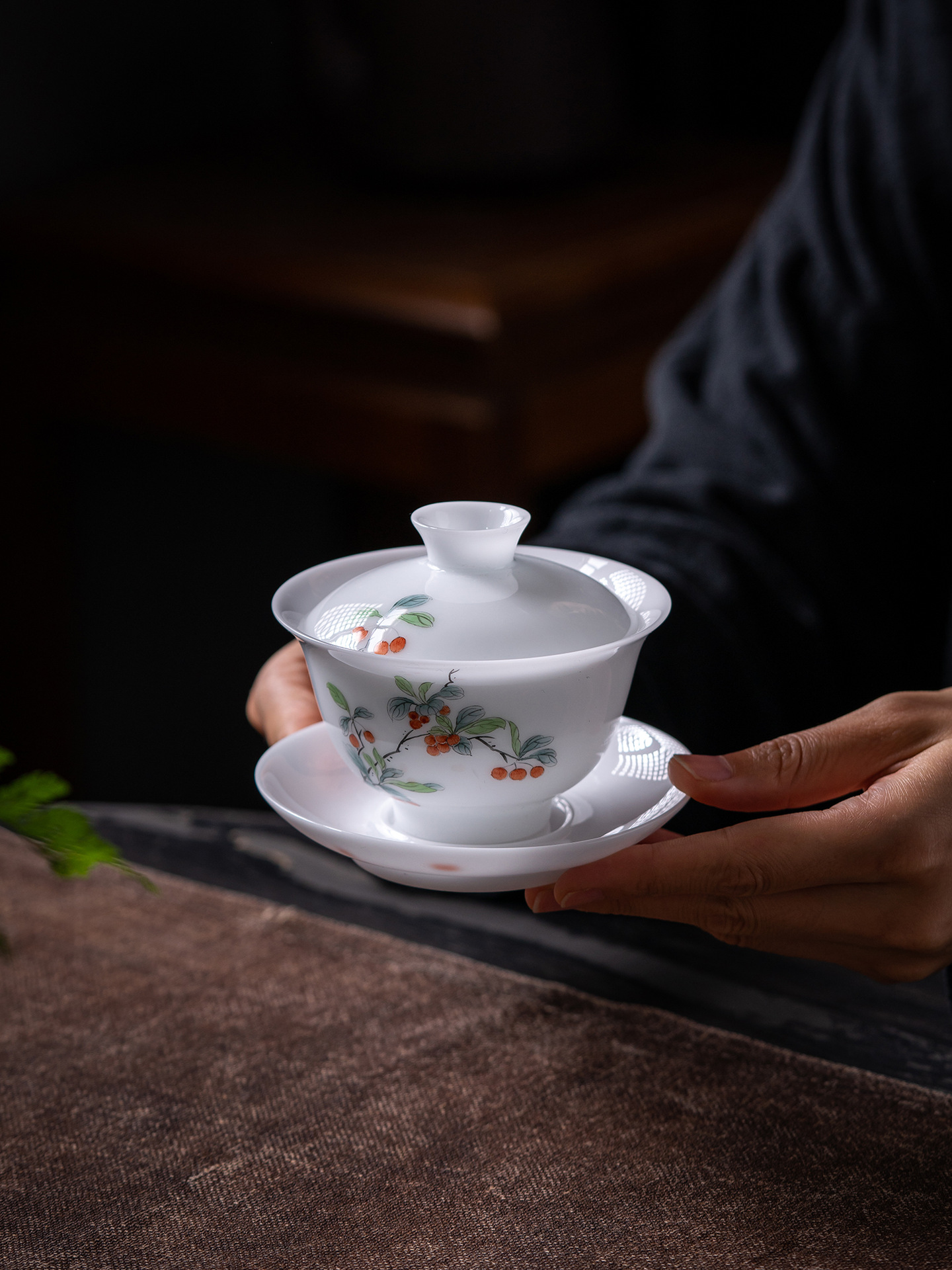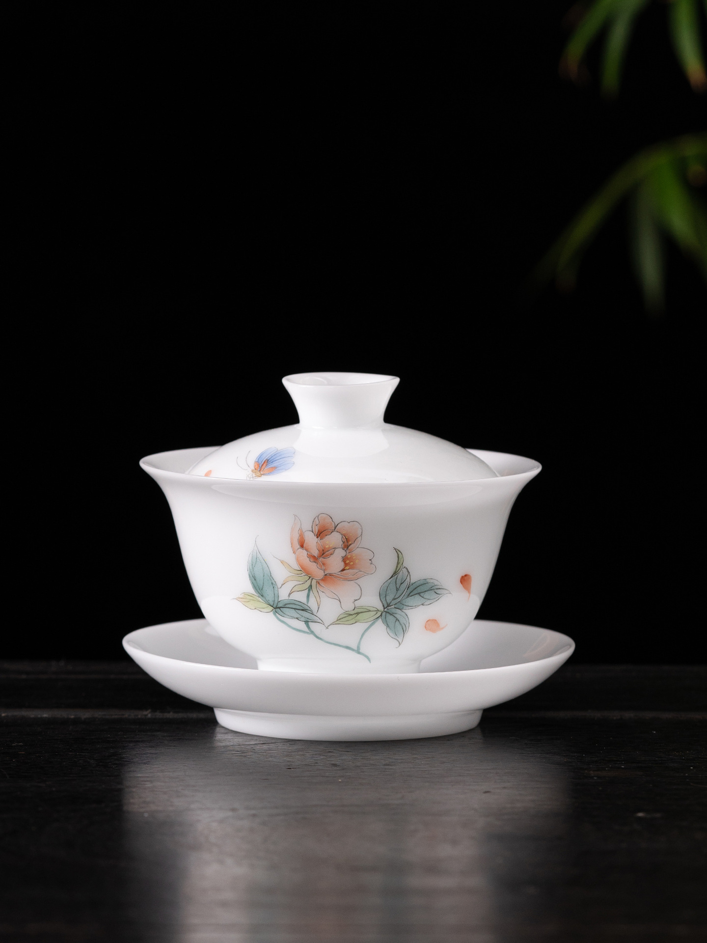 冰种玉瓷单个羊脂玉不烫手三才盖碗茶杯手绘茶碗整套套装带盖