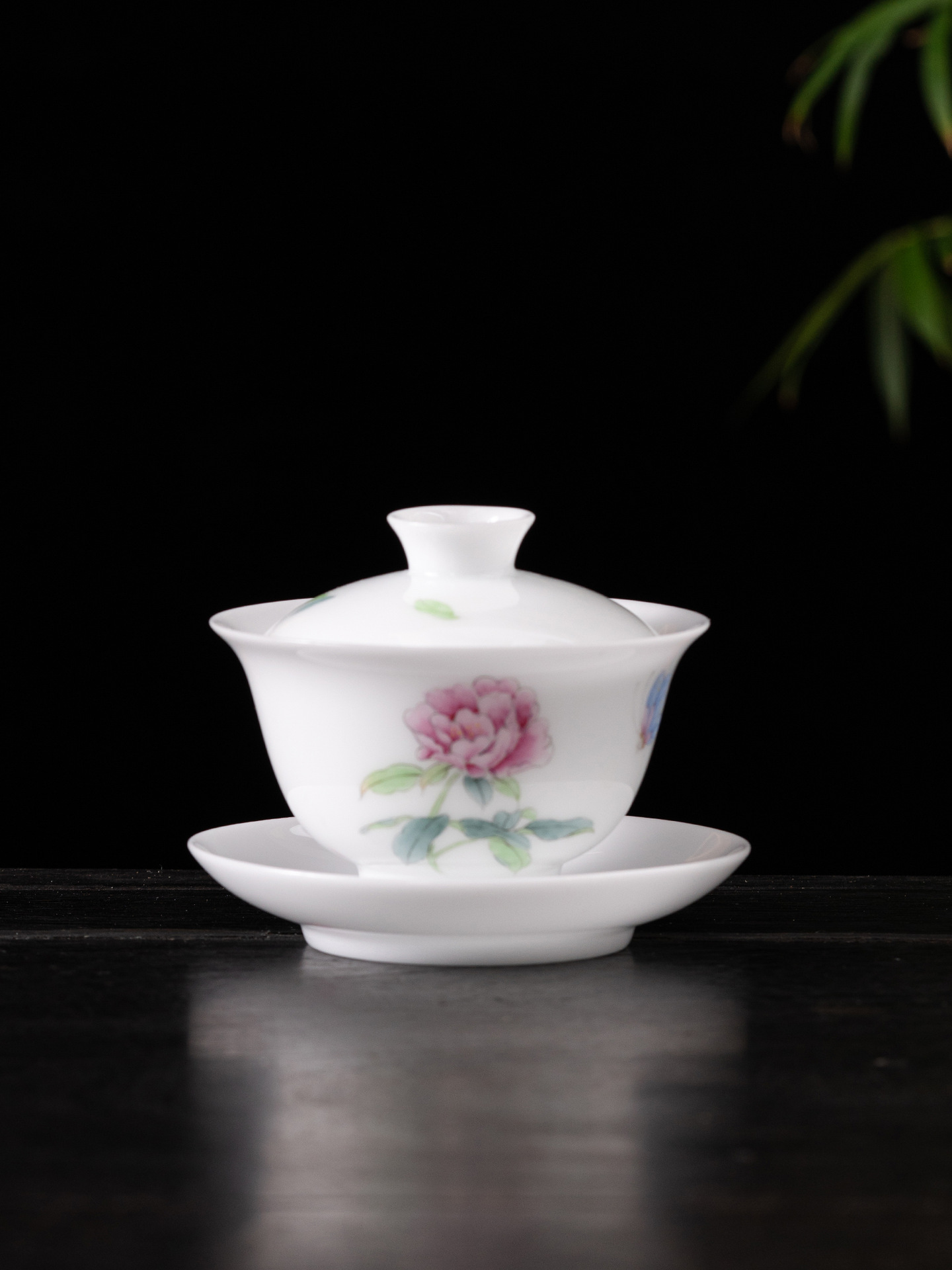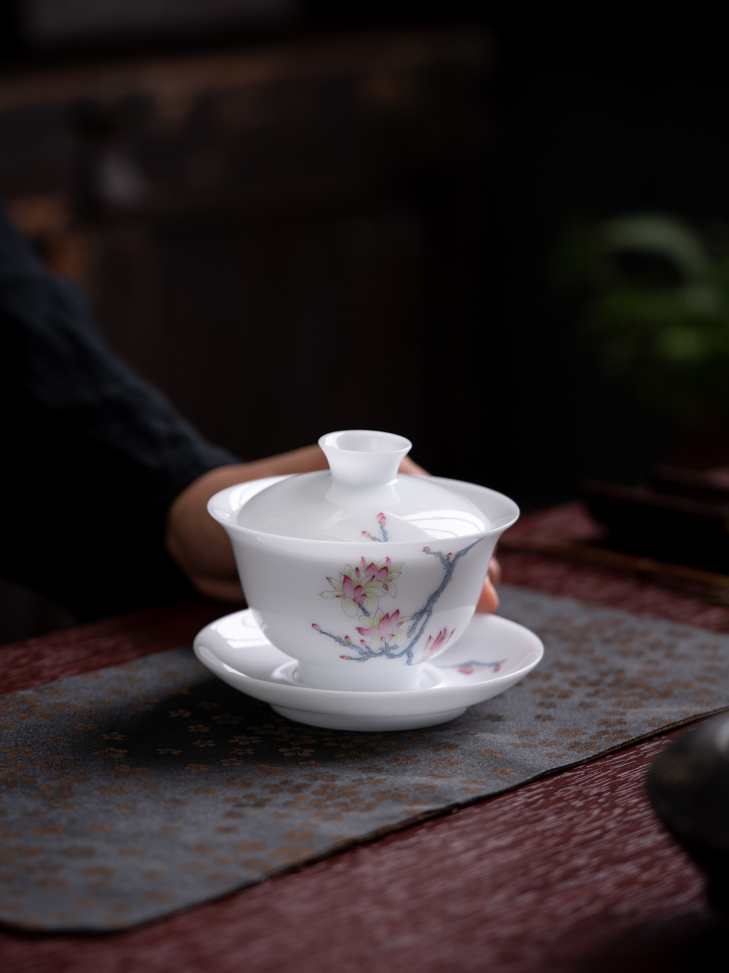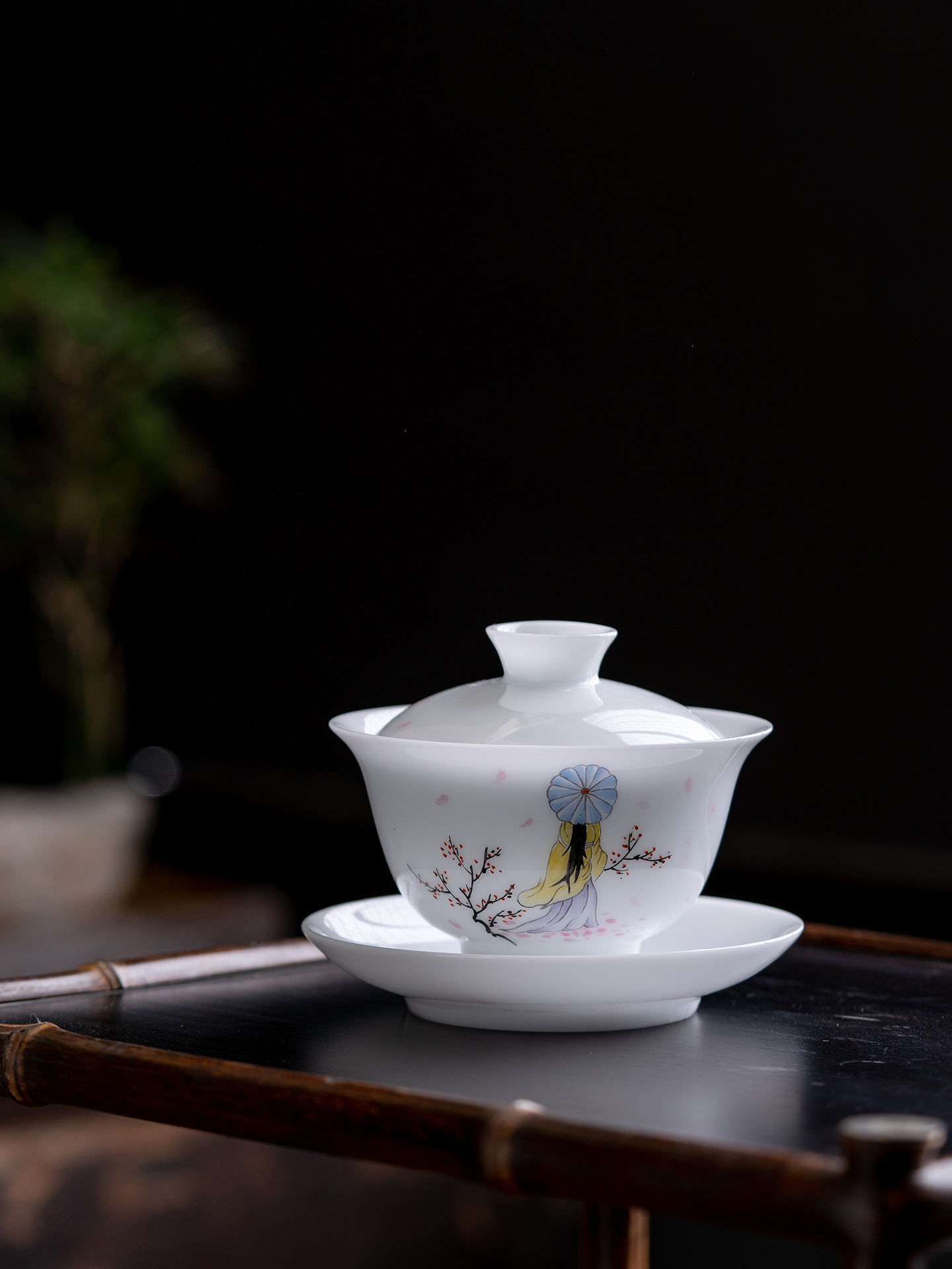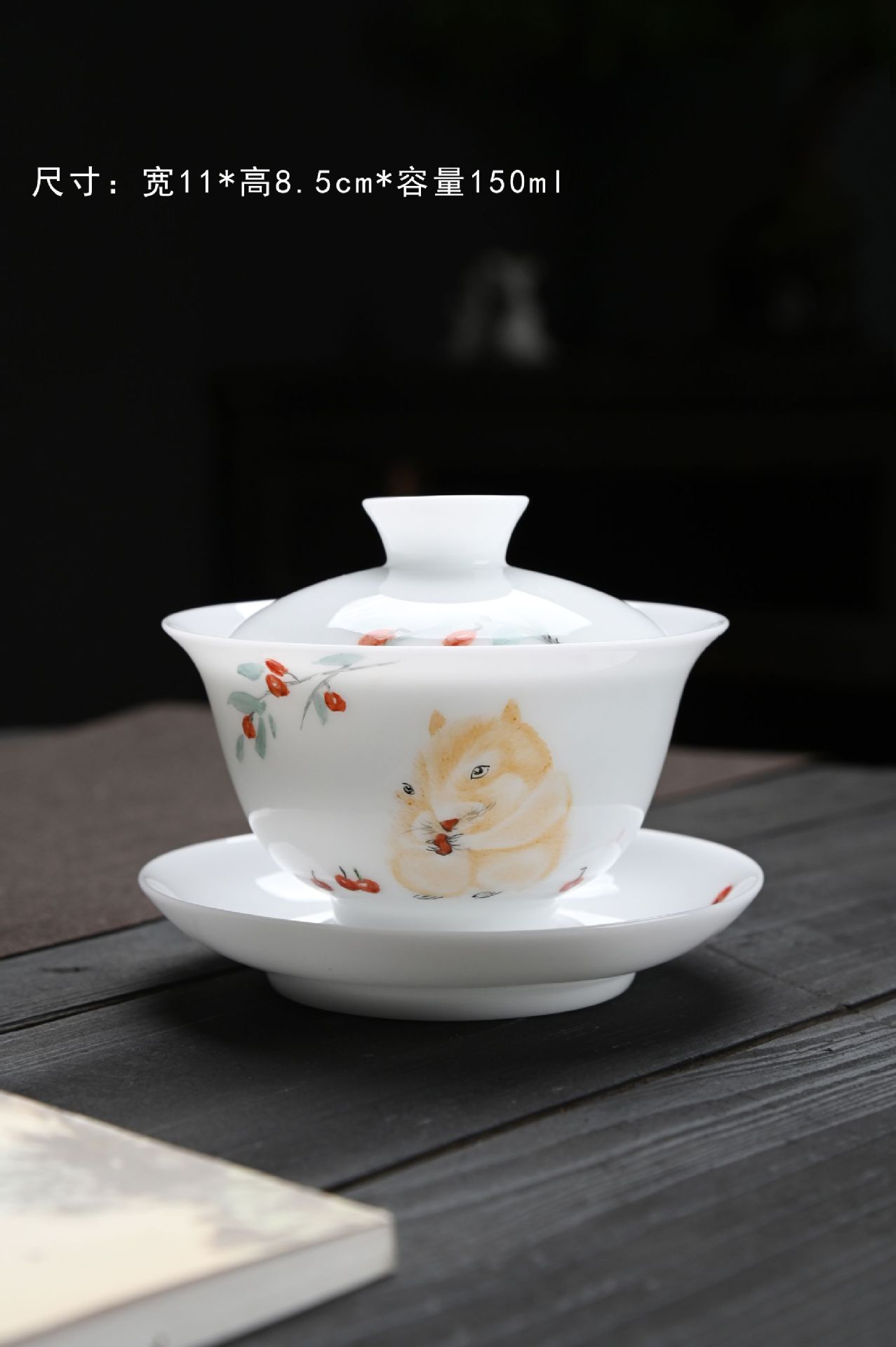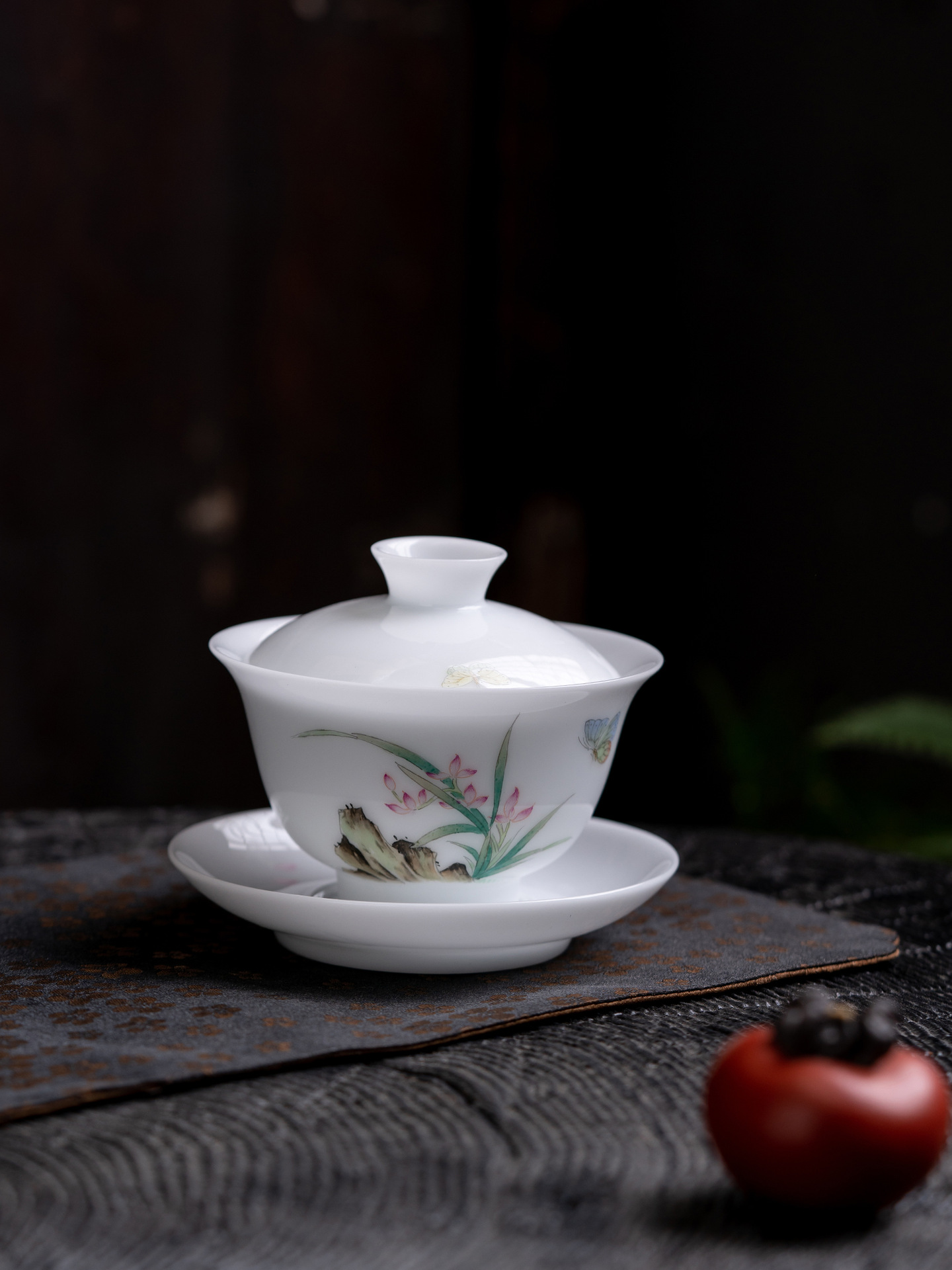 冰种玉瓷单个羊脂玉不烫手三才盖碗茶杯手绘茶碗整套套装带盖
