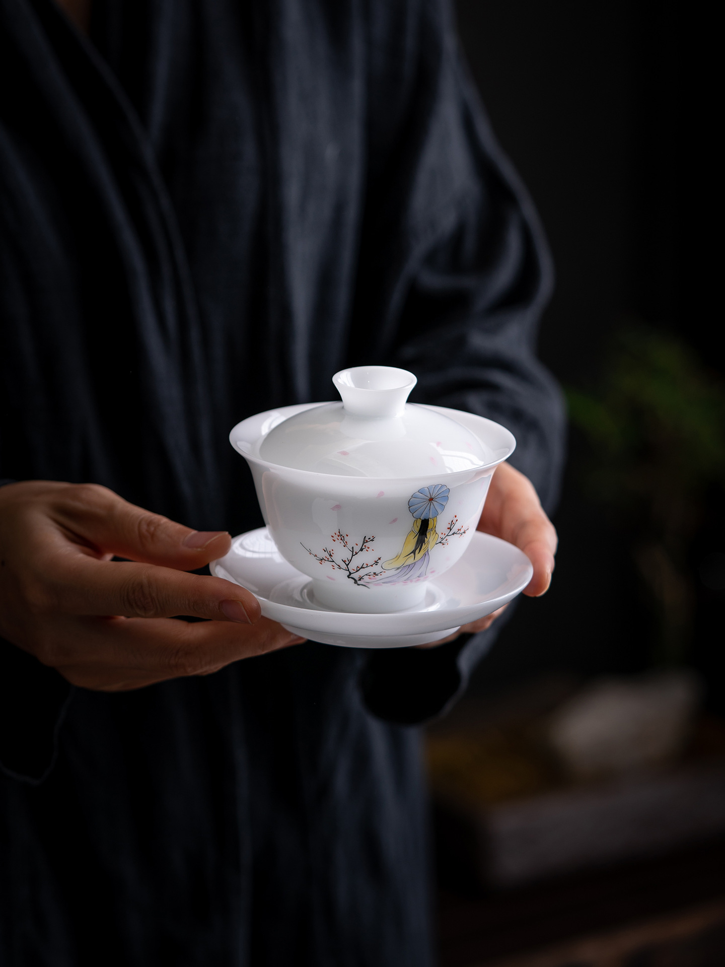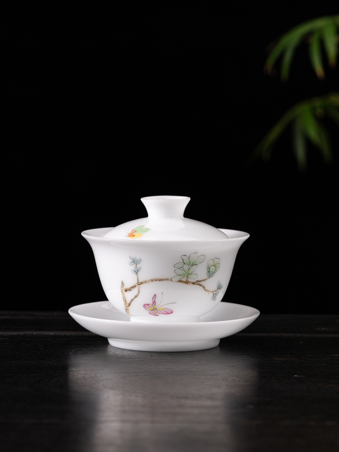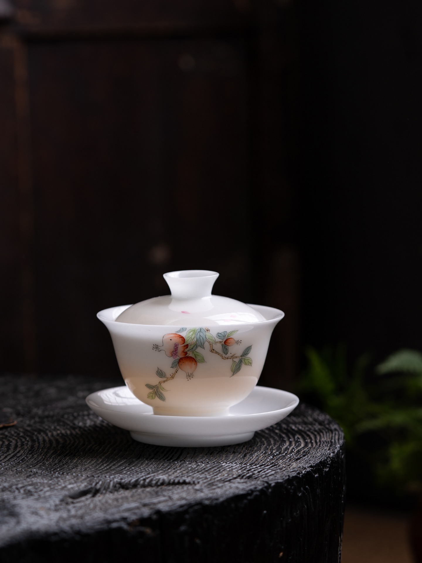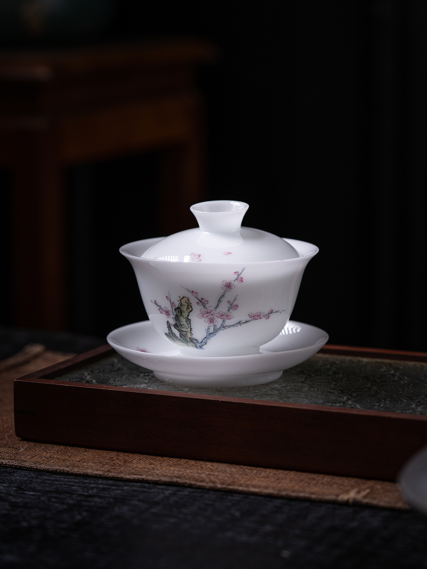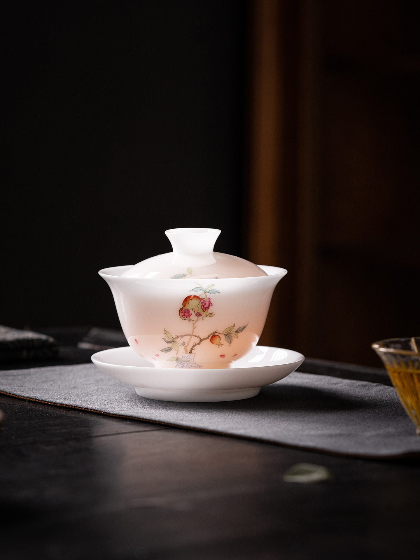 冰种玉瓷单个羊脂玉不烫手三才盖碗茶杯手绘茶碗整套套装带盖
