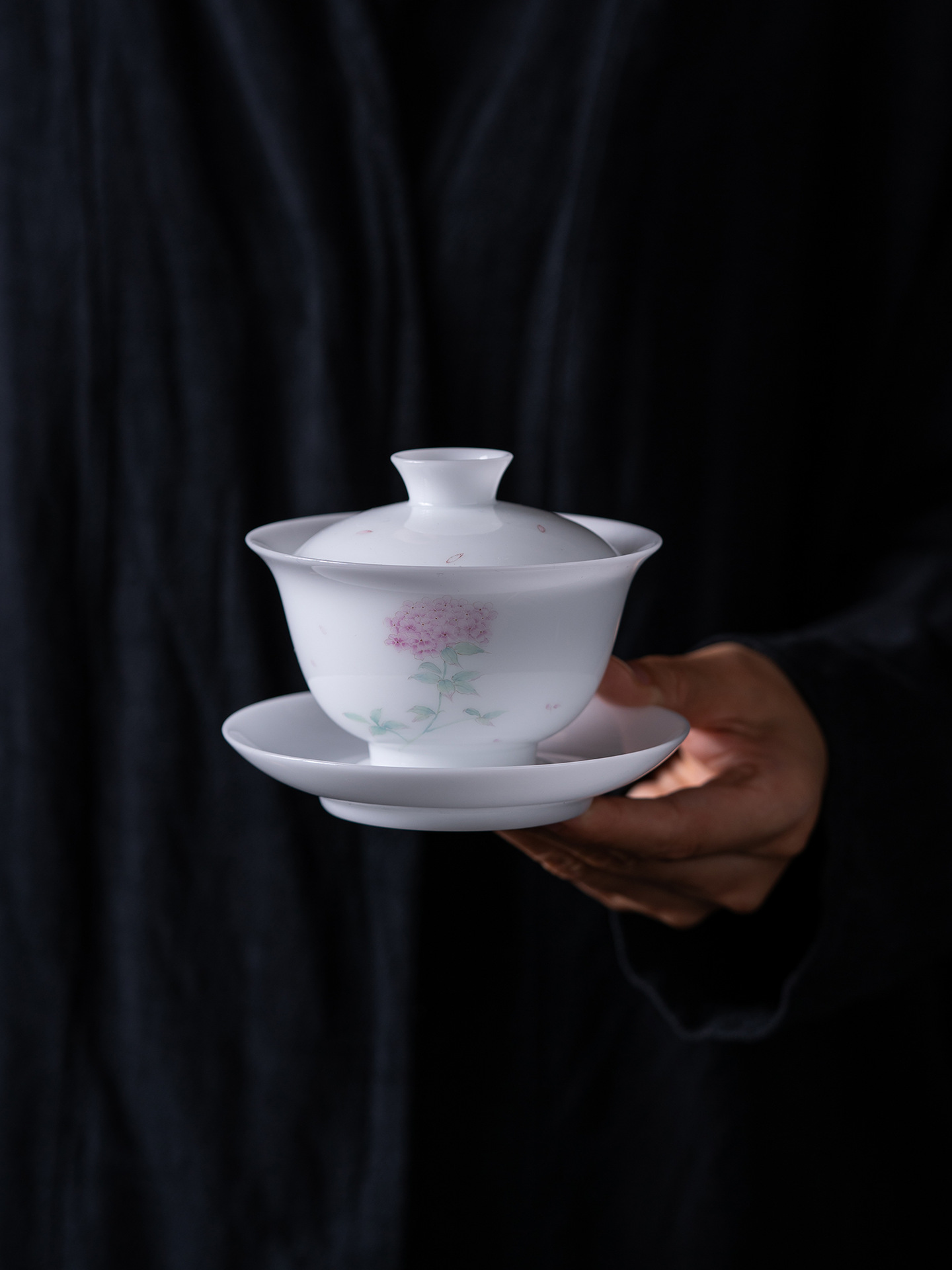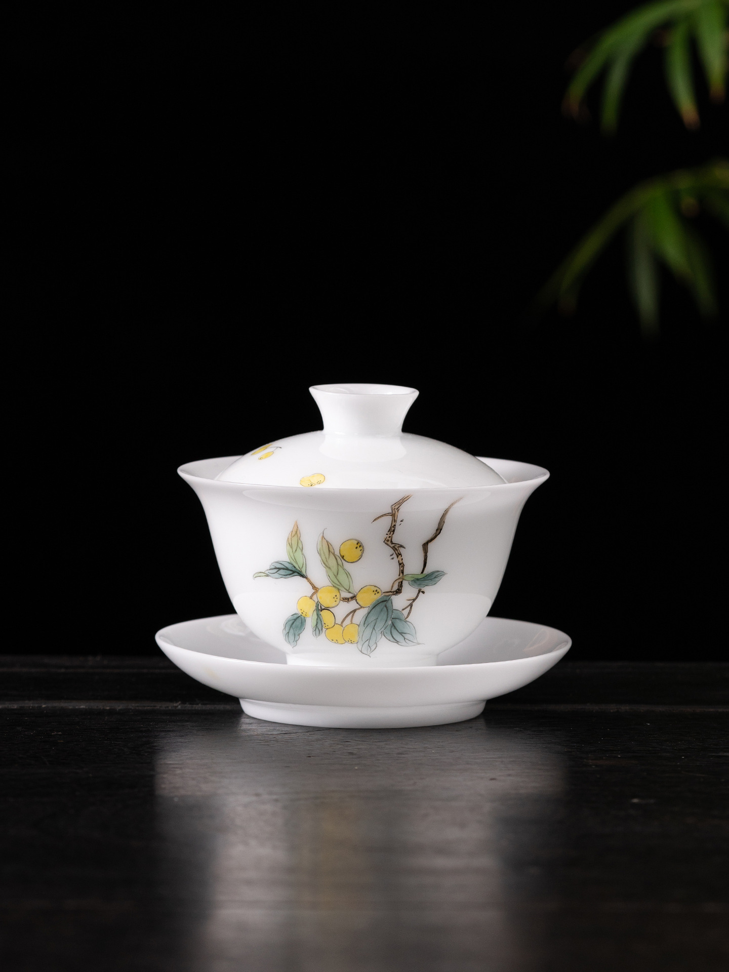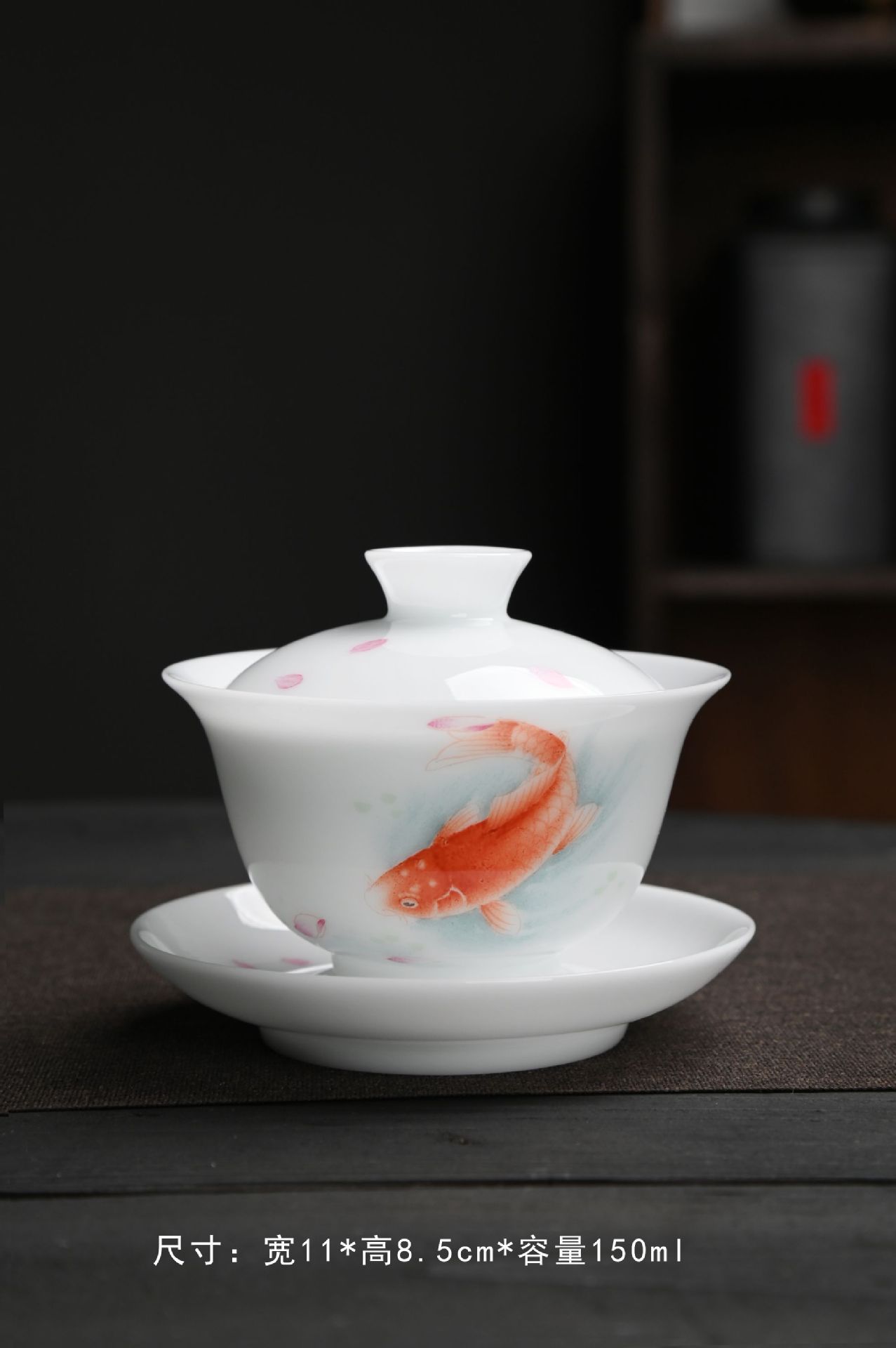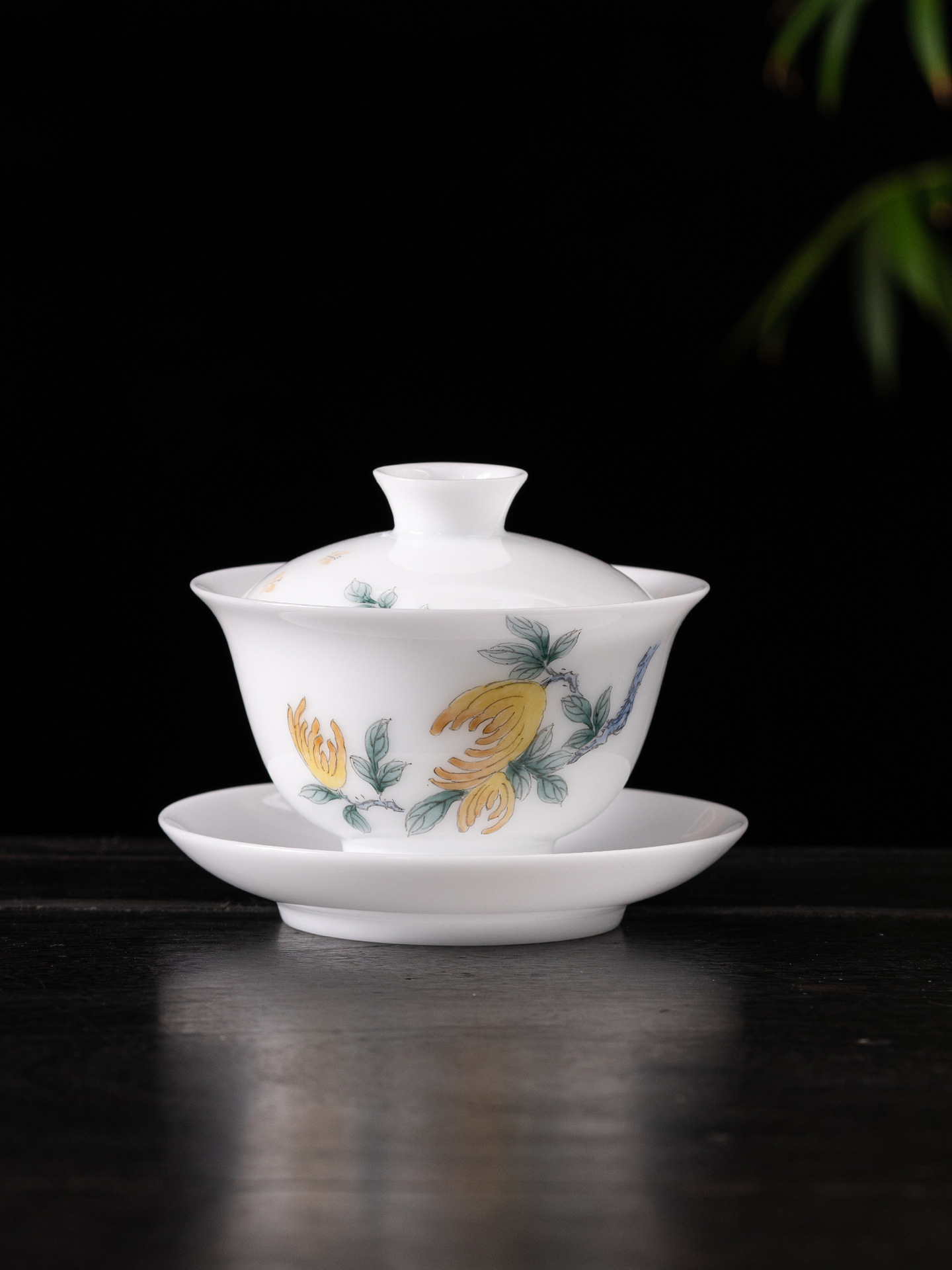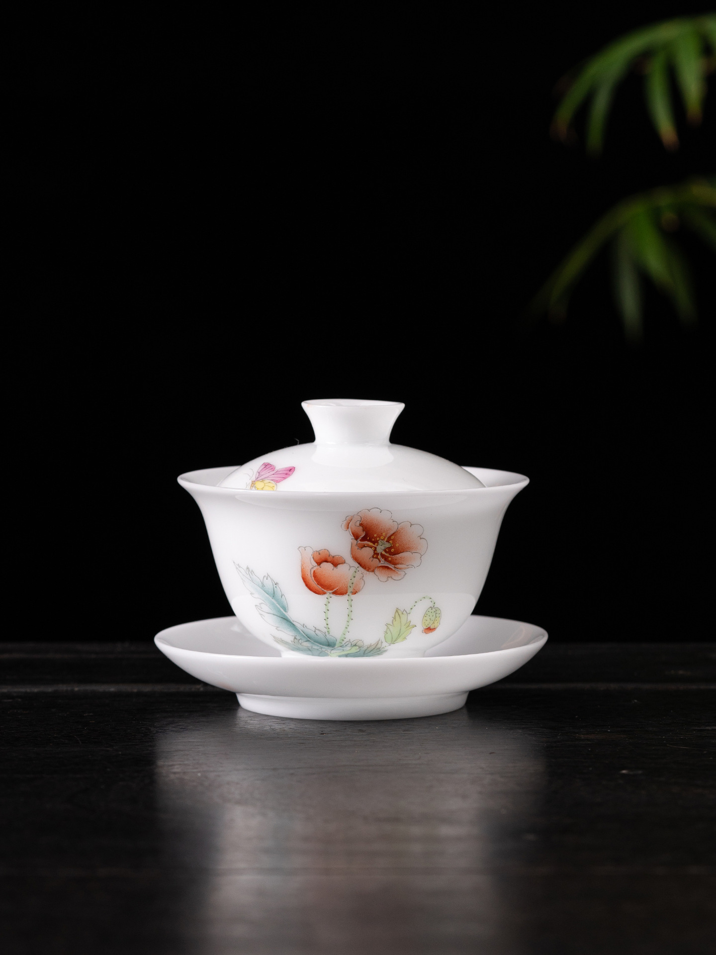 冰种玉瓷单个羊脂玉不烫手三才盖碗茶杯手绘茶碗整套套装带盖