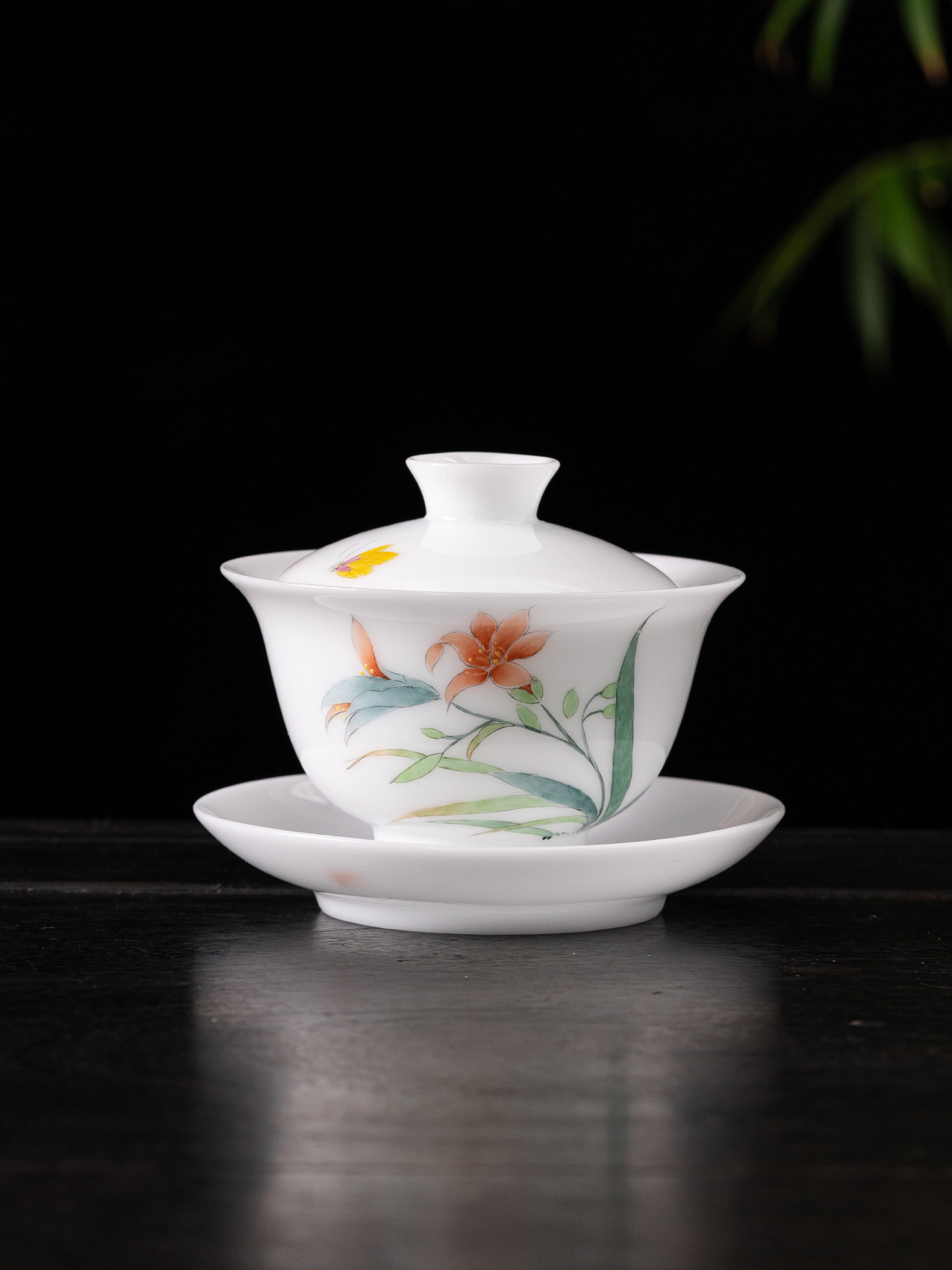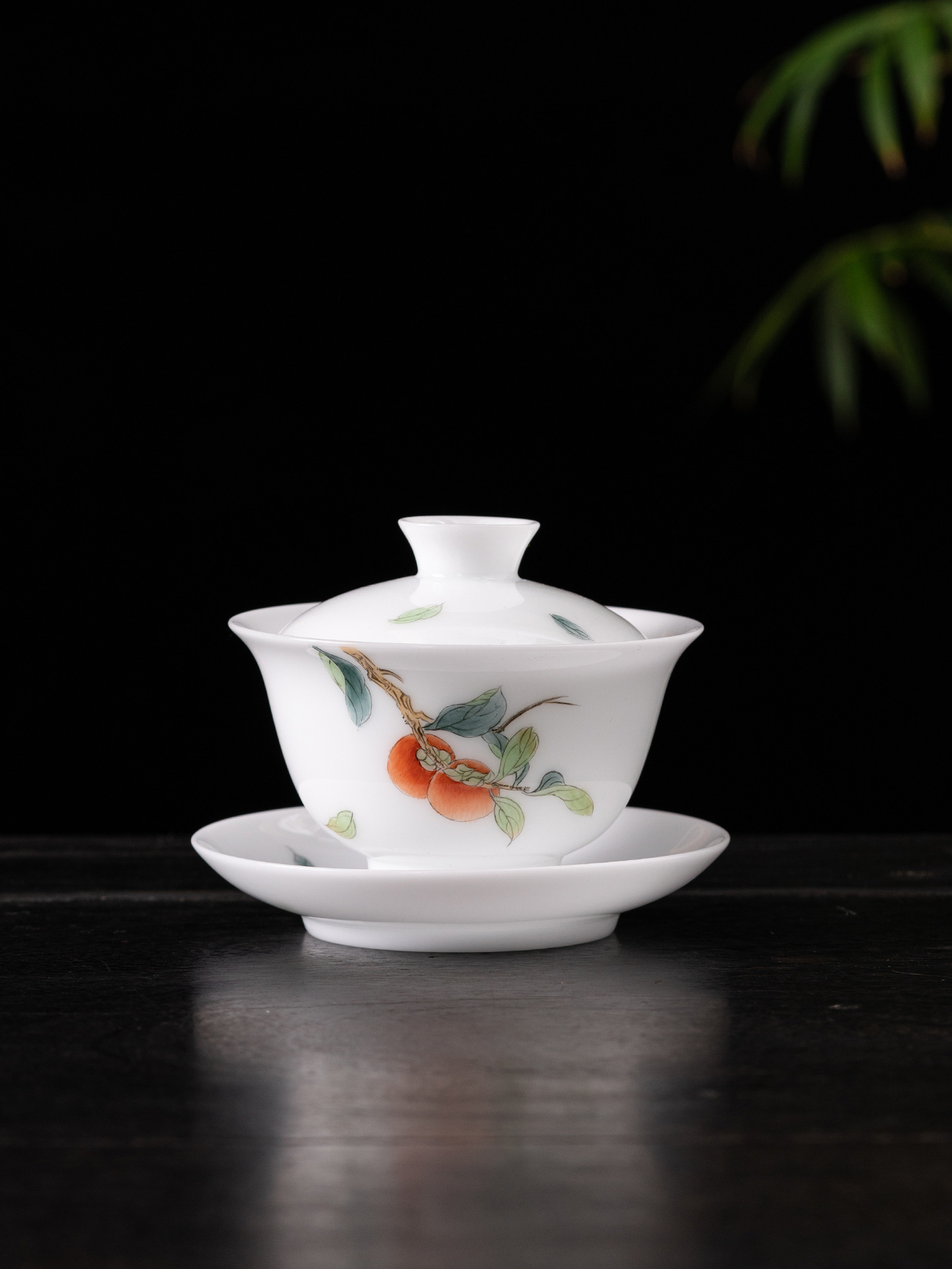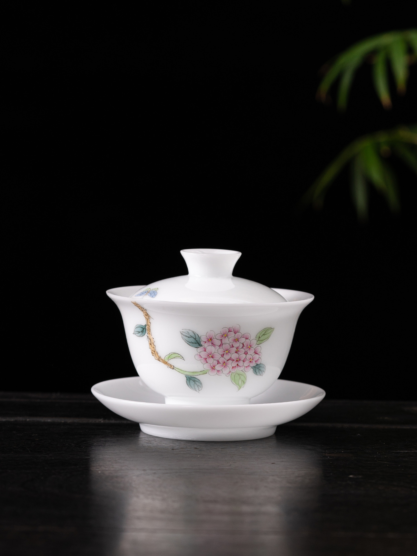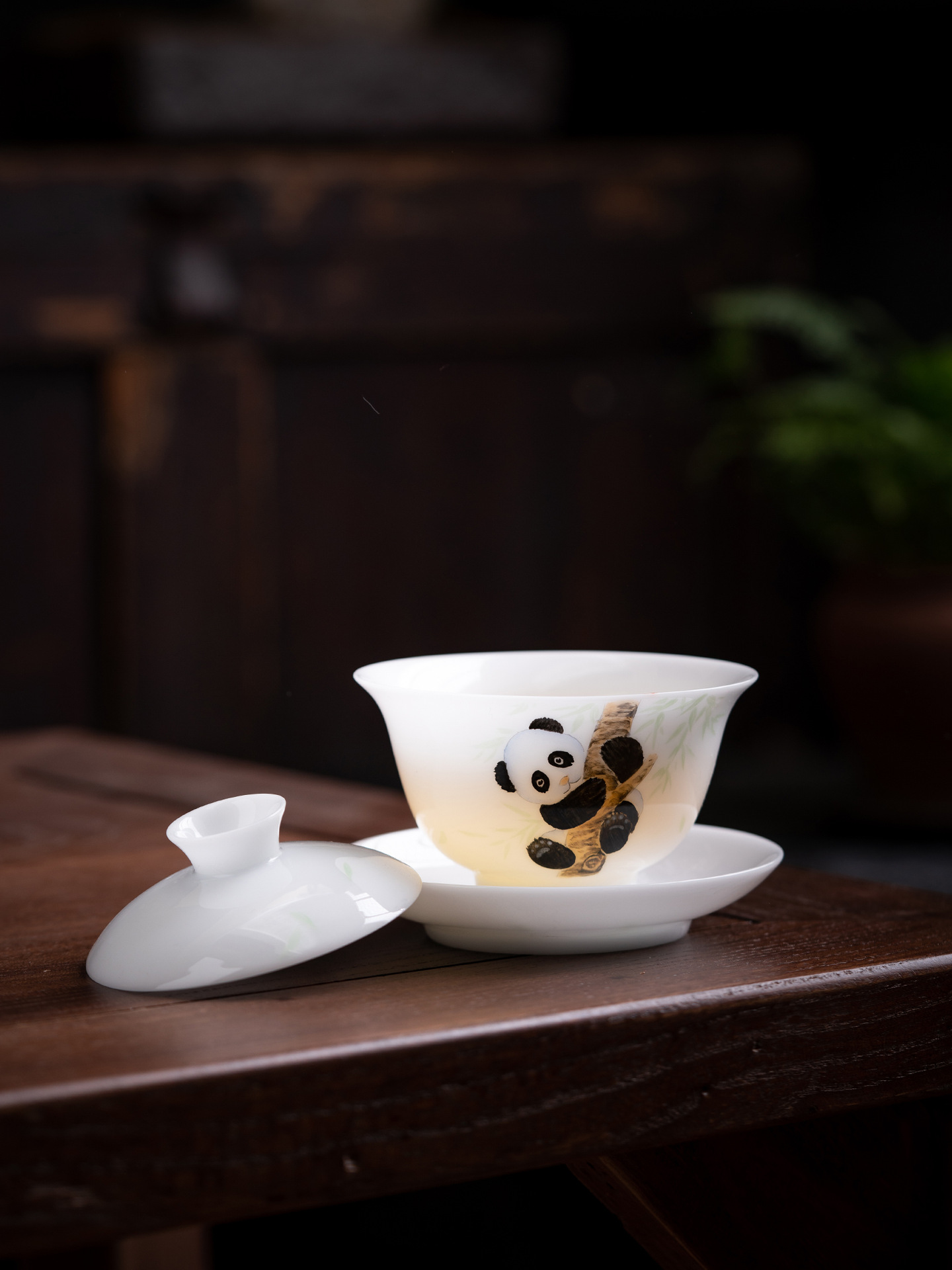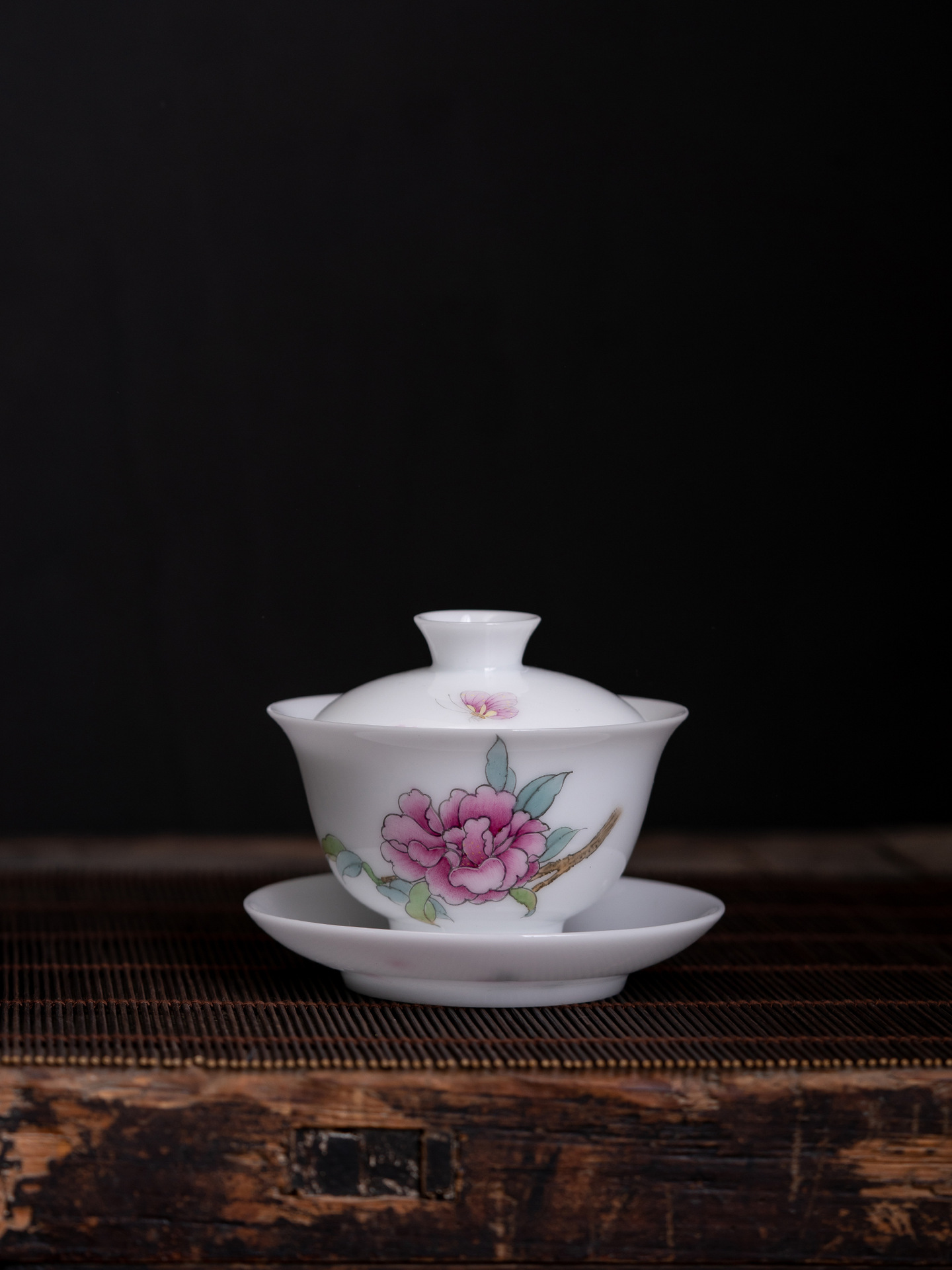冰种玉瓷单个羊脂玉不烫手三才盖碗茶杯手绘茶碗整套套装带盖