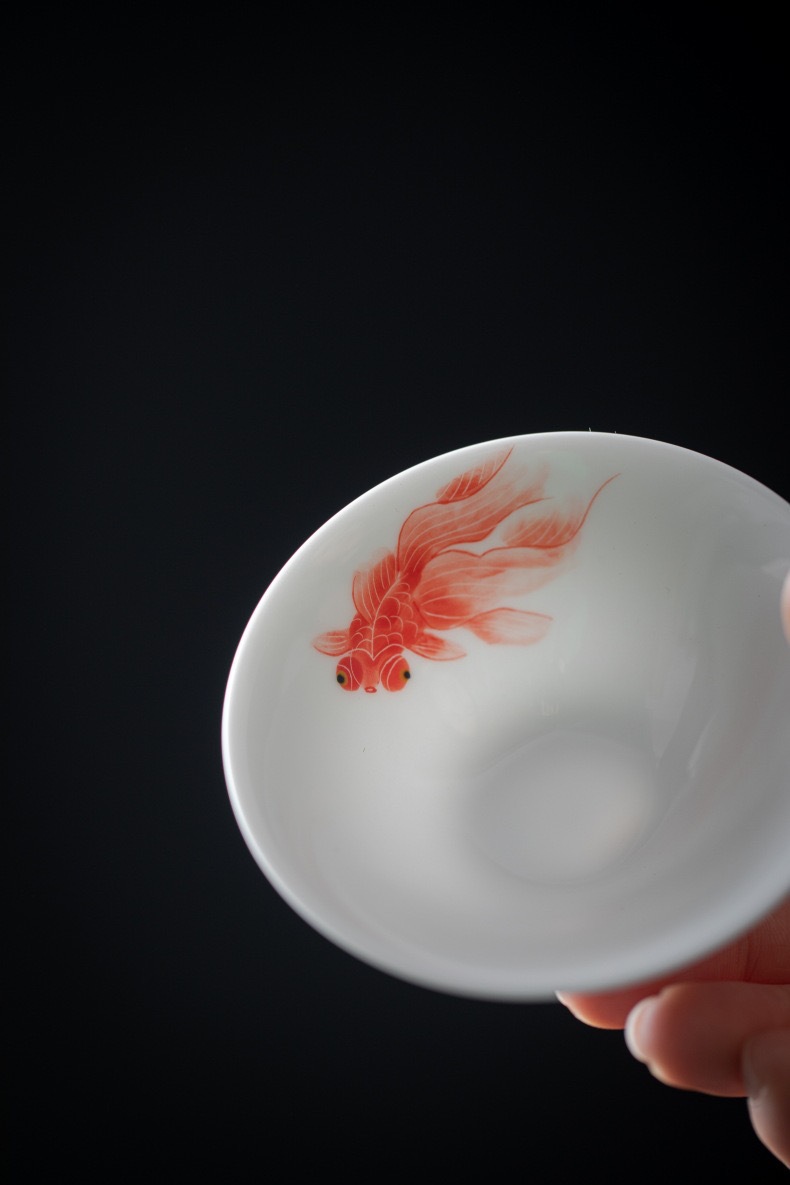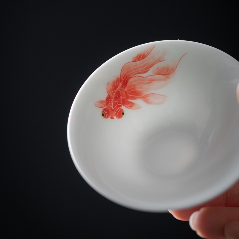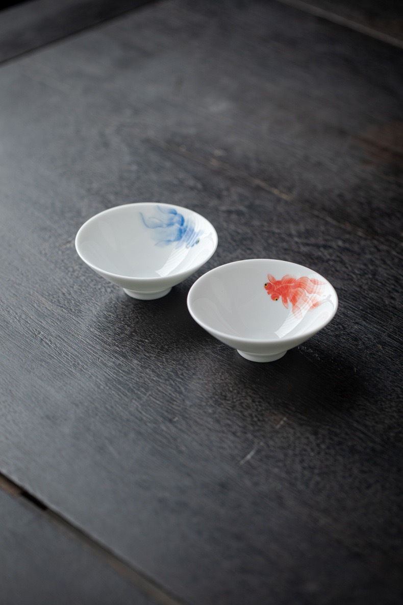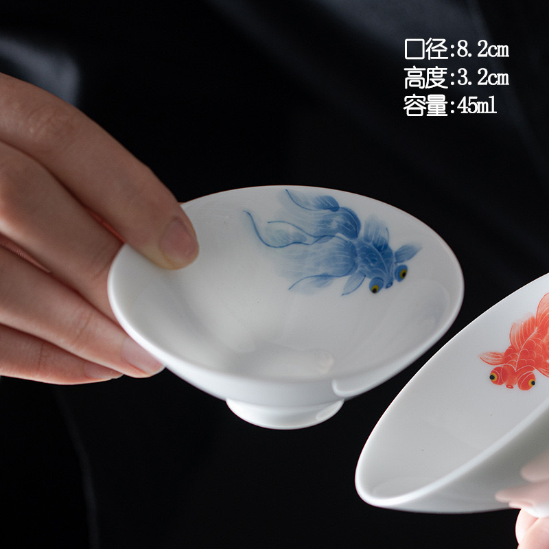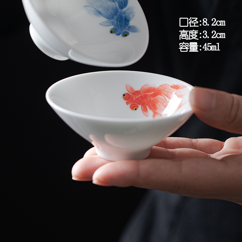 陶瓷茶杯功夫茶小杯手绘金鱼斗笠杯对杯釉下彩主人杯品茗杯小茶杯