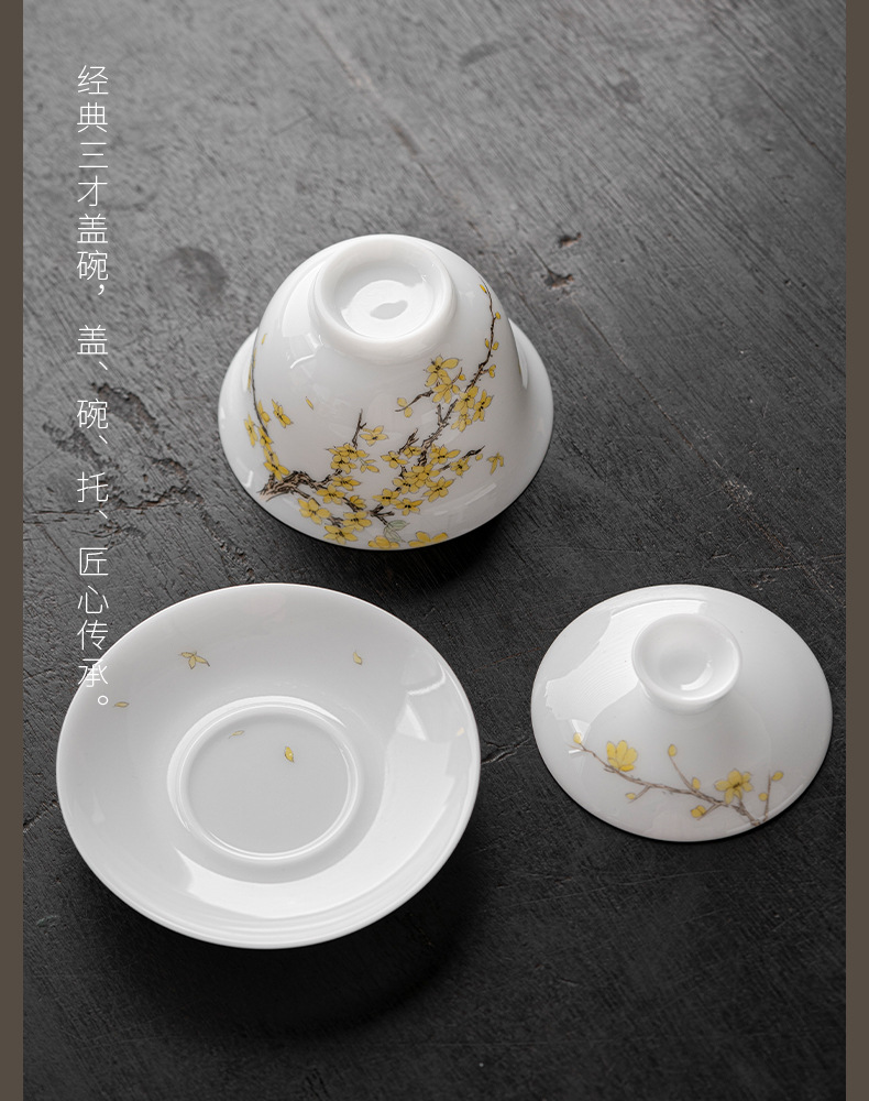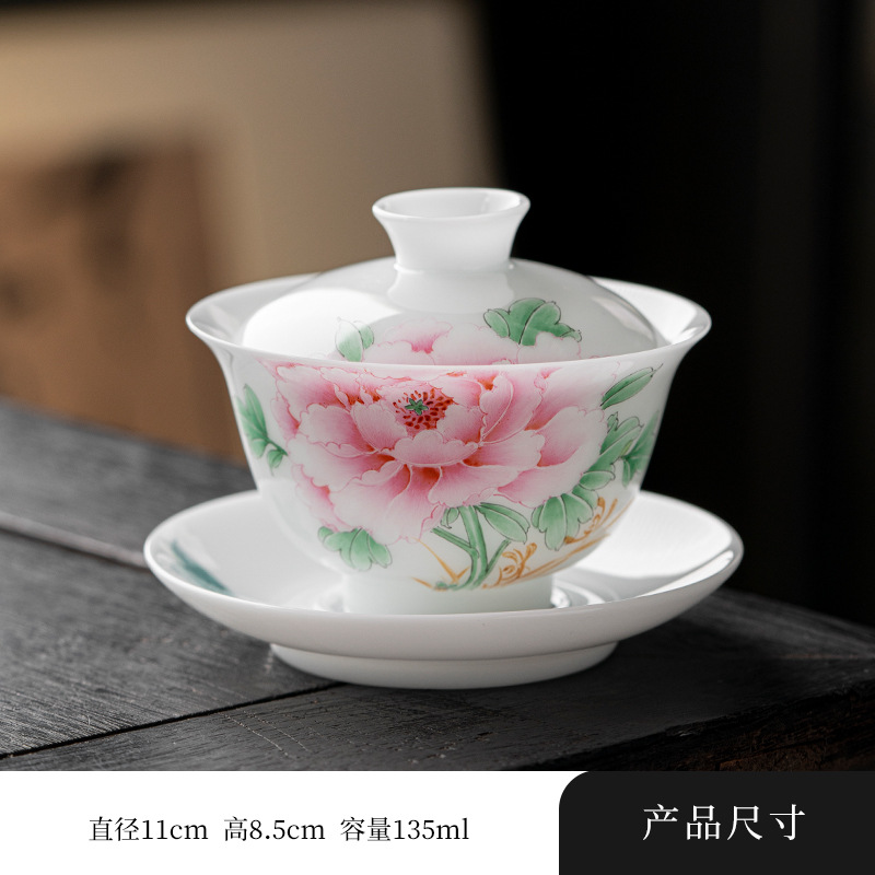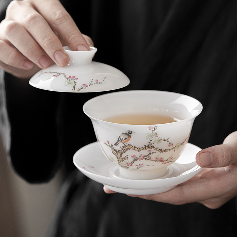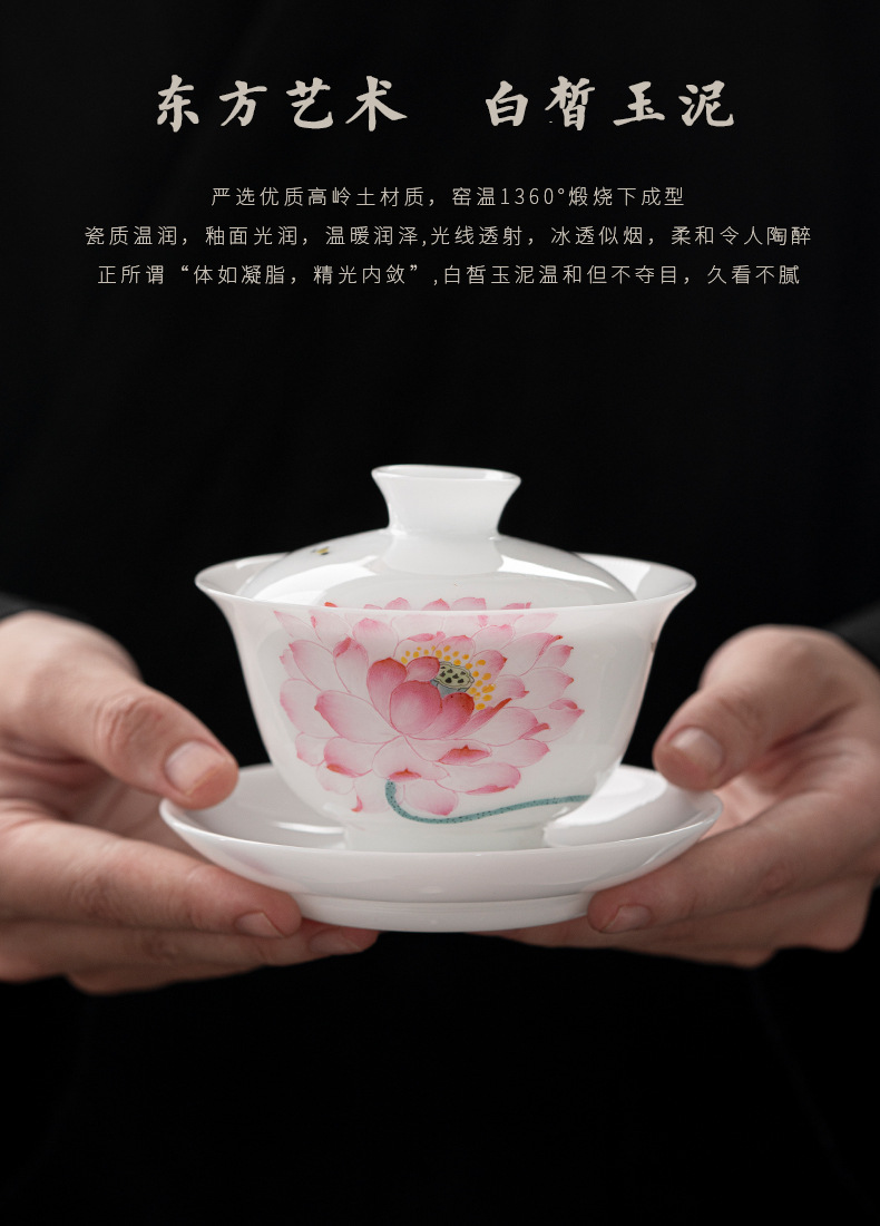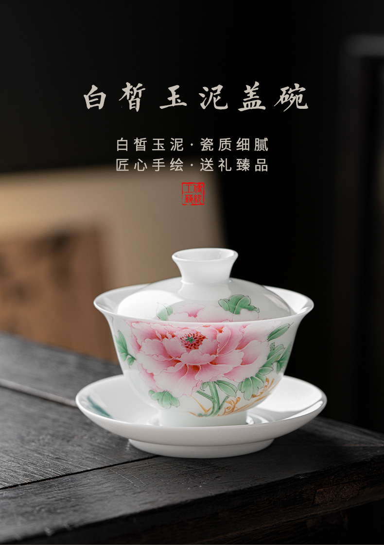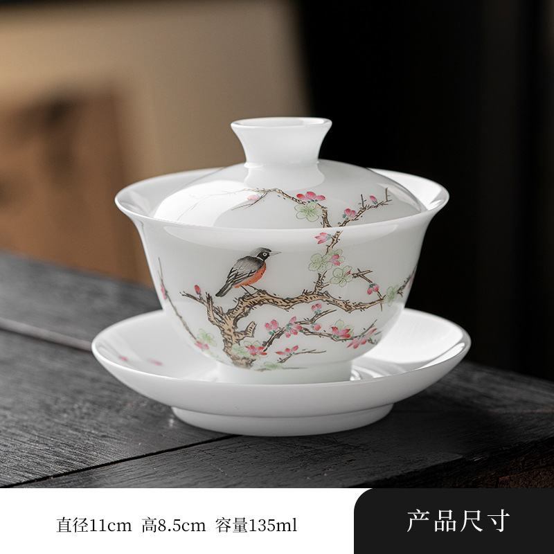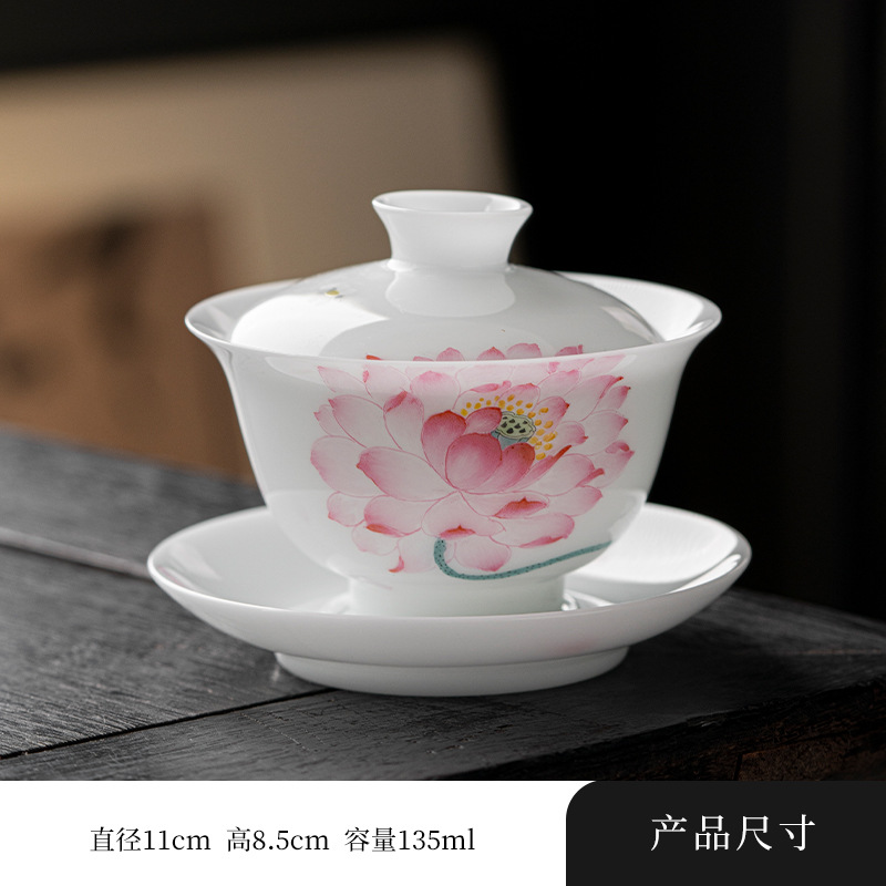 国风手绘白皙玉泥三才盖碗带盖 茶杯茶盏 陶瓷功夫茶具泡茶碗单个