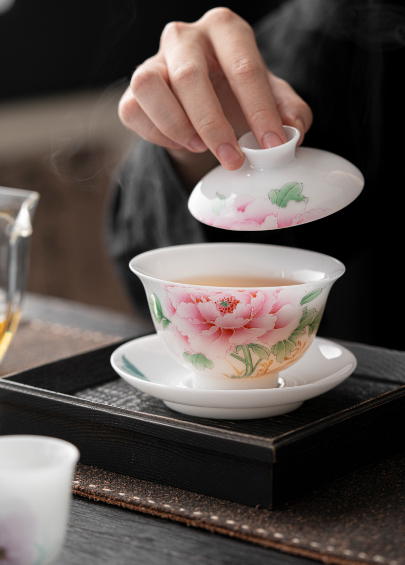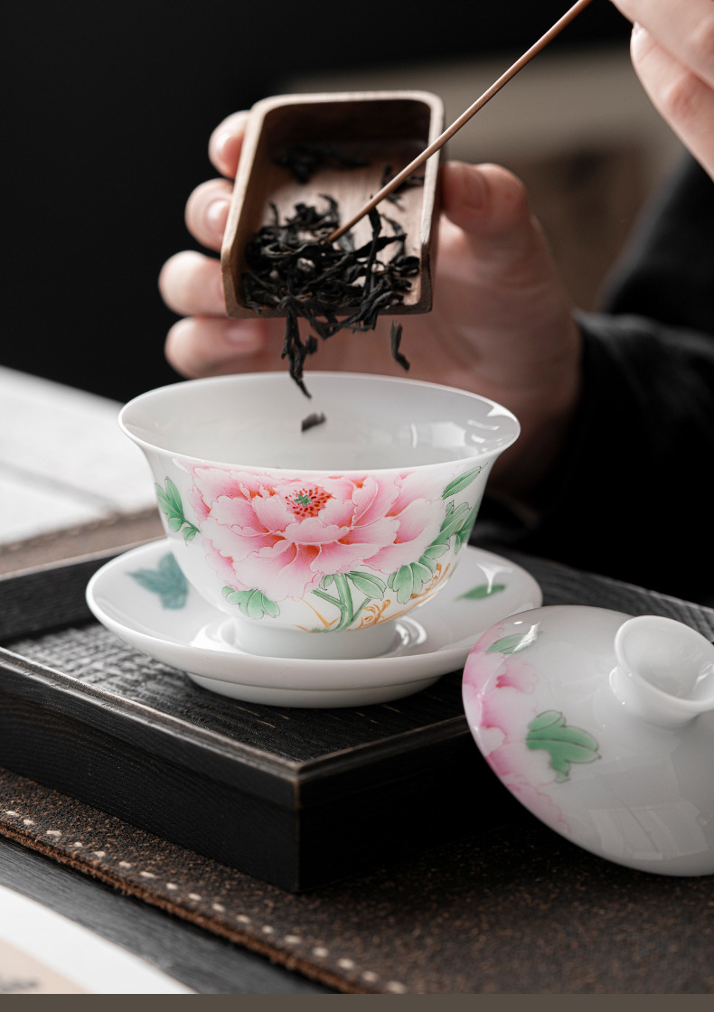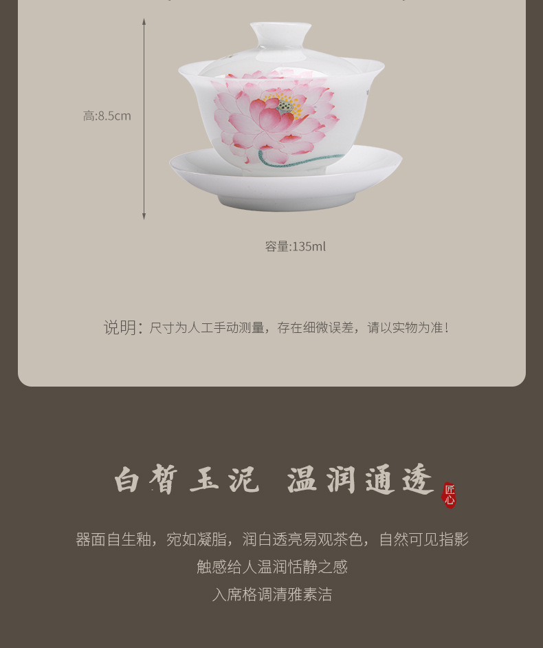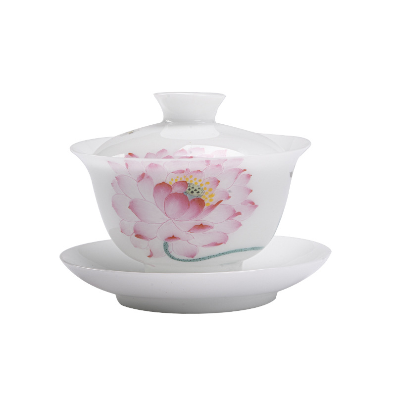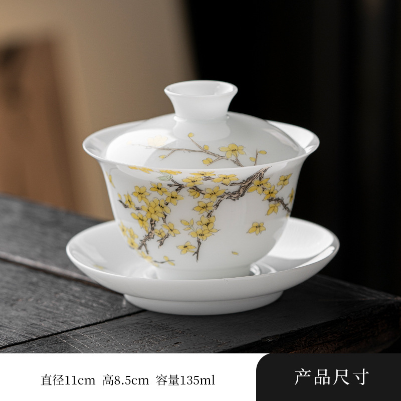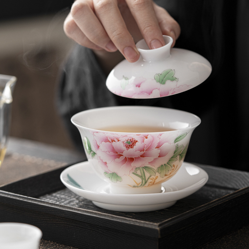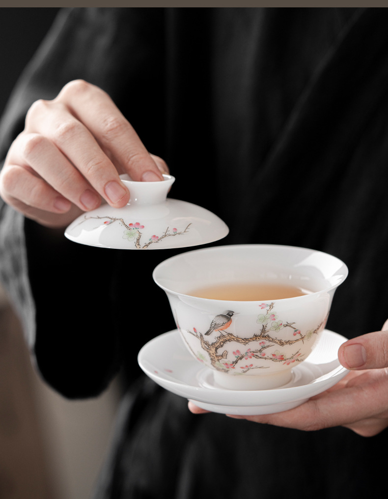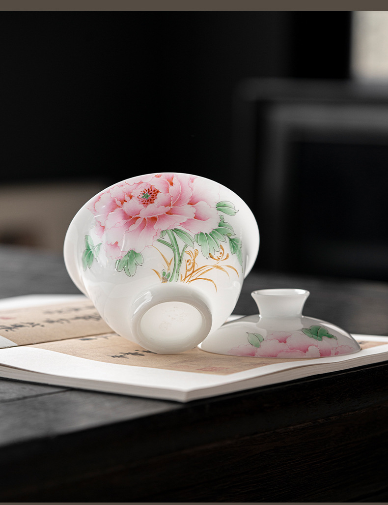 国风手绘白皙玉泥三才盖碗带盖 茶杯茶盏 陶瓷功夫茶具泡茶碗单个