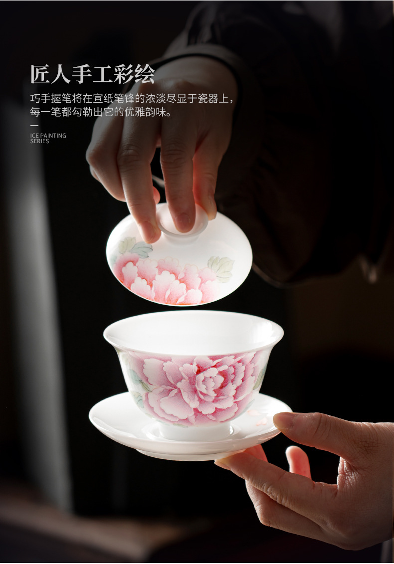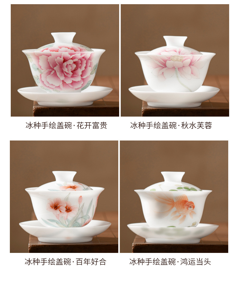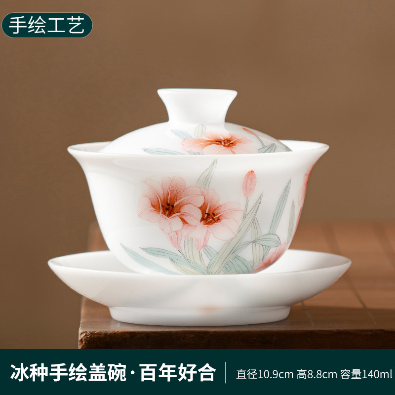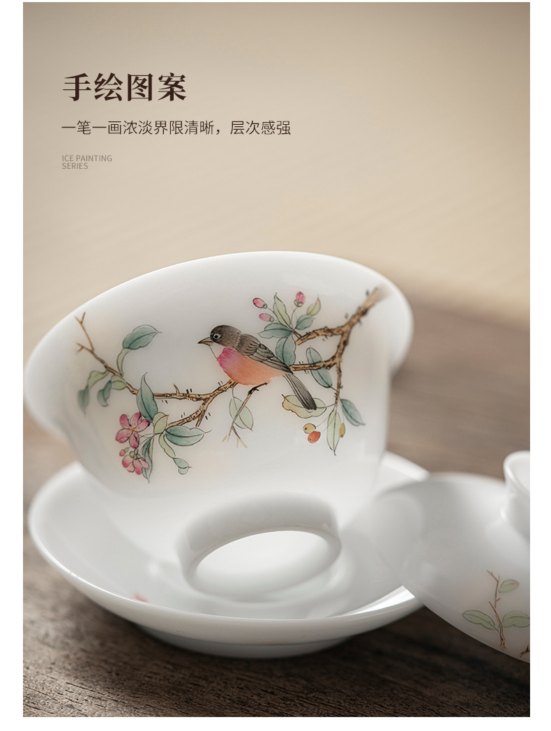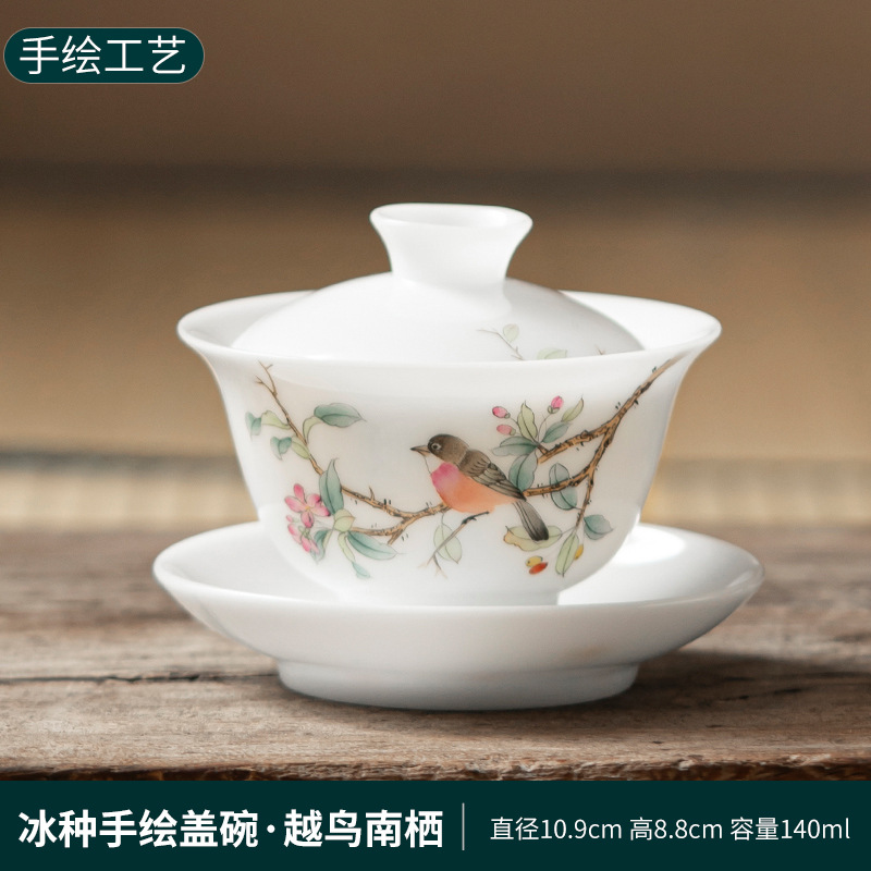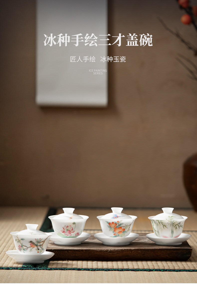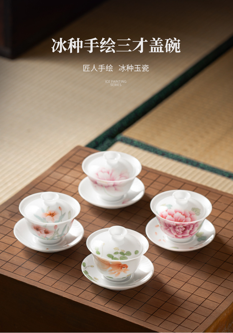 国风手绘冰种三才盖碗茶杯单个陶瓷不烫手盖碗三才茶盏泡茶碗高端