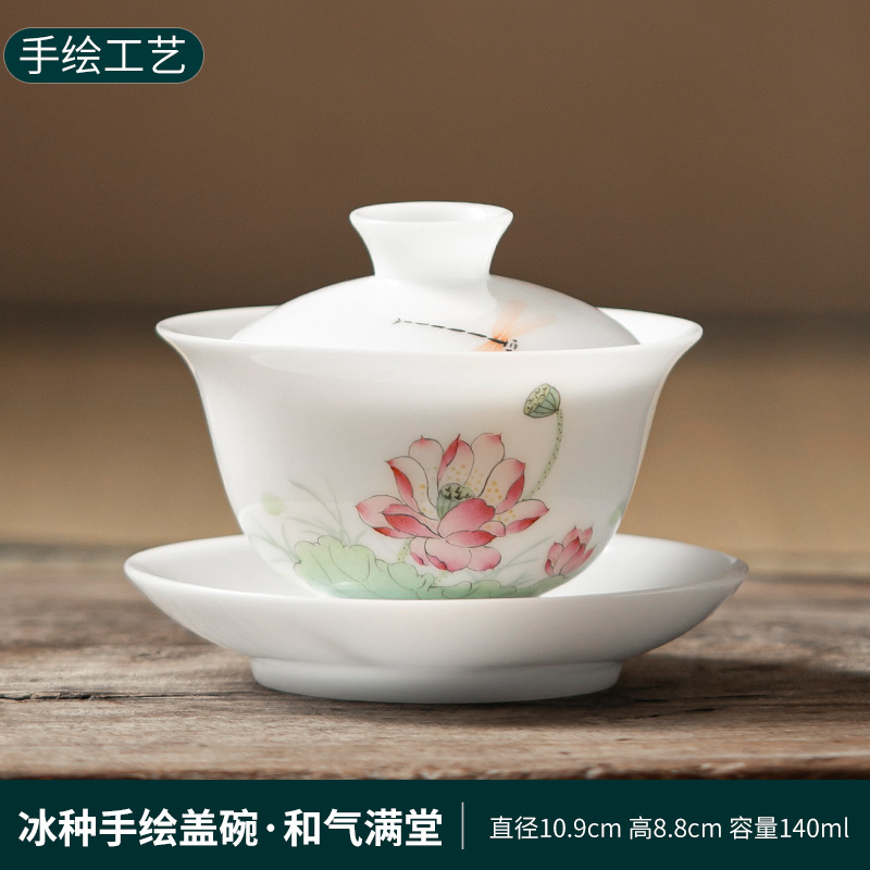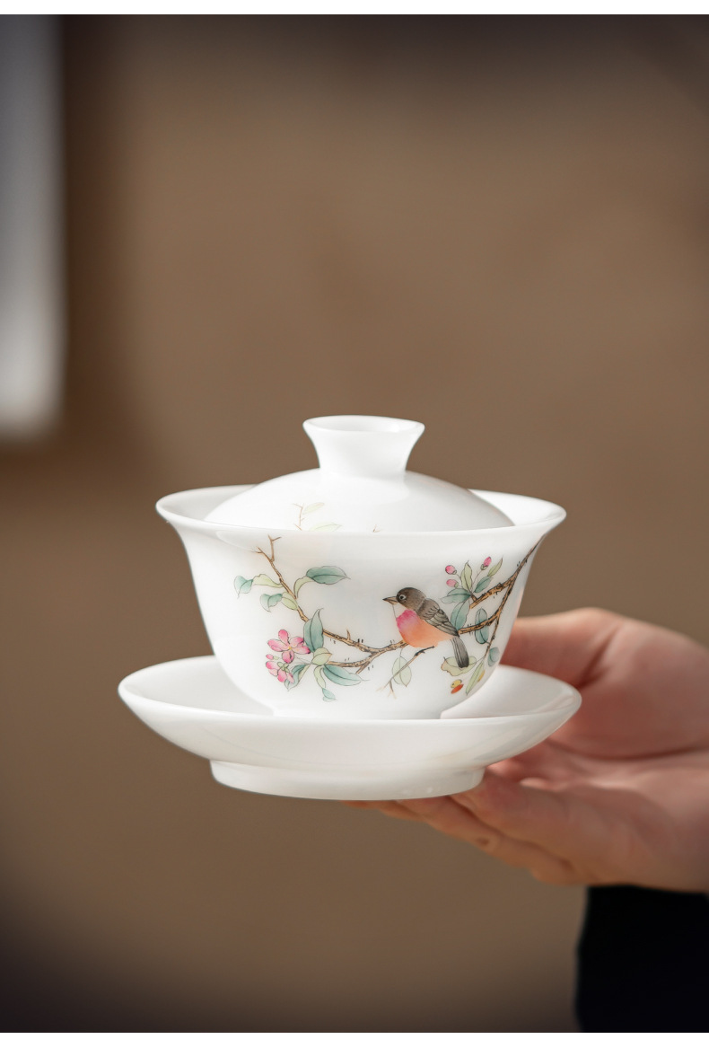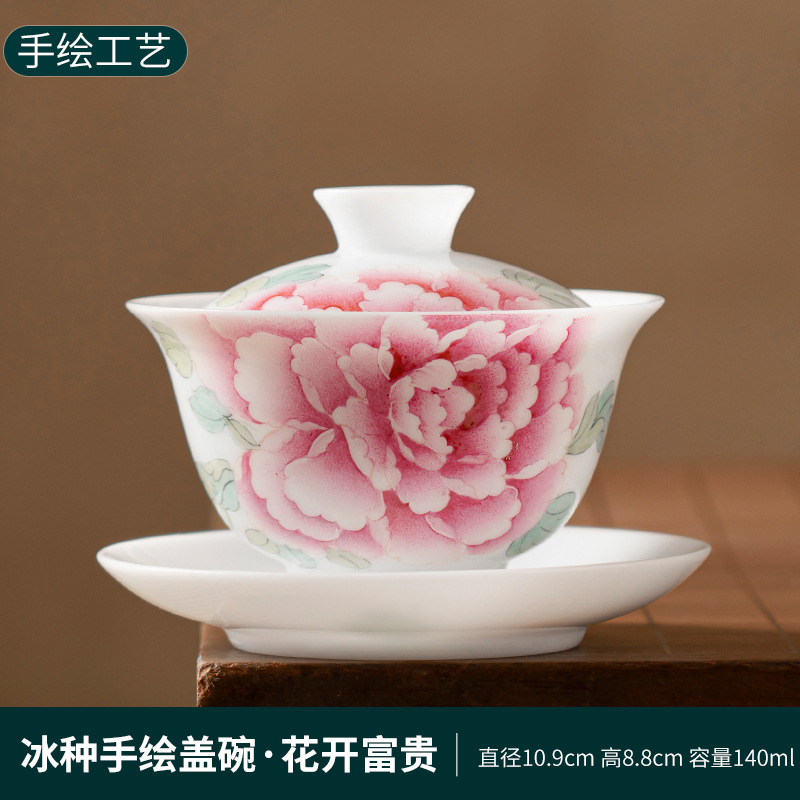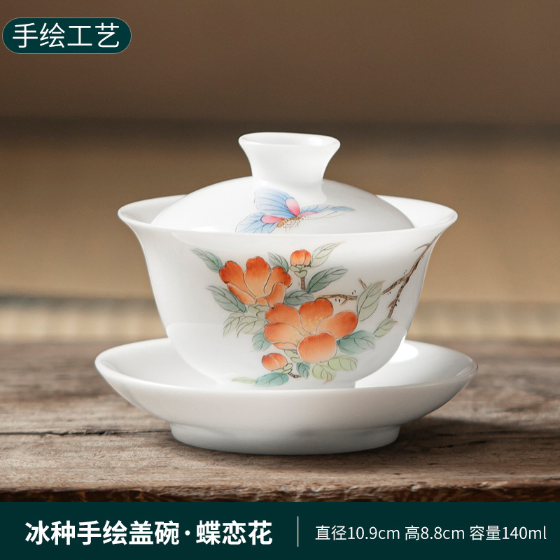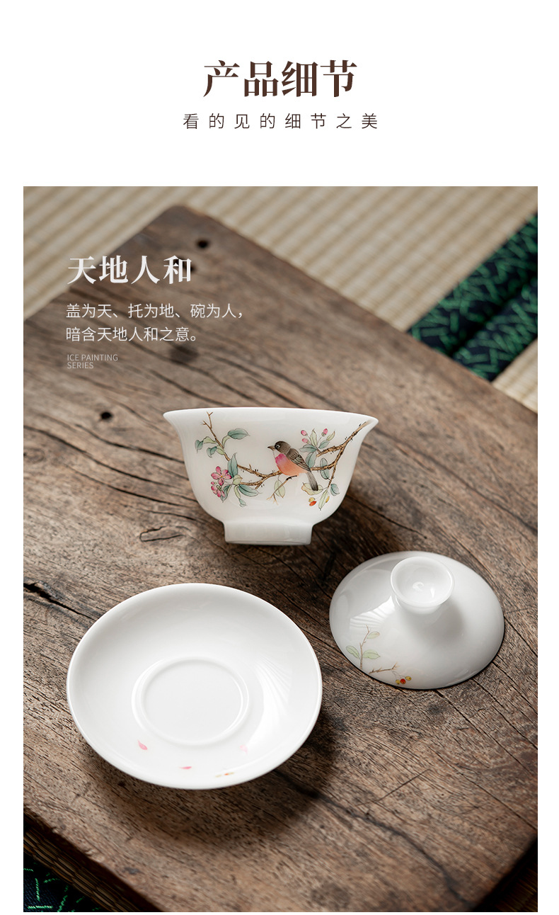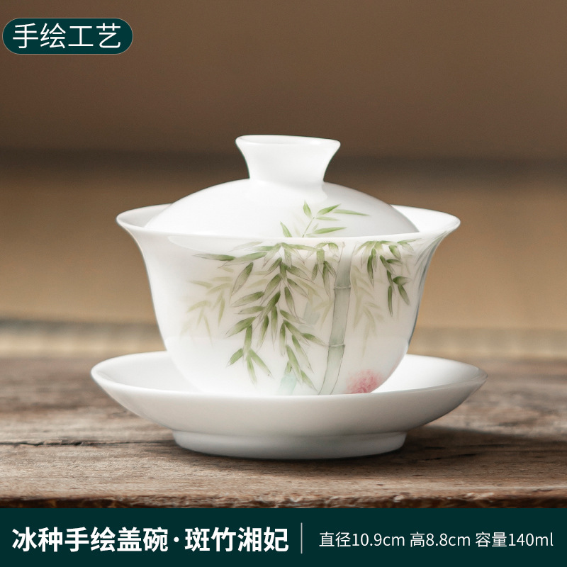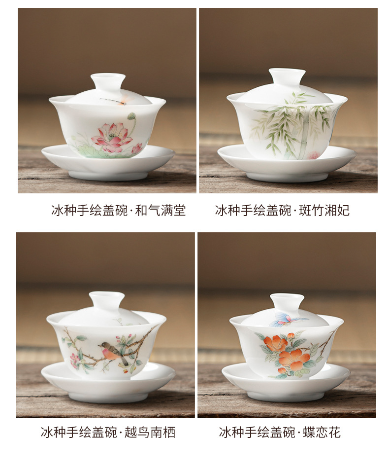 国风手绘冰种三才盖碗茶杯单个陶瓷不烫手盖碗三才茶盏泡茶碗高端