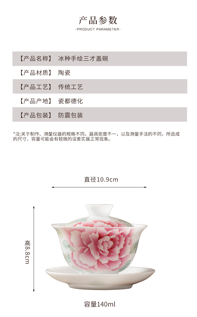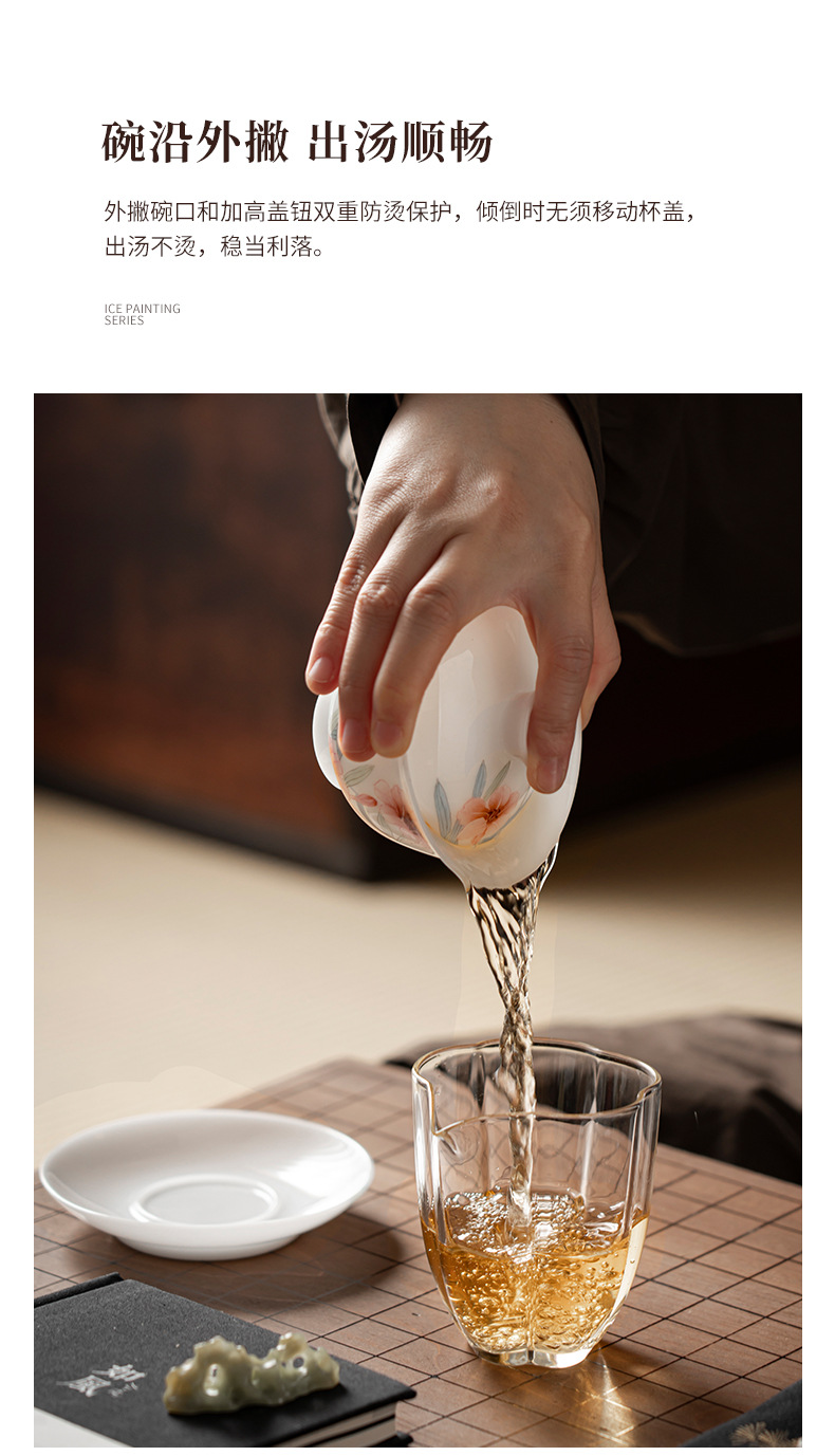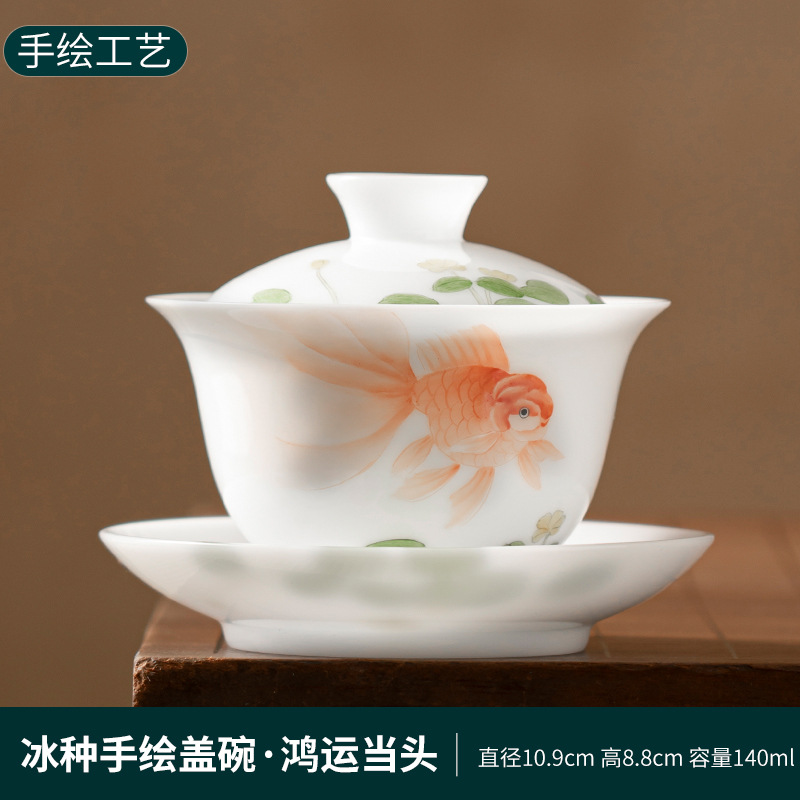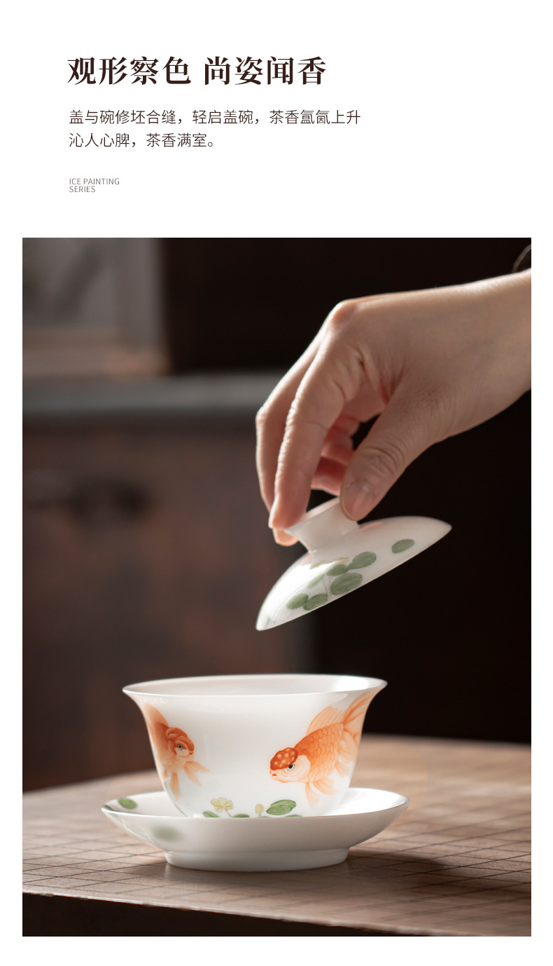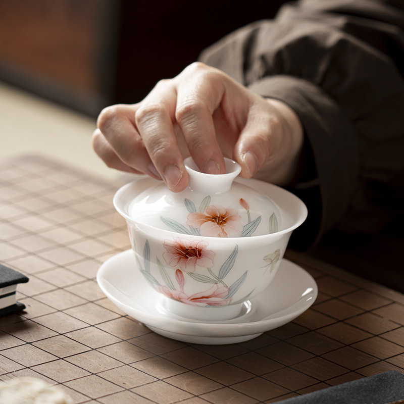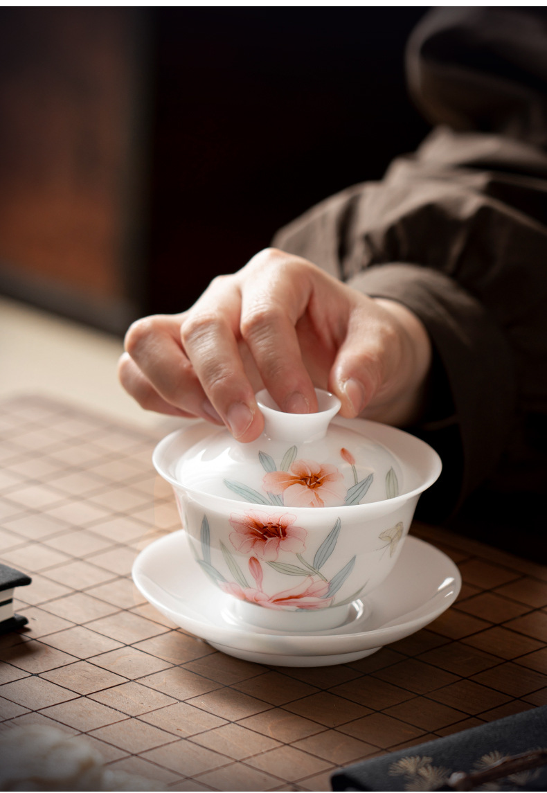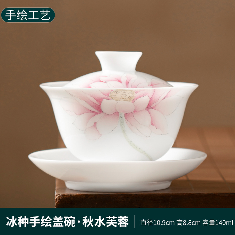 国风手绘冰种三才盖碗茶杯单个陶瓷不烫手盖碗三才茶盏泡茶碗高端