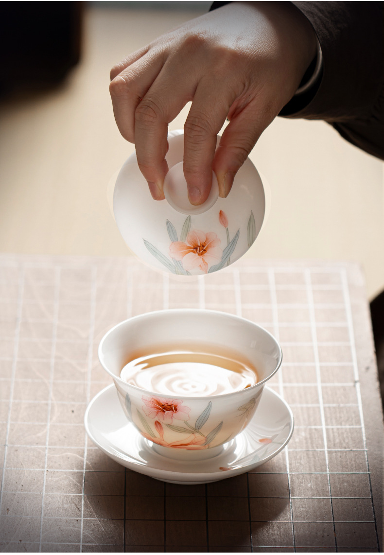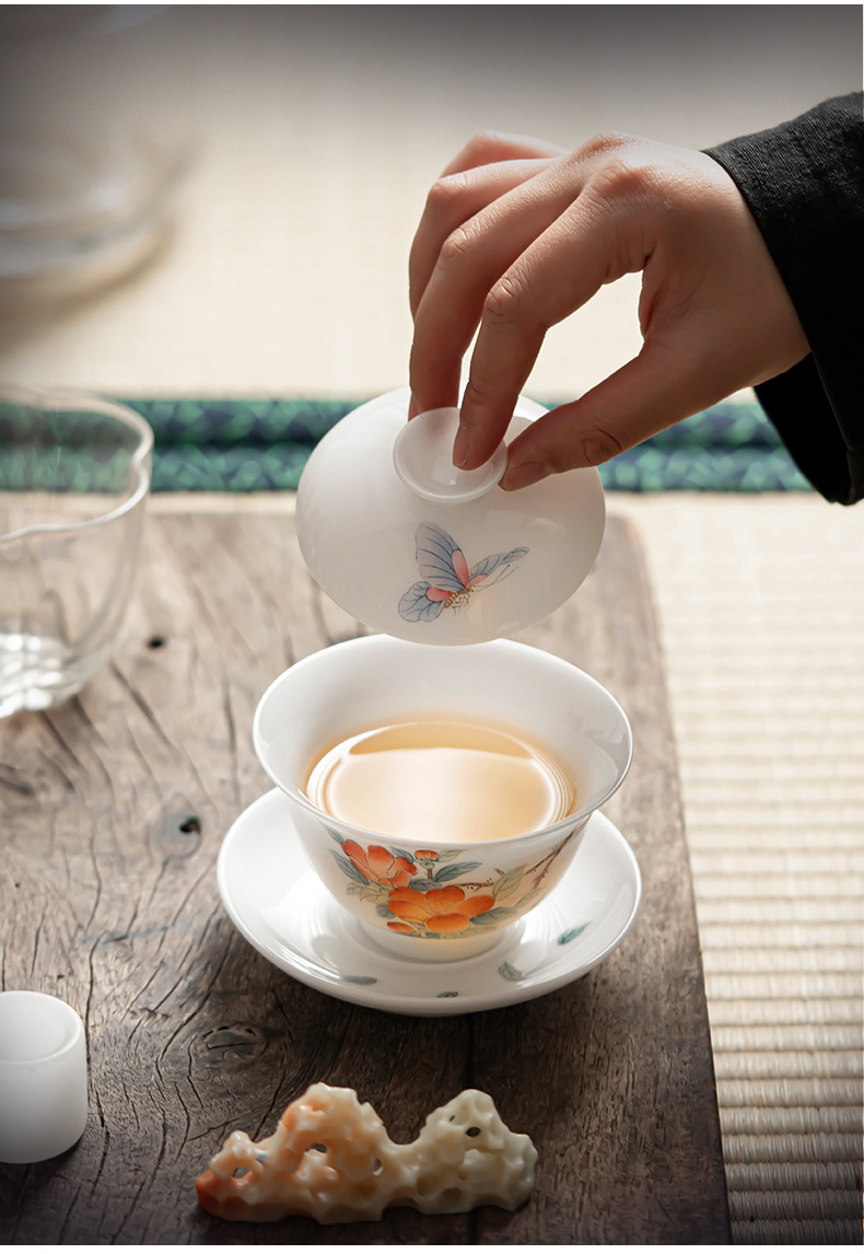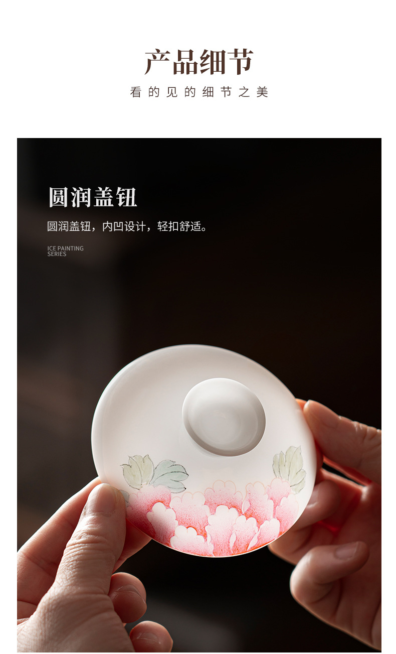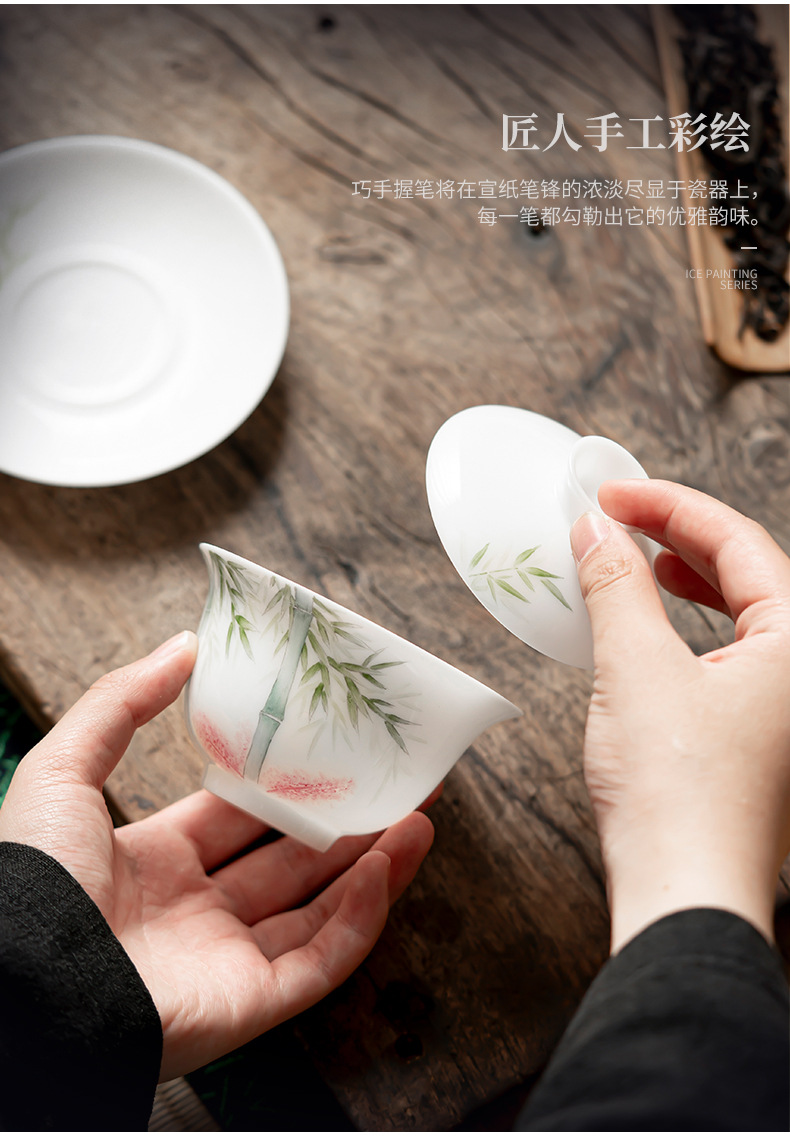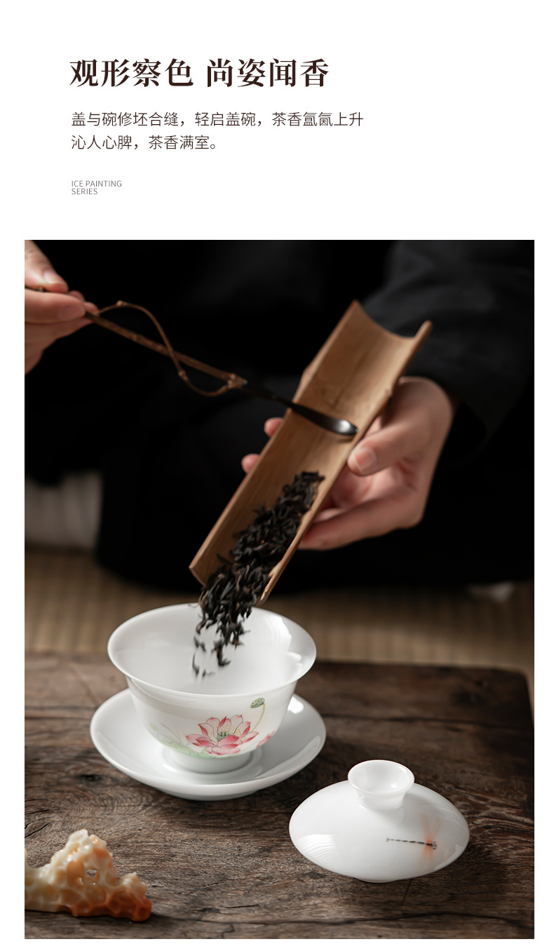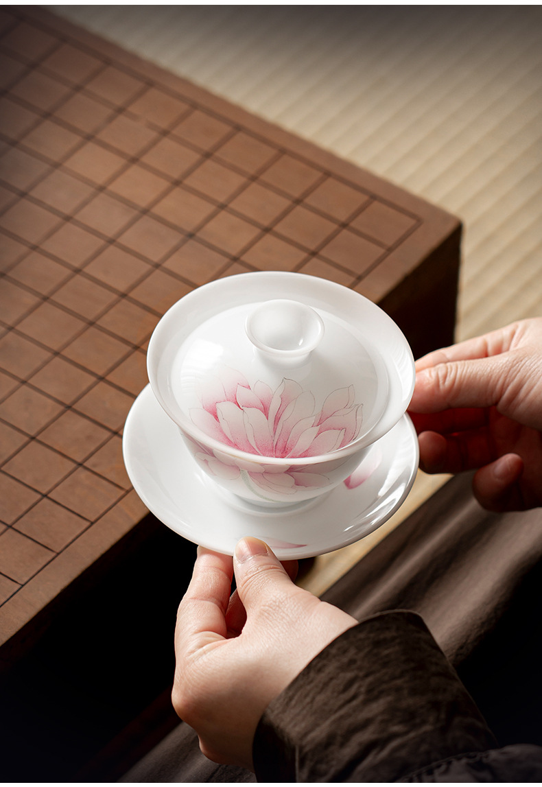 国风手绘冰种三才盖碗茶杯单个陶瓷不烫手盖碗三才茶盏泡茶碗高端