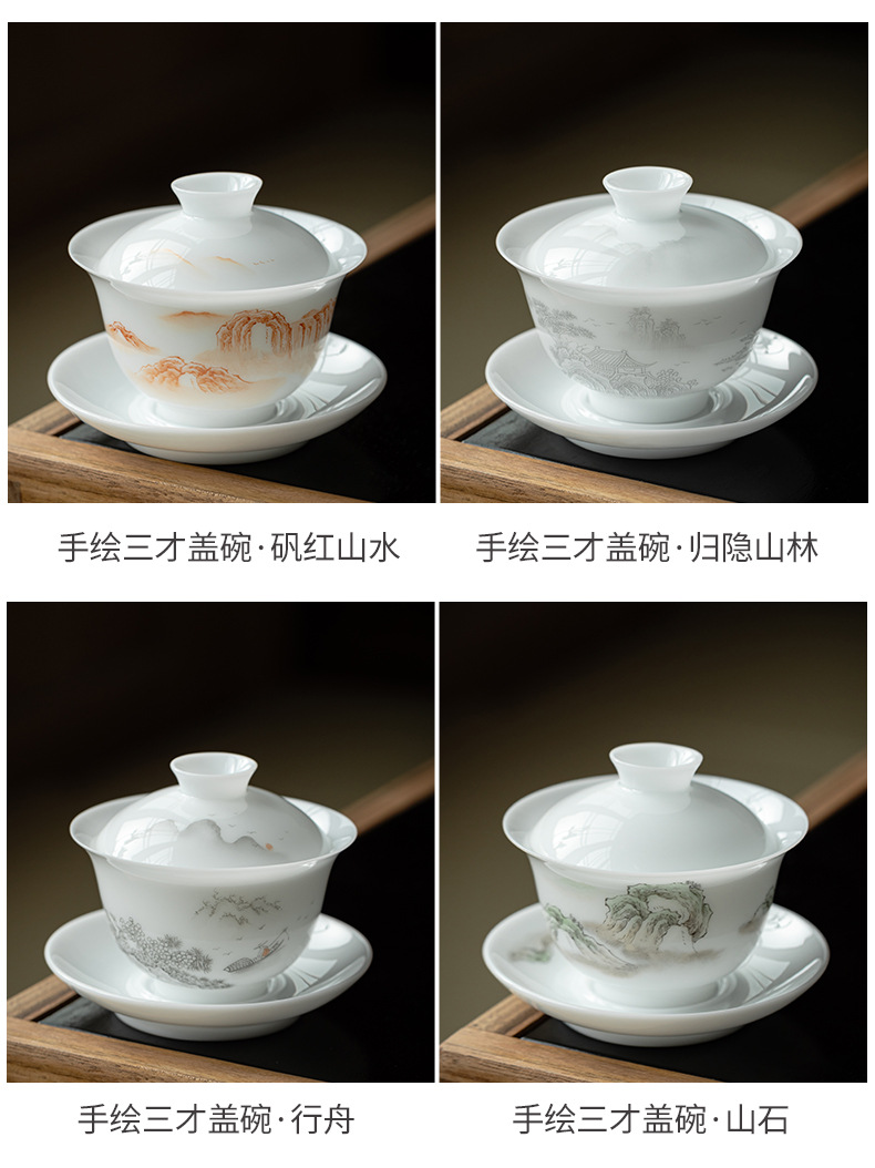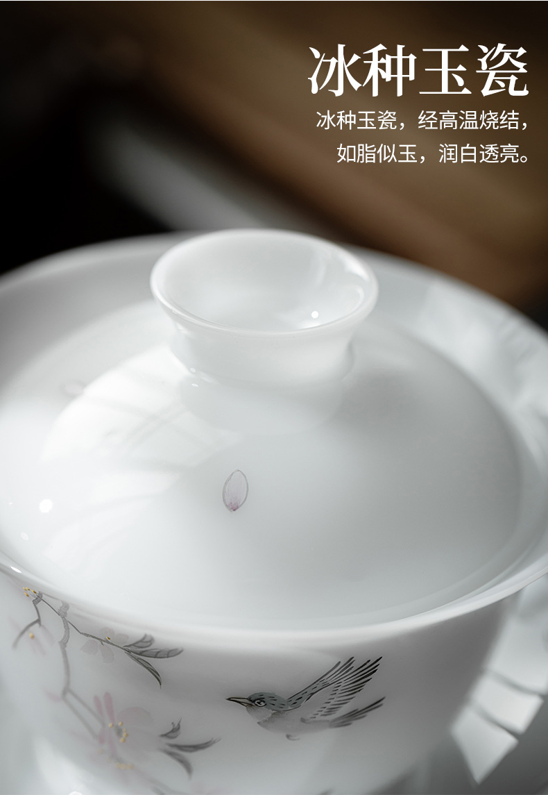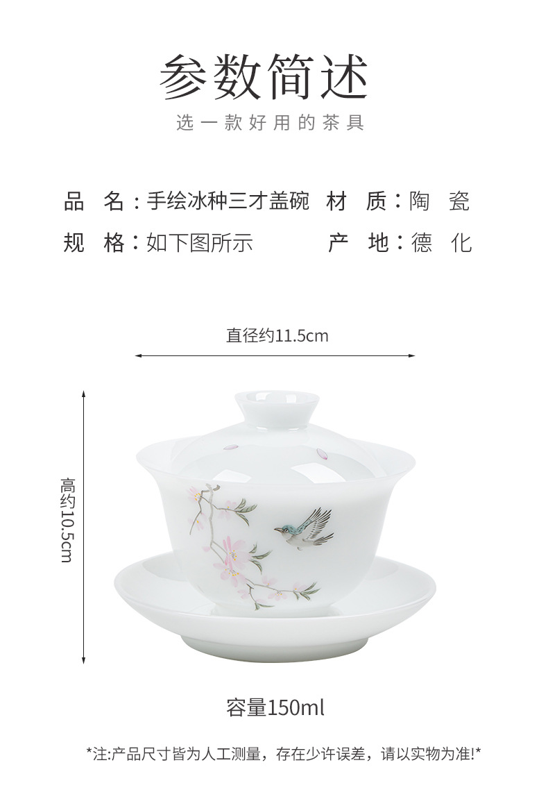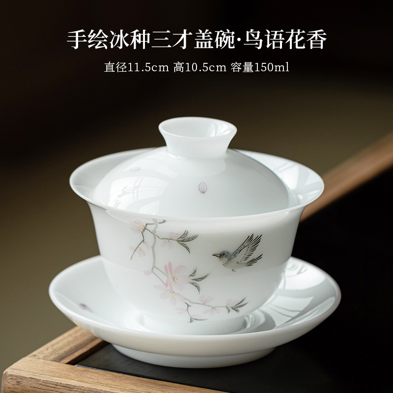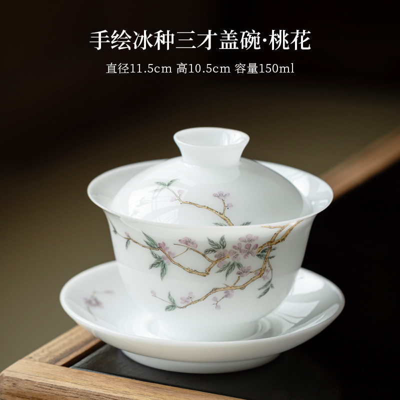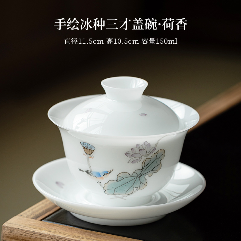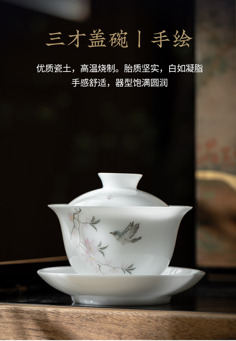 手绘粉彩三才盖碗单个不烫手高档冰种玉瓷泡茶碗陶瓷盖碗茶杯三才
