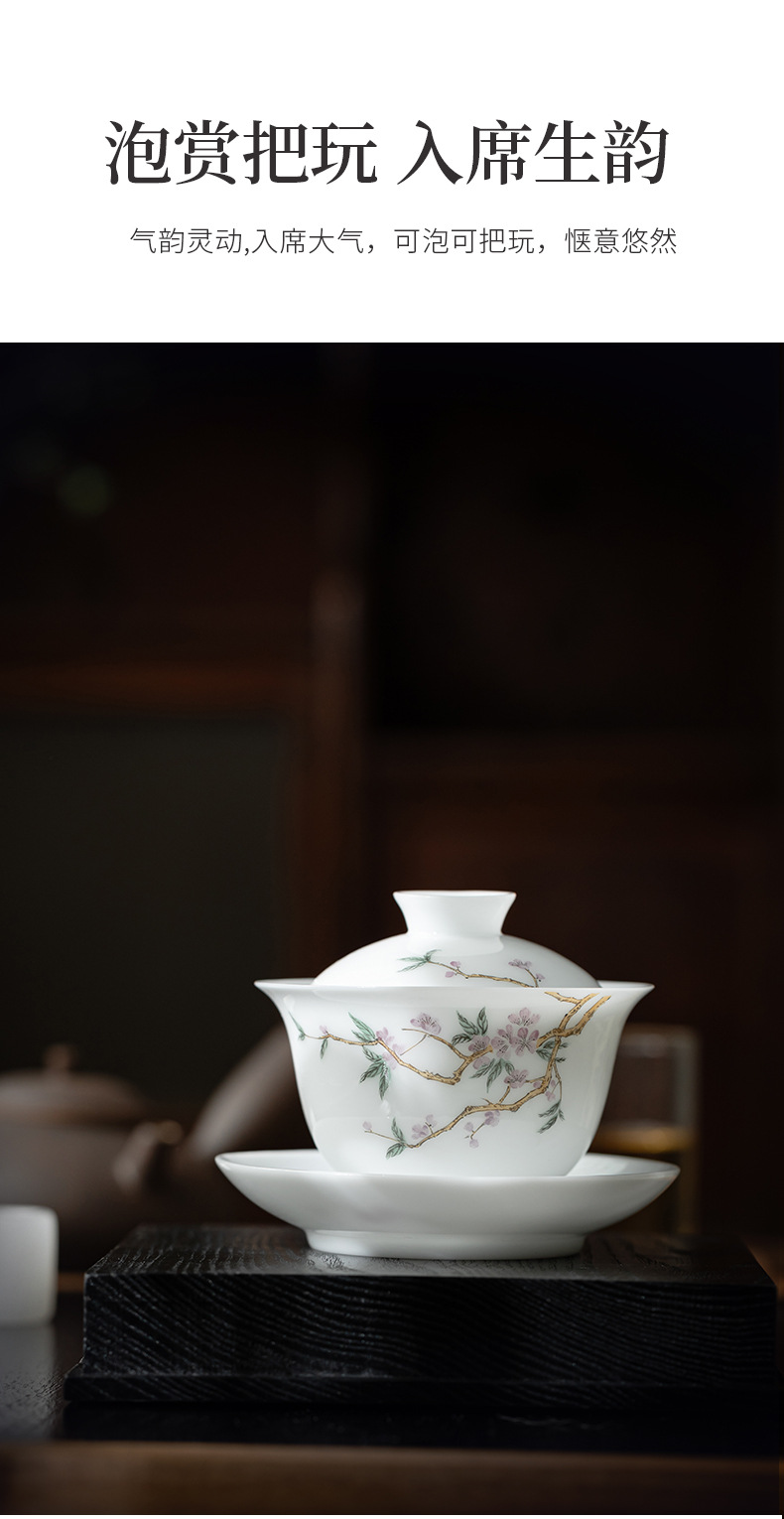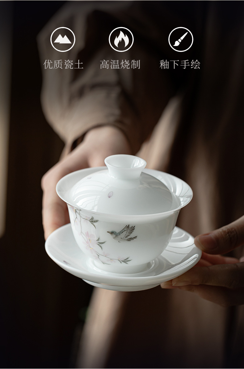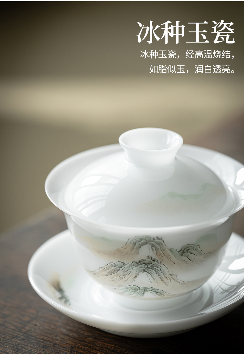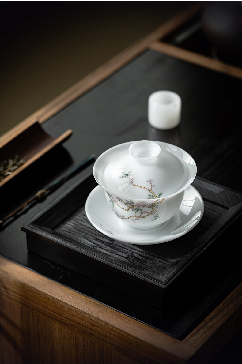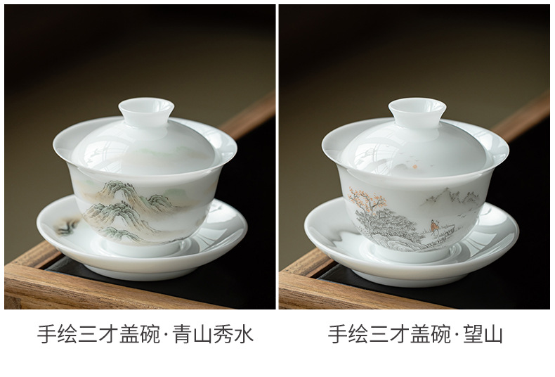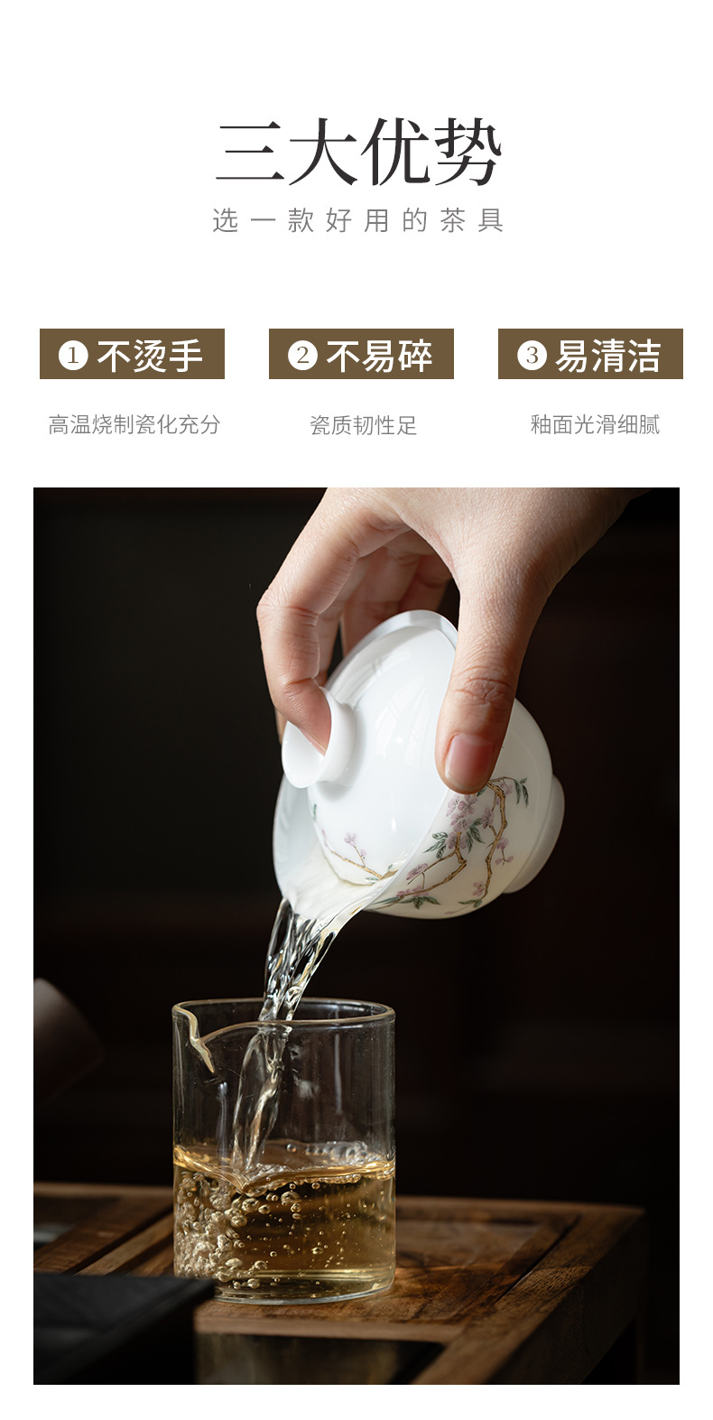 手绘粉彩三才盖碗单个不烫手高档冰种玉瓷泡茶碗陶瓷盖碗茶杯三才