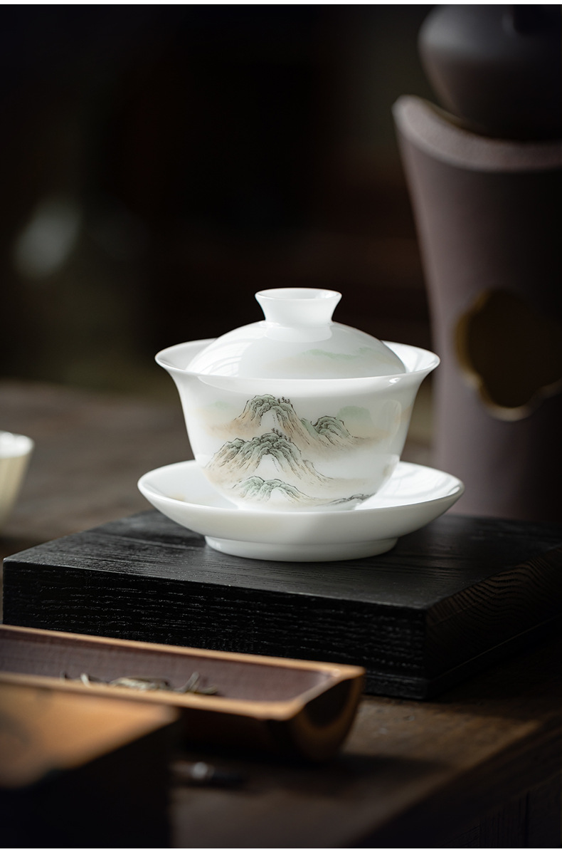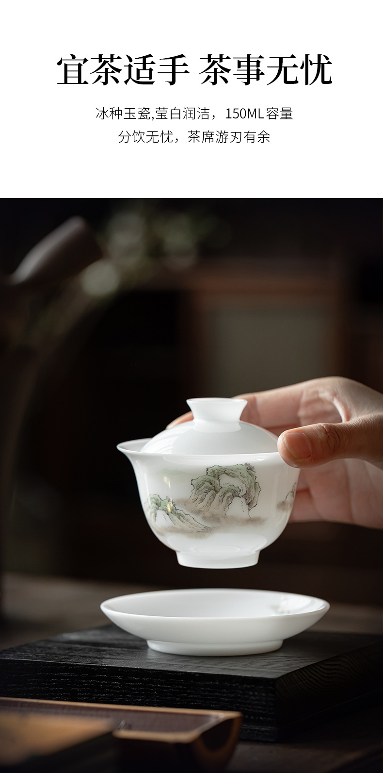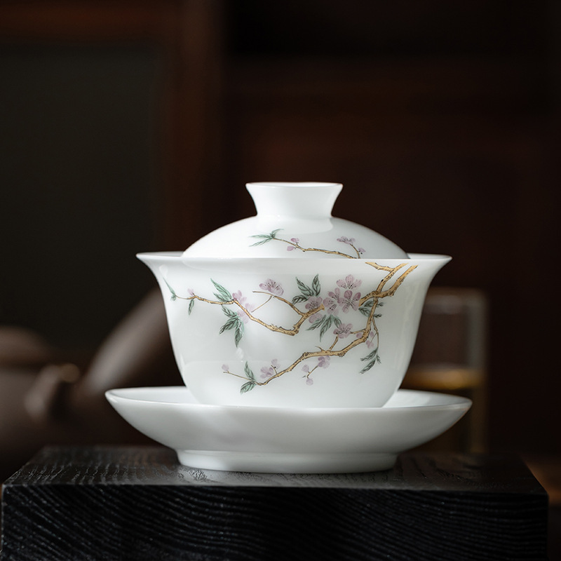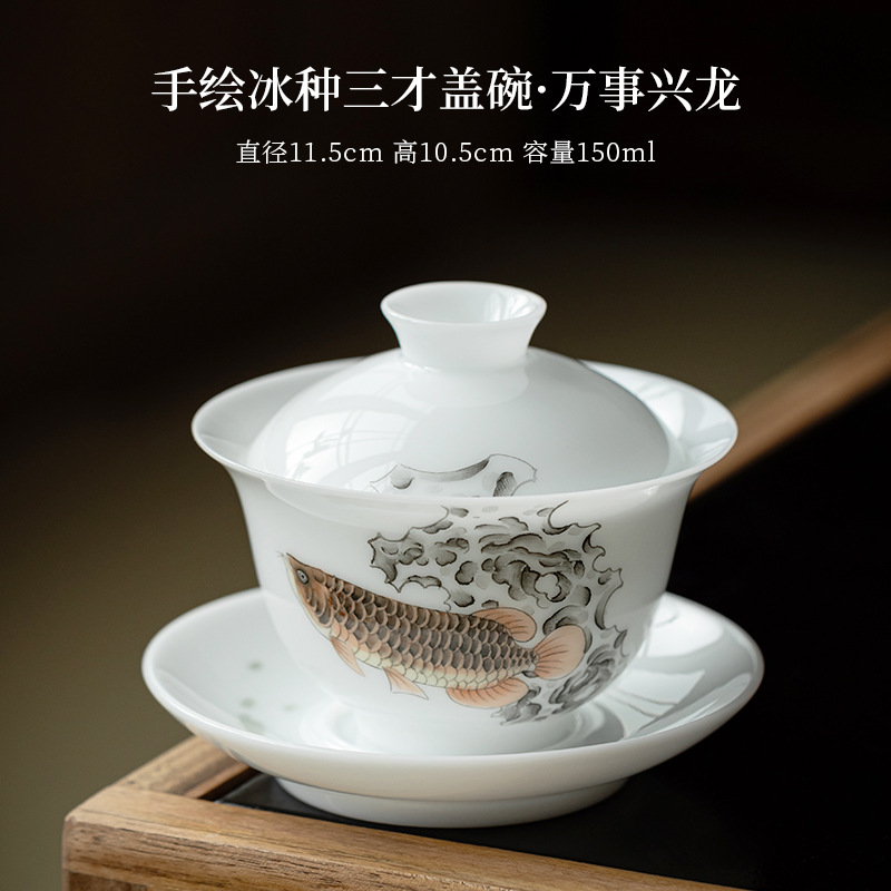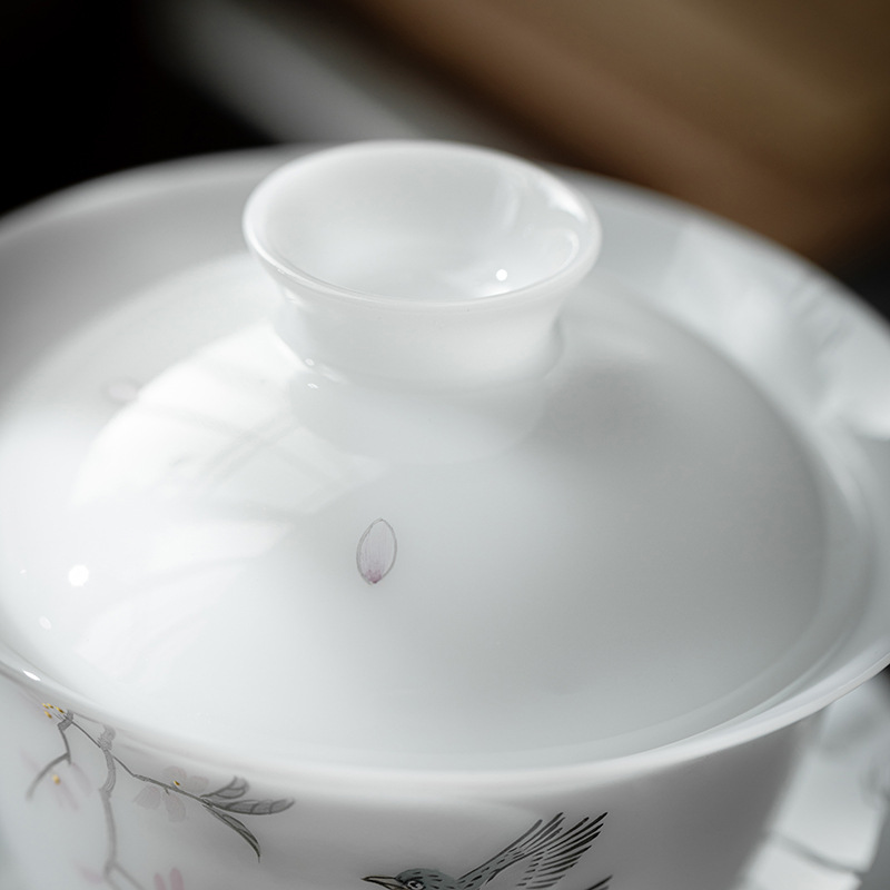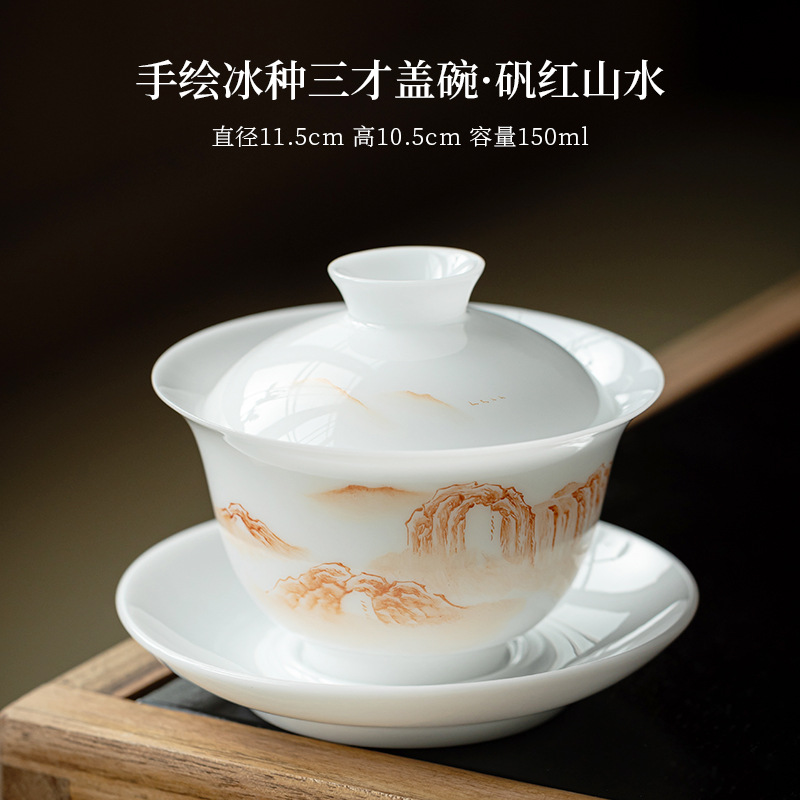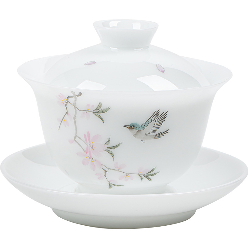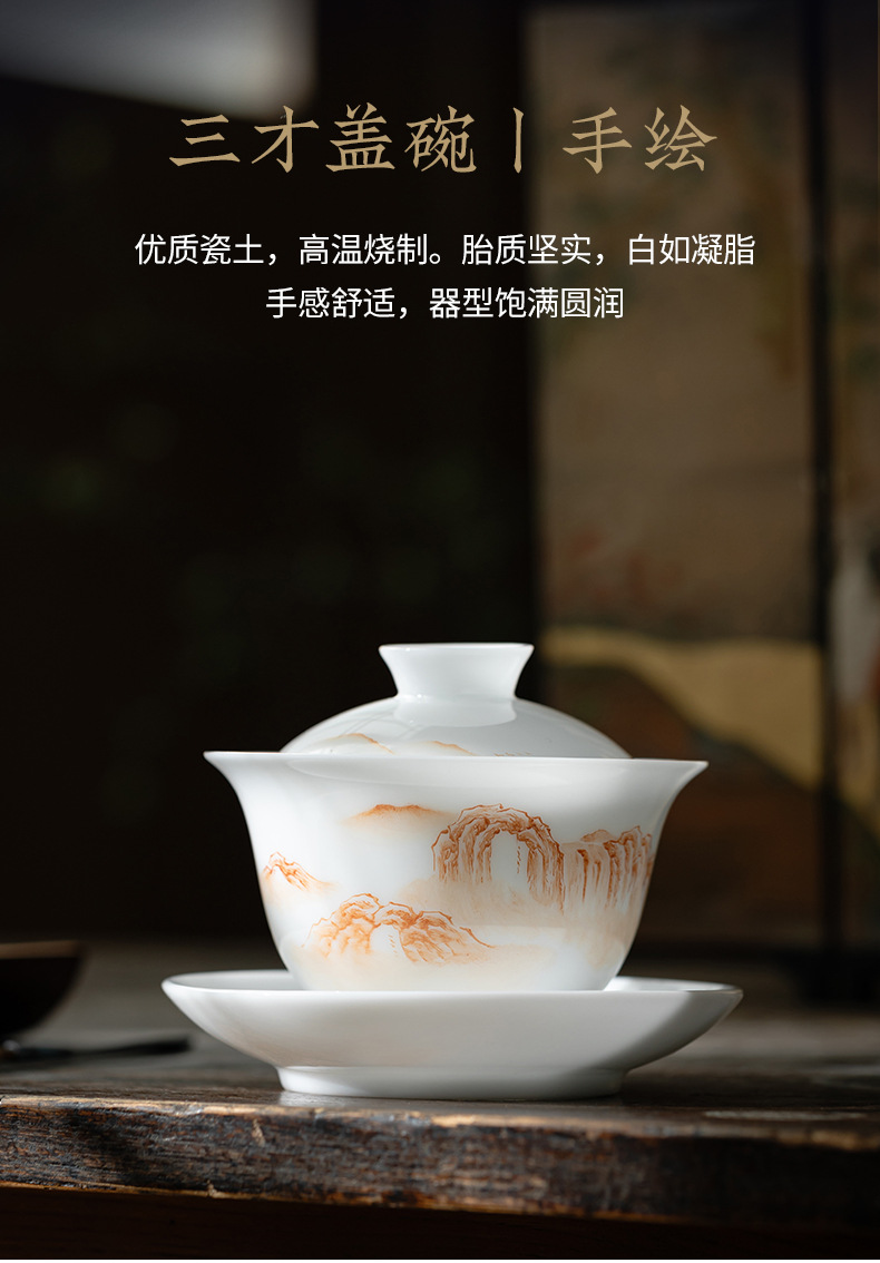 手绘粉彩三才盖碗单个不烫手高档冰种玉瓷泡茶碗陶瓷盖碗茶杯三才