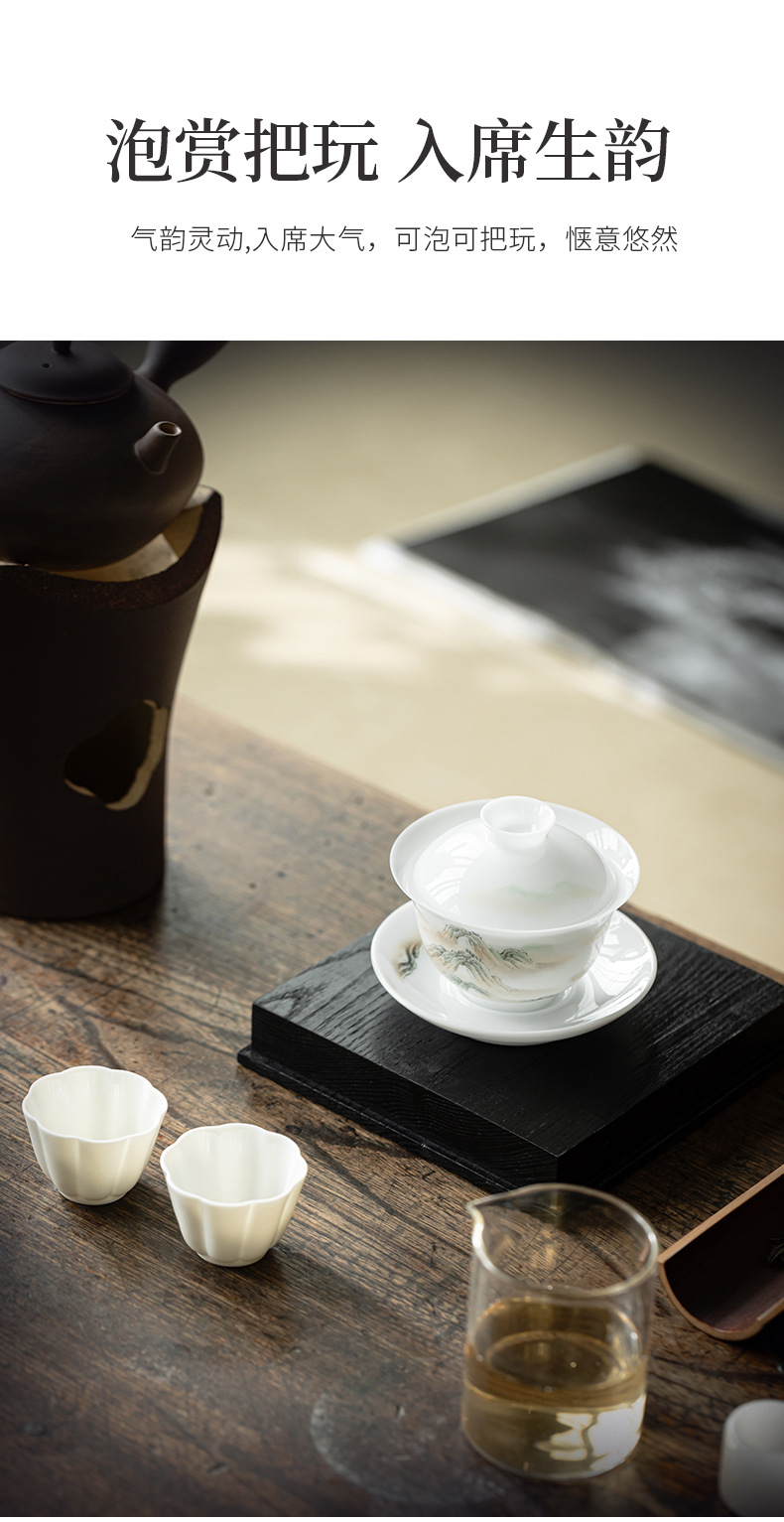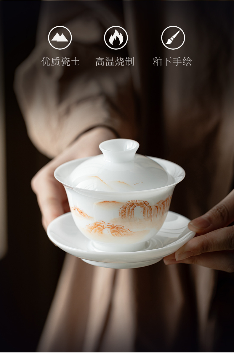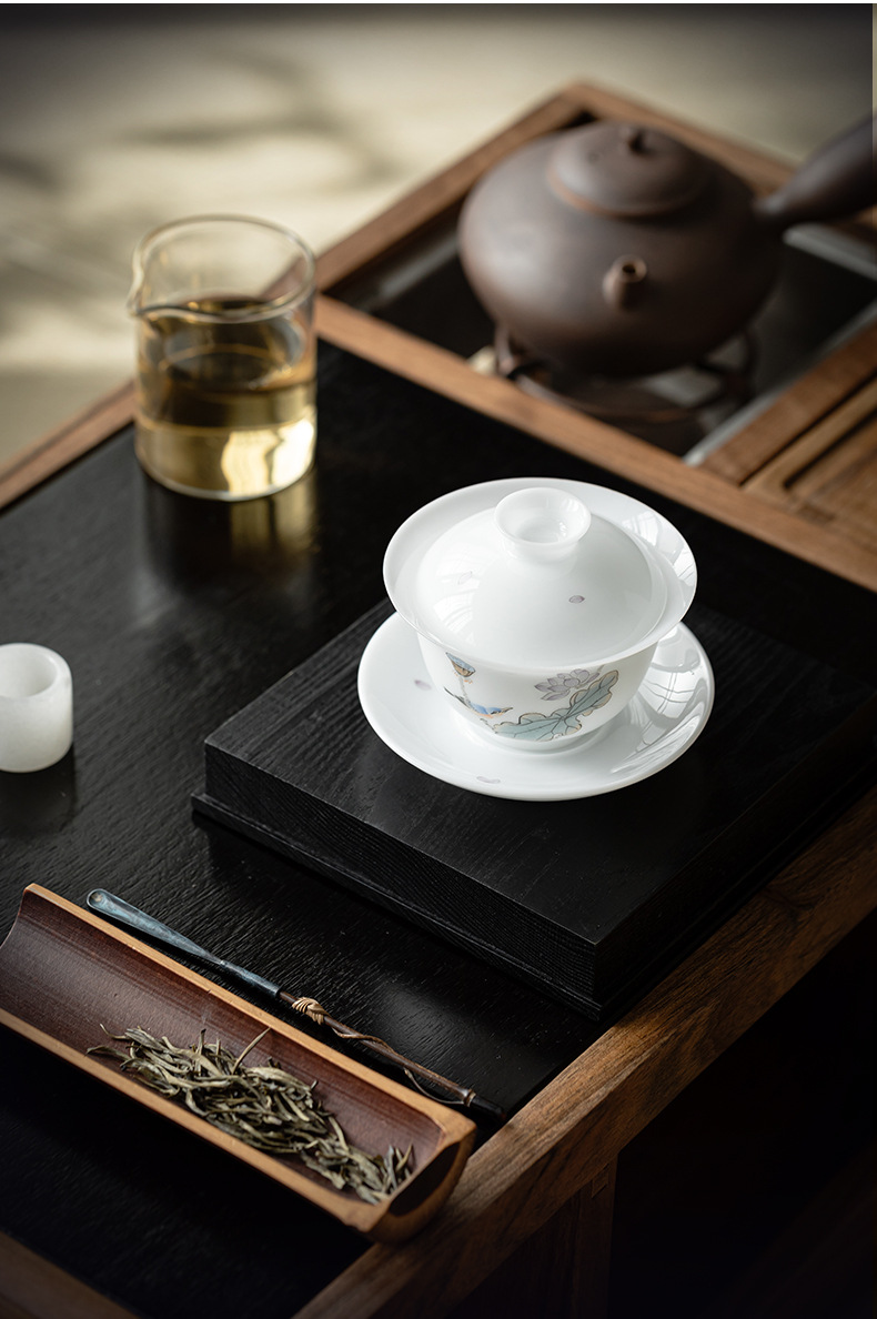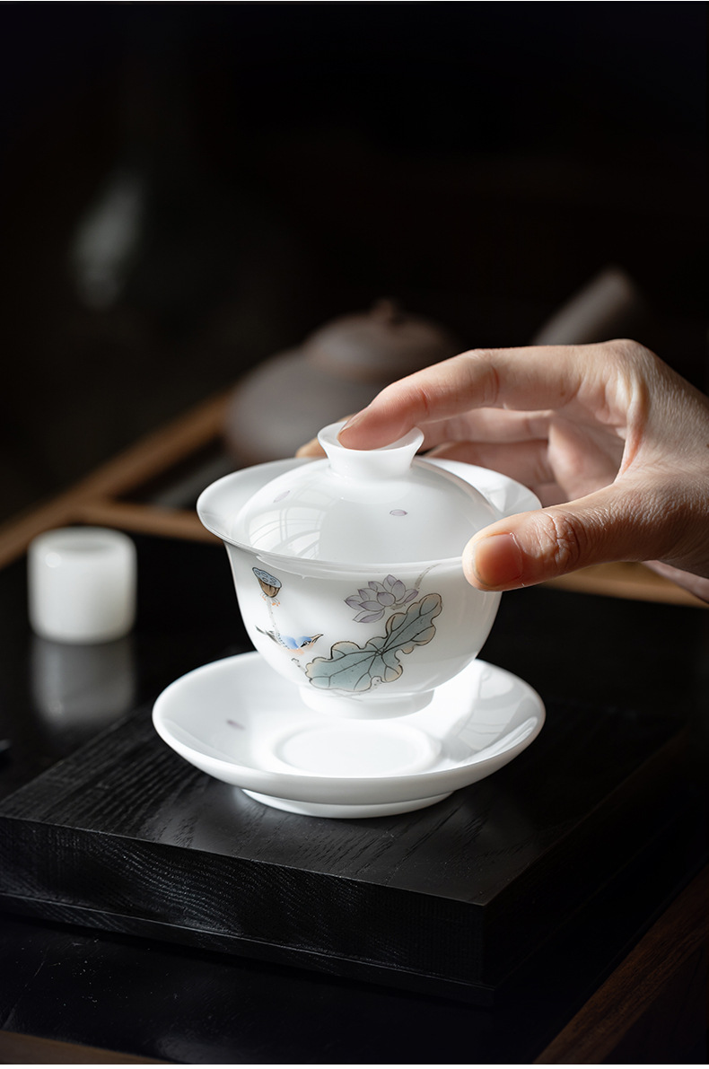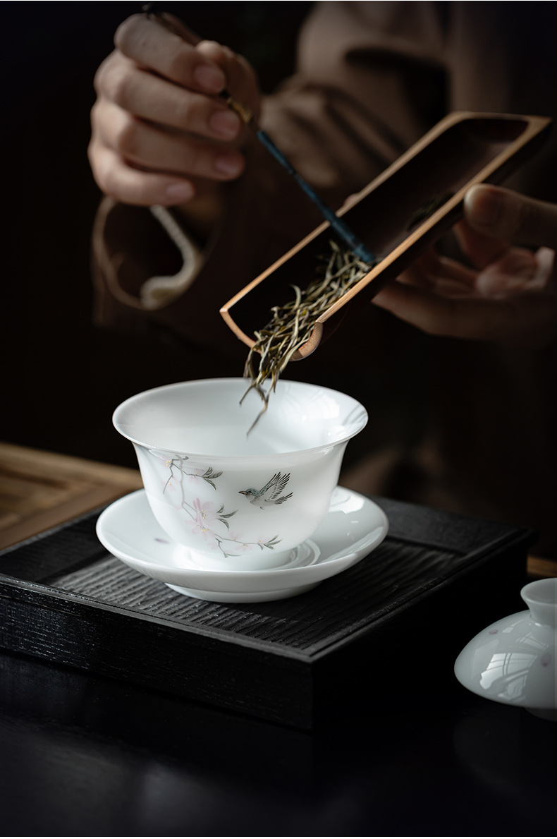 手绘粉彩三才盖碗单个不烫手高档冰种玉瓷泡茶碗陶瓷盖碗茶杯三才