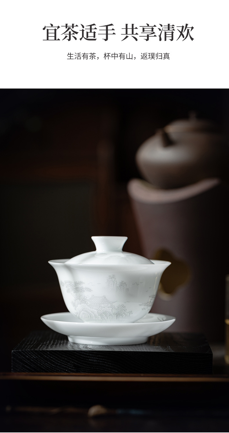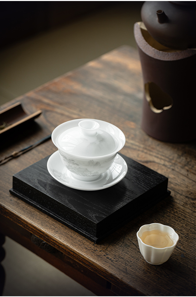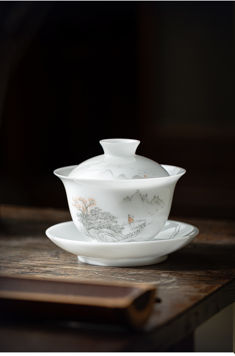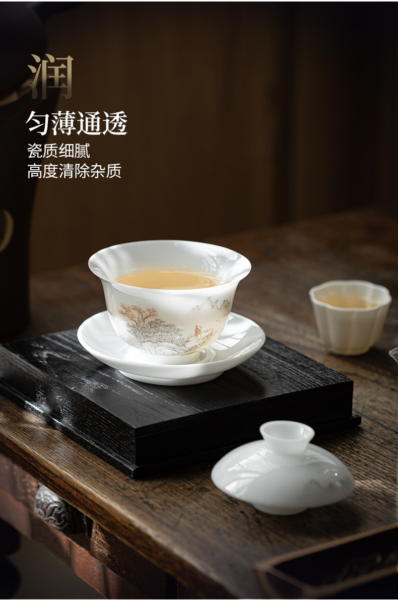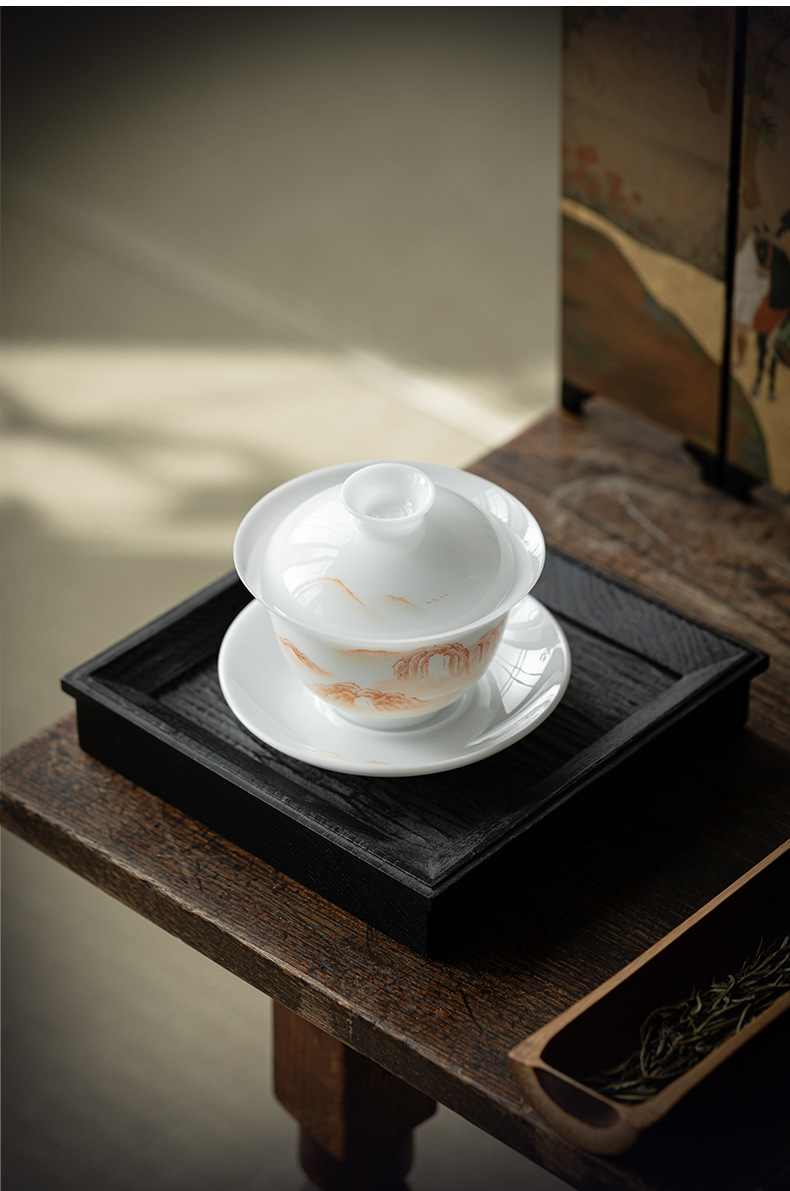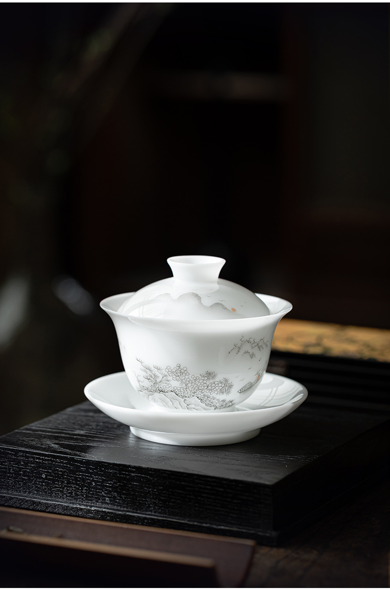 手绘粉彩三才盖碗单个不烫手高档冰种玉瓷泡茶碗陶瓷盖碗茶杯三才