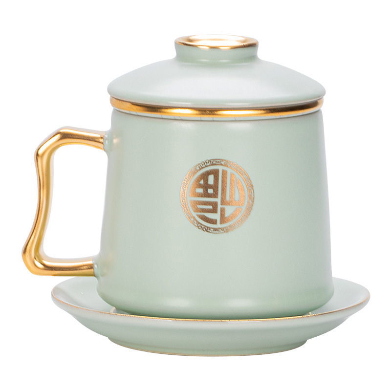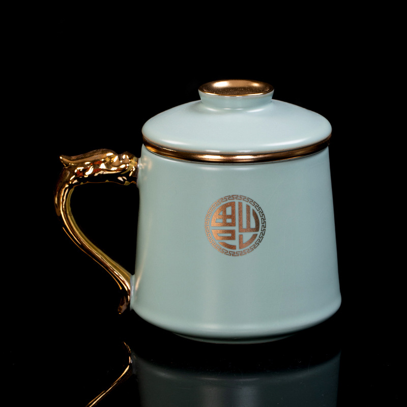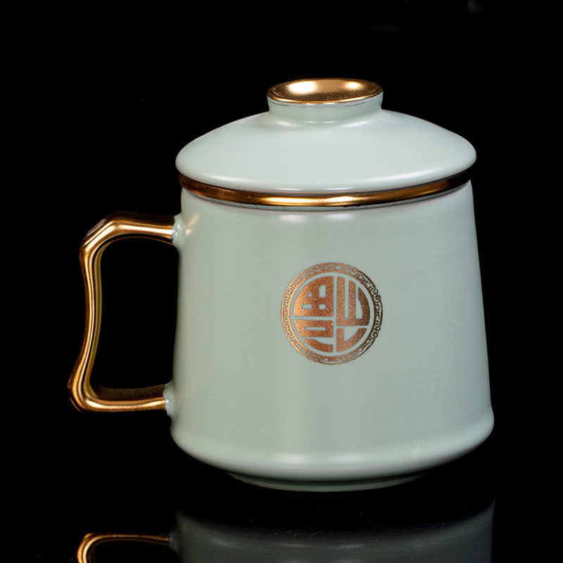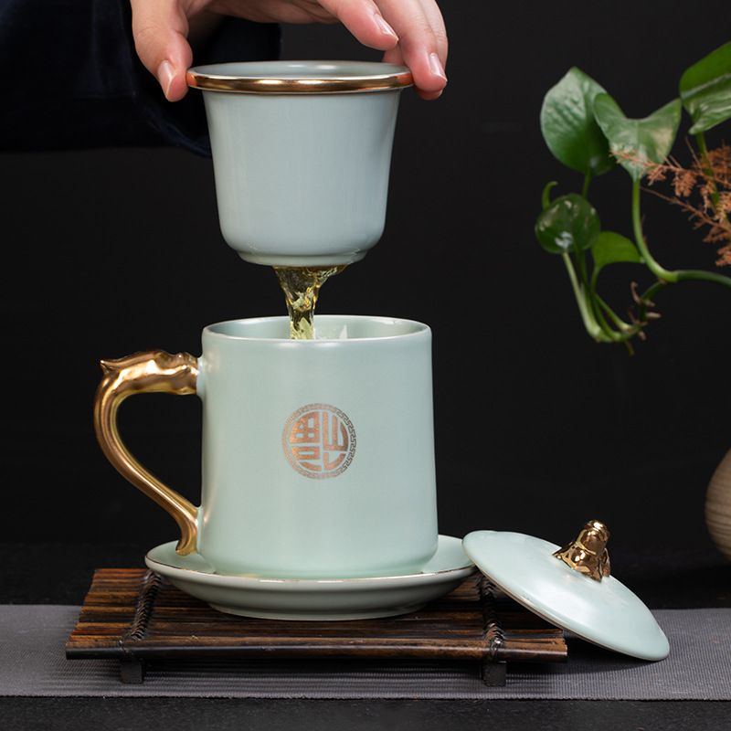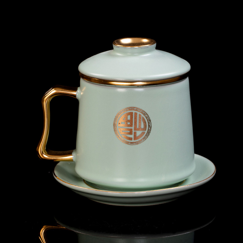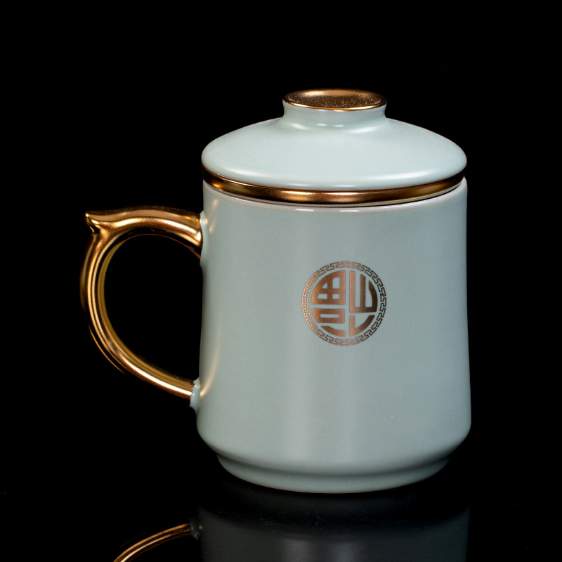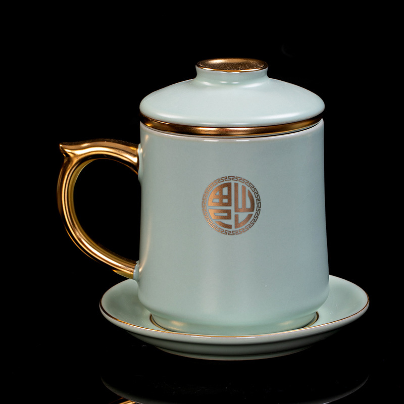 汝窑马克杯茶咖陶瓷过滤三件套描金个人杯水茶水分离办公礼品