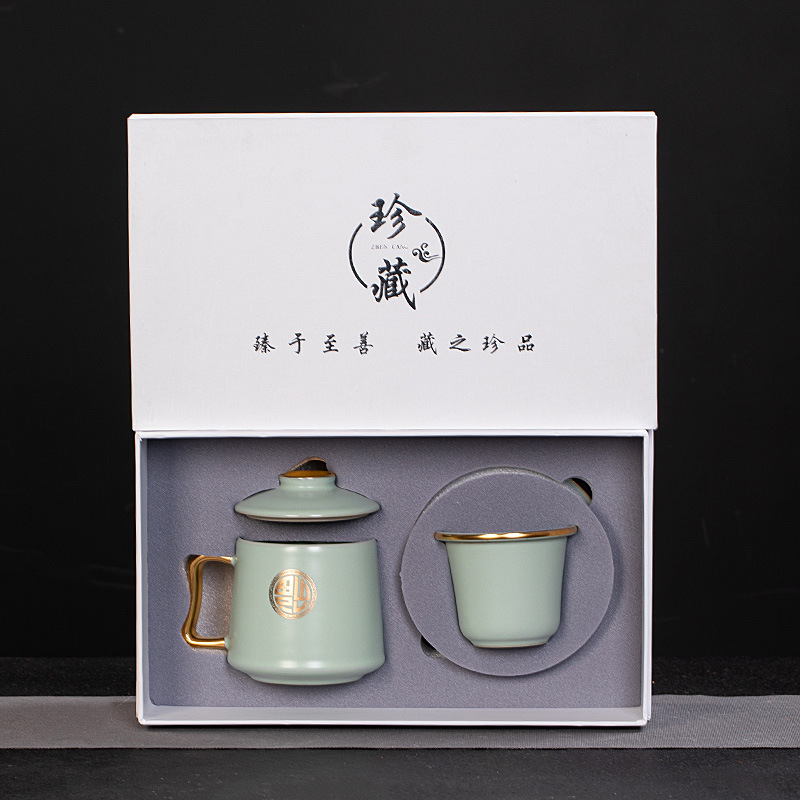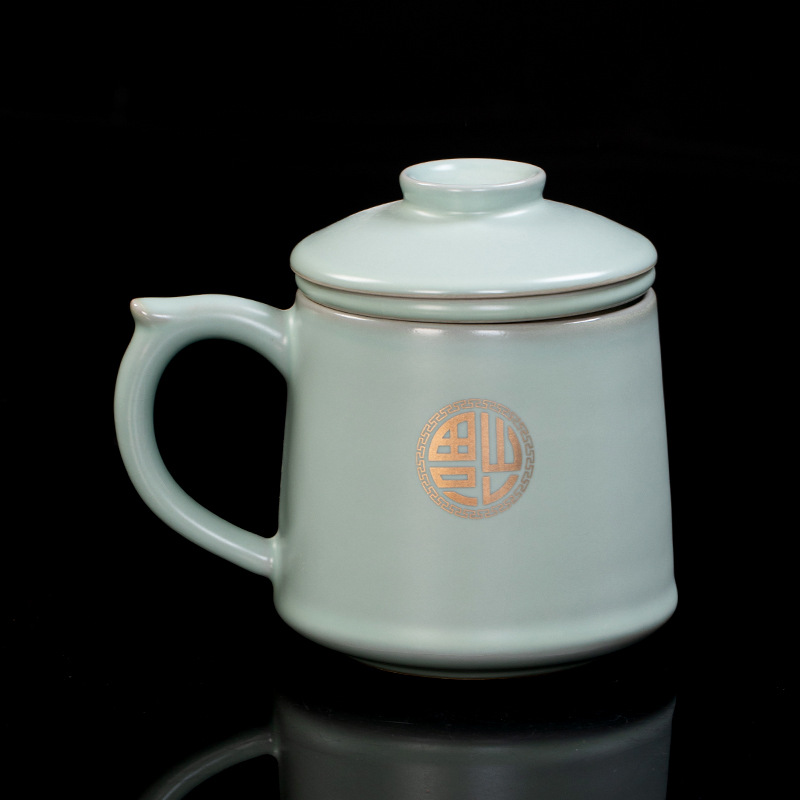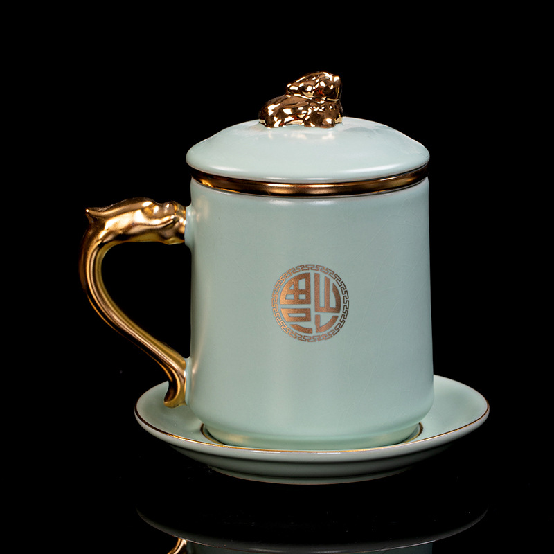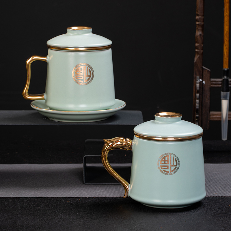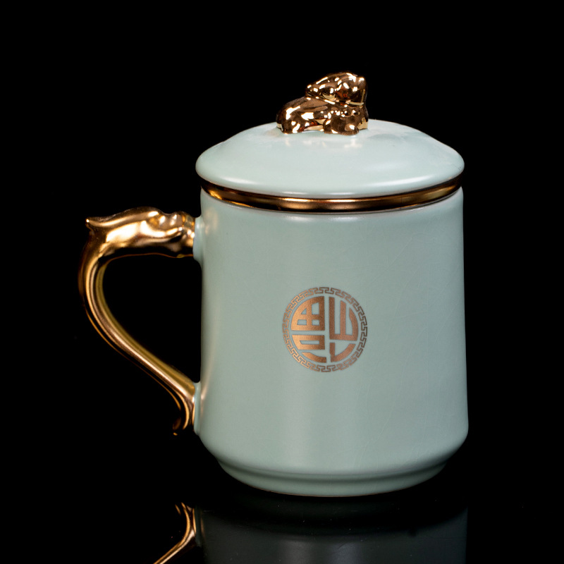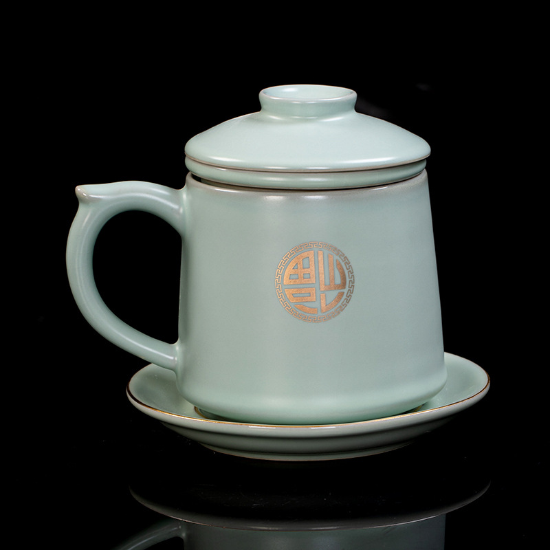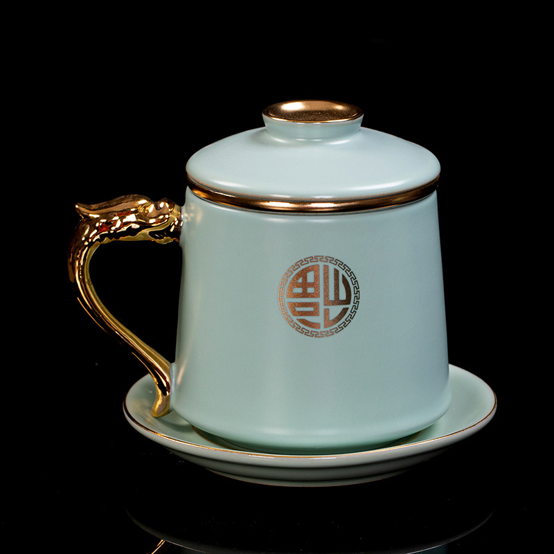 汝窑马克杯茶咖陶瓷过滤三件套描金个人杯水茶水分离办公礼品