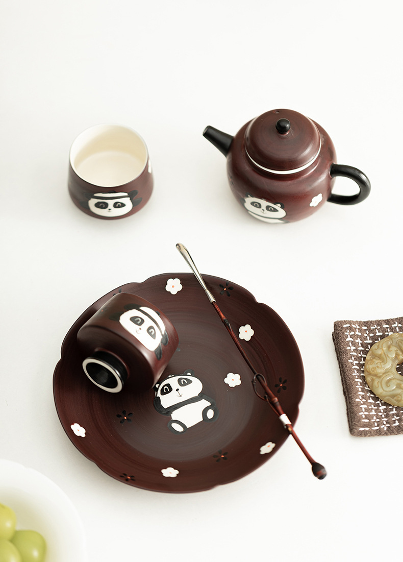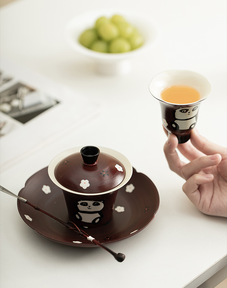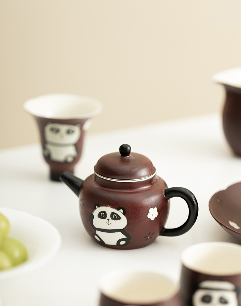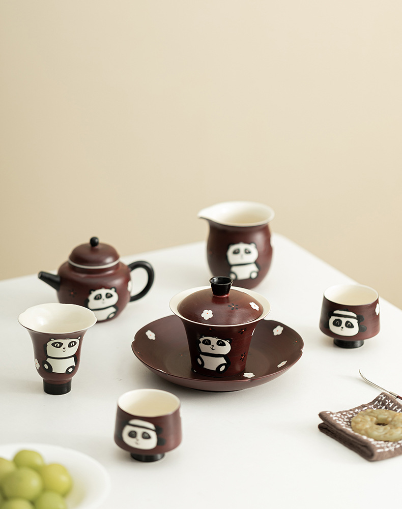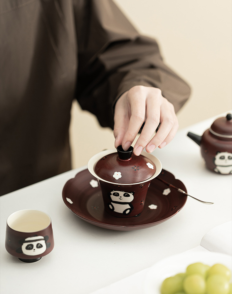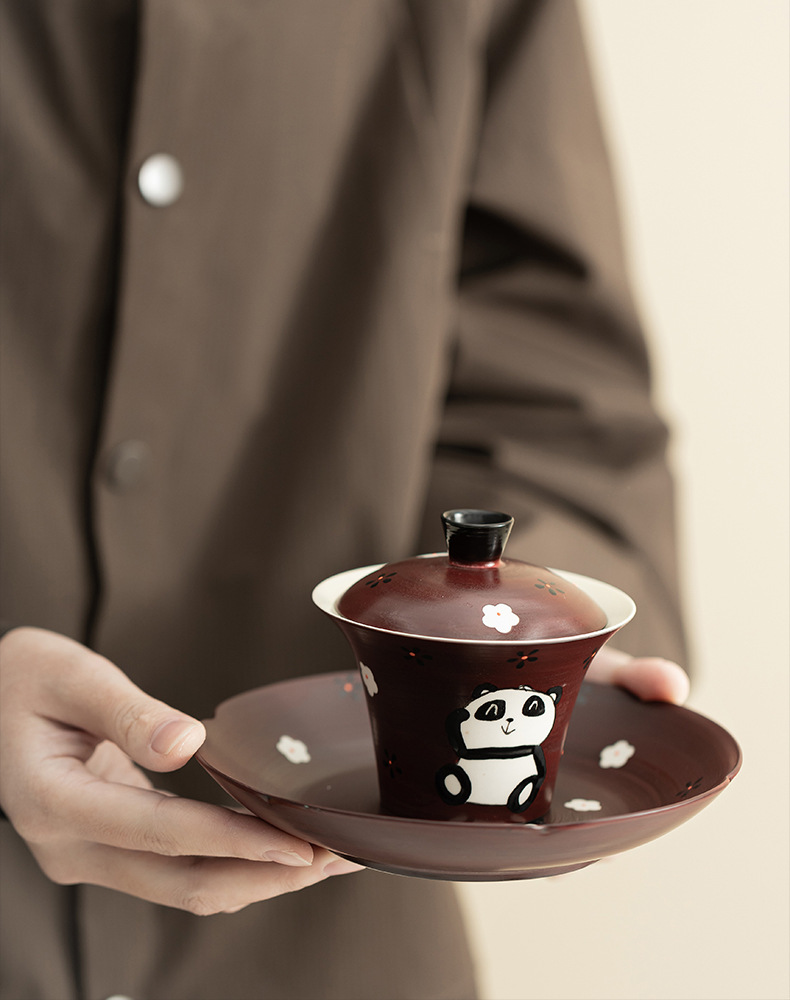 国潮山楂红手绘熊猫陶瓷功夫茶具套装 茶壶盖碗茶杯全套 泡茶茶具