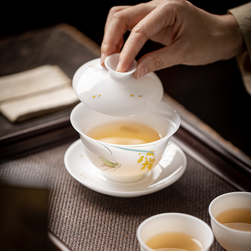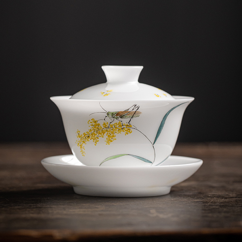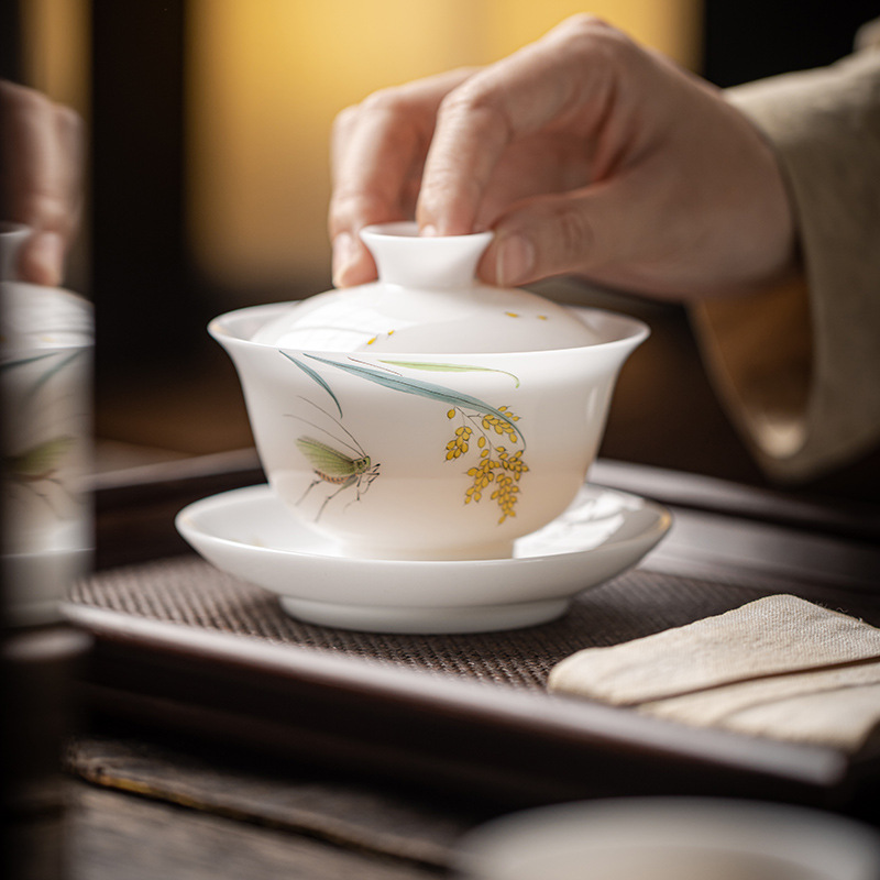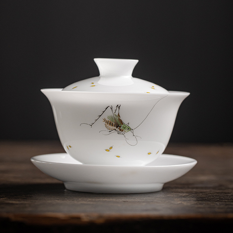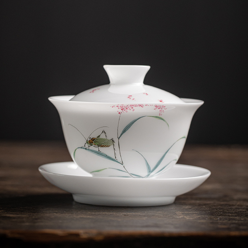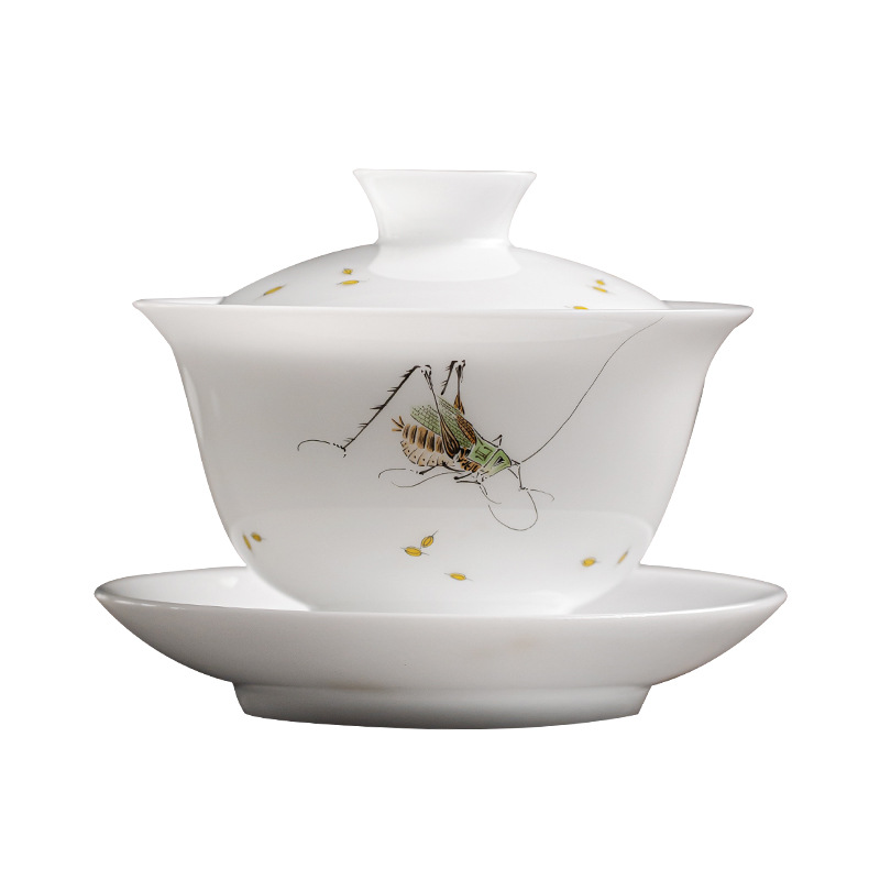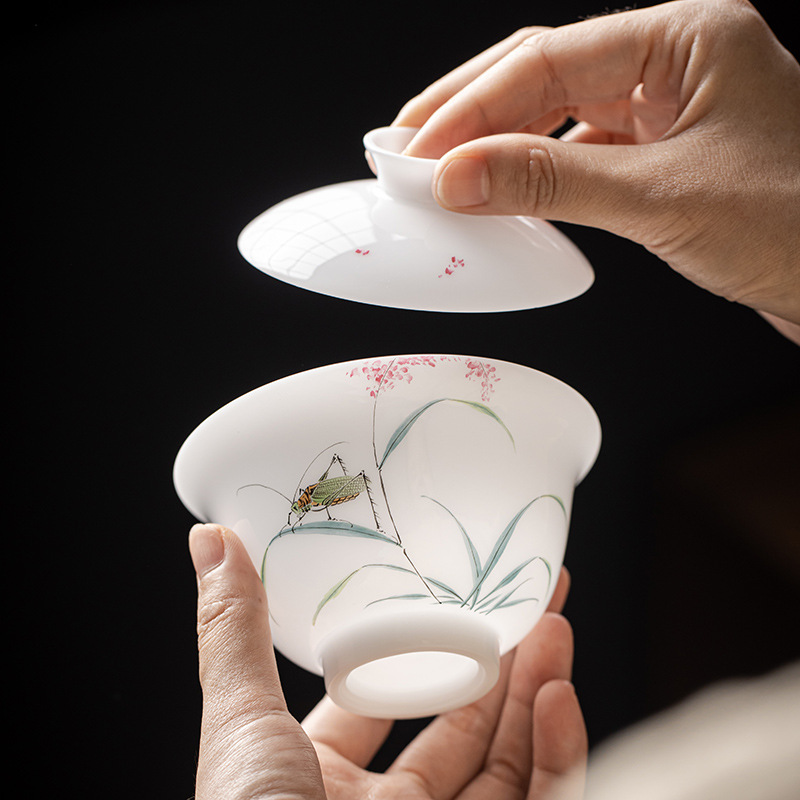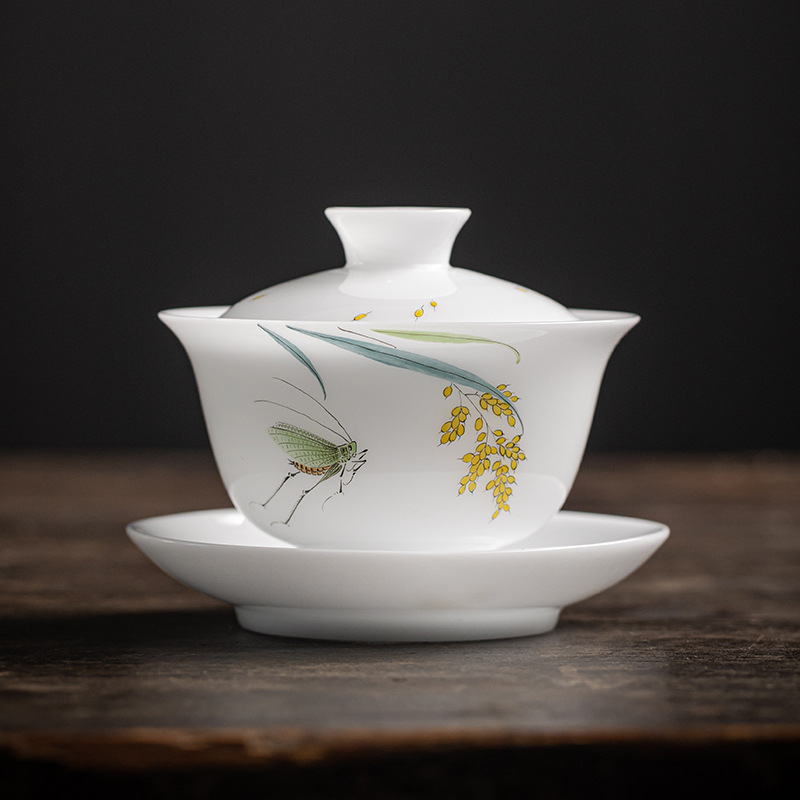 手绘冰种玉瓷三才盖碗陶瓷功夫茶具套装茶碗泡茶壶高档喝茶盏茶杯