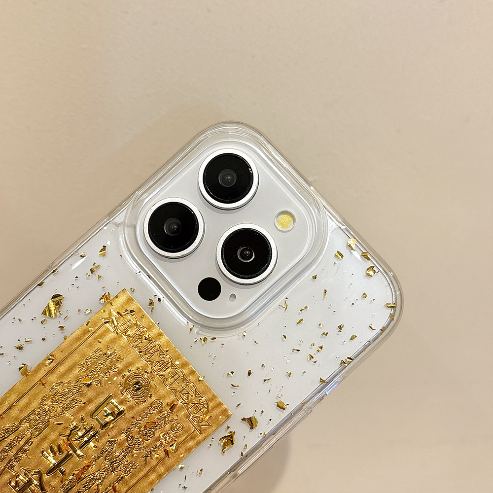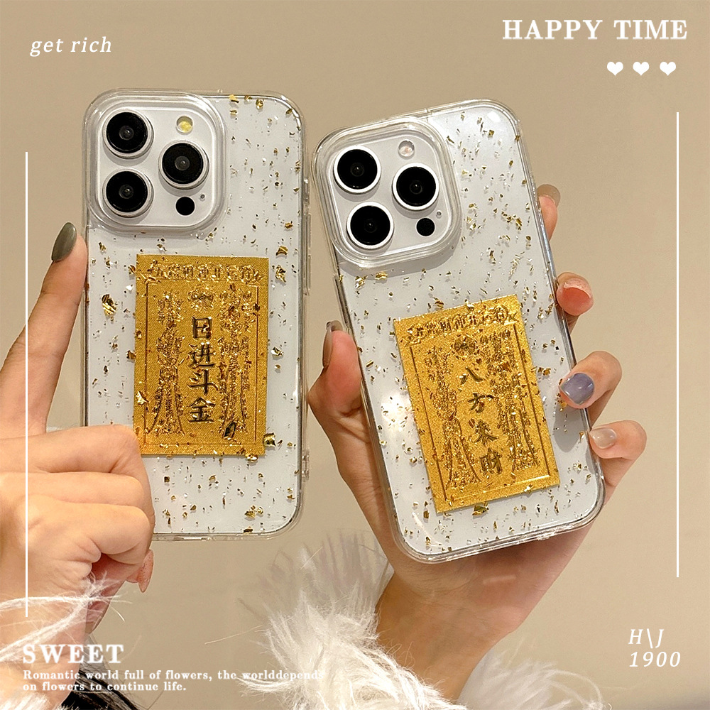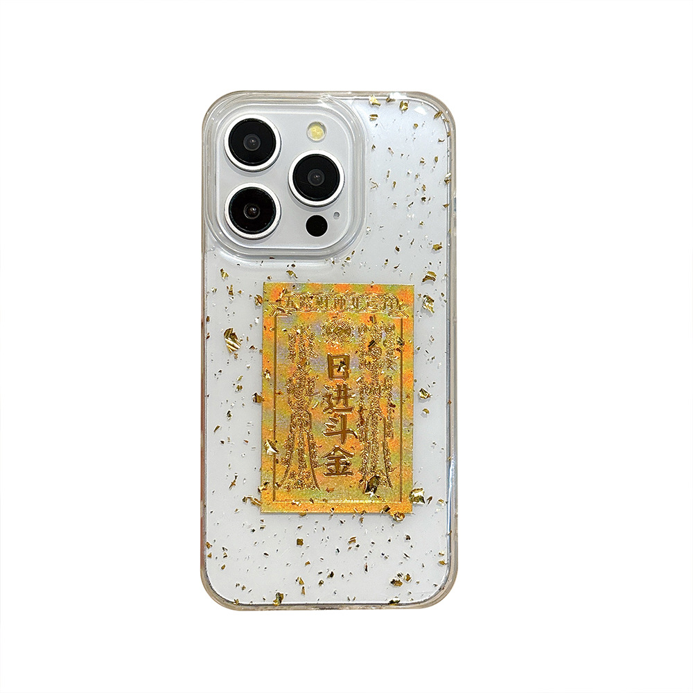适用iPhone16promax日进斗金金箔滴胶手机壳苹果15透明防摔保护套