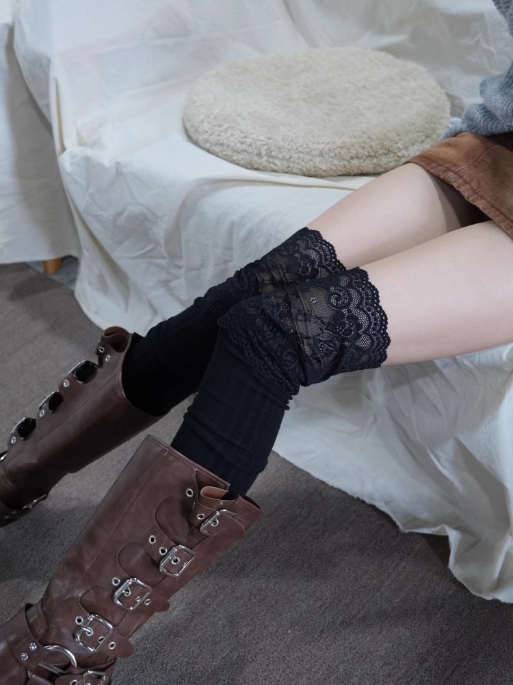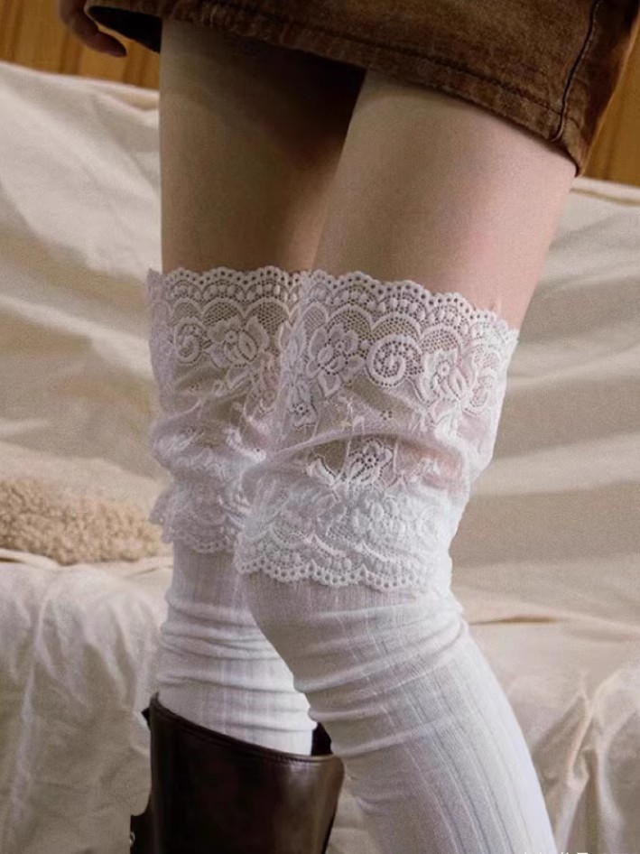 袜子女白色竖条纹蕾丝袜花边过膝袜小众时髦长筒堆堆靴袜诸暨