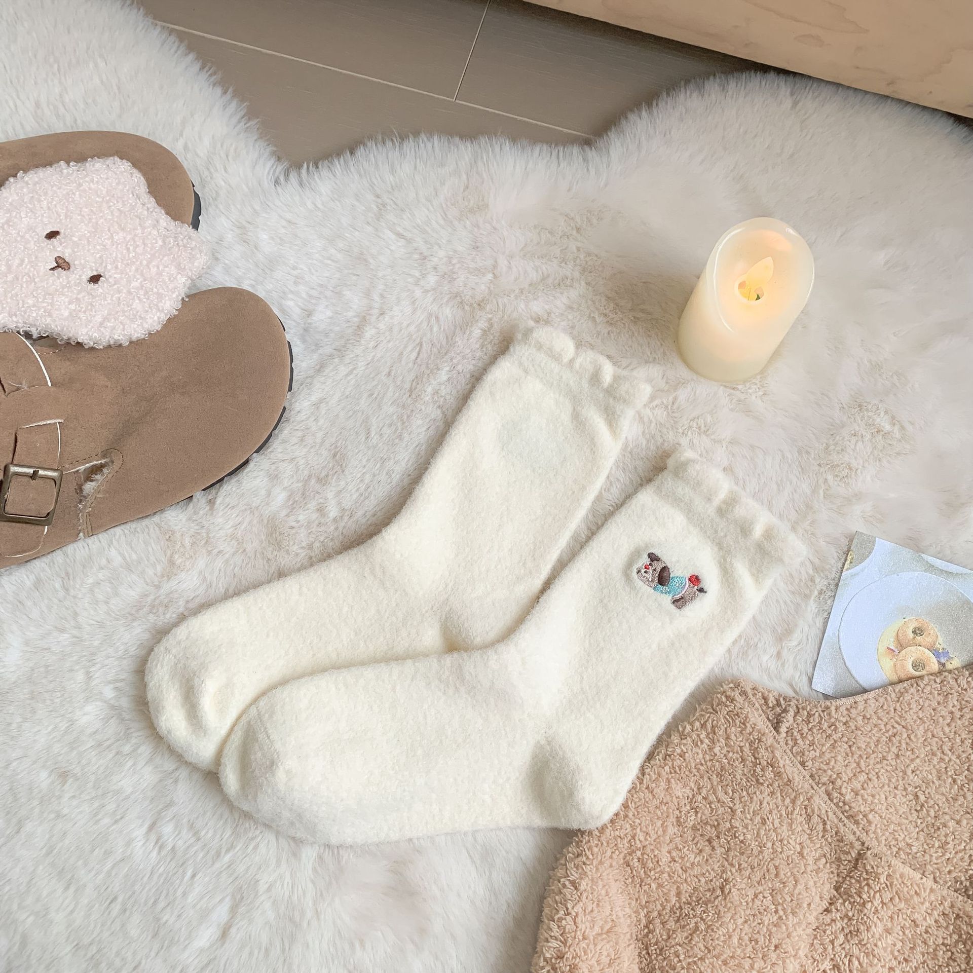 可爱俏皮腊肠狗刺绣袜子秋冬软乎乎加厚加绒保暖澳绒堆堆袜子女