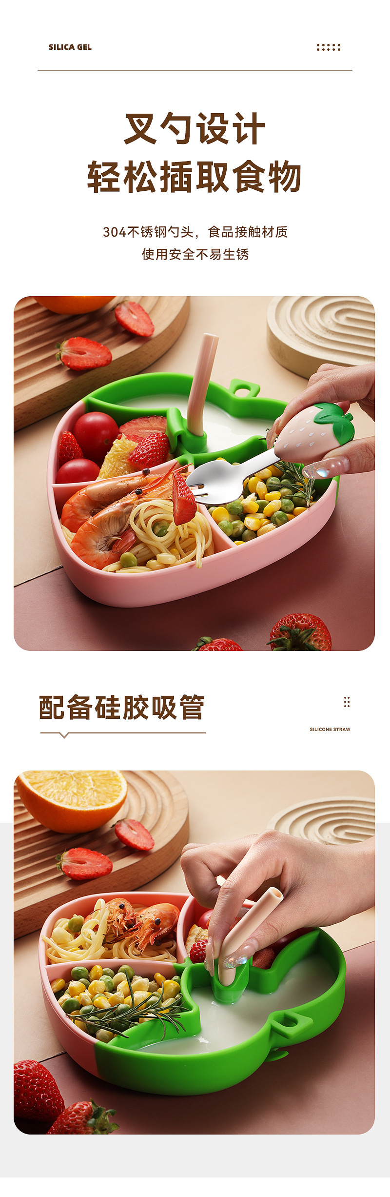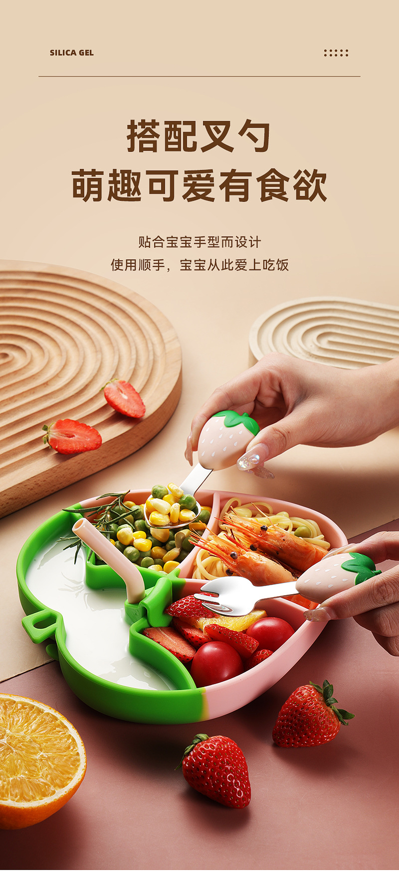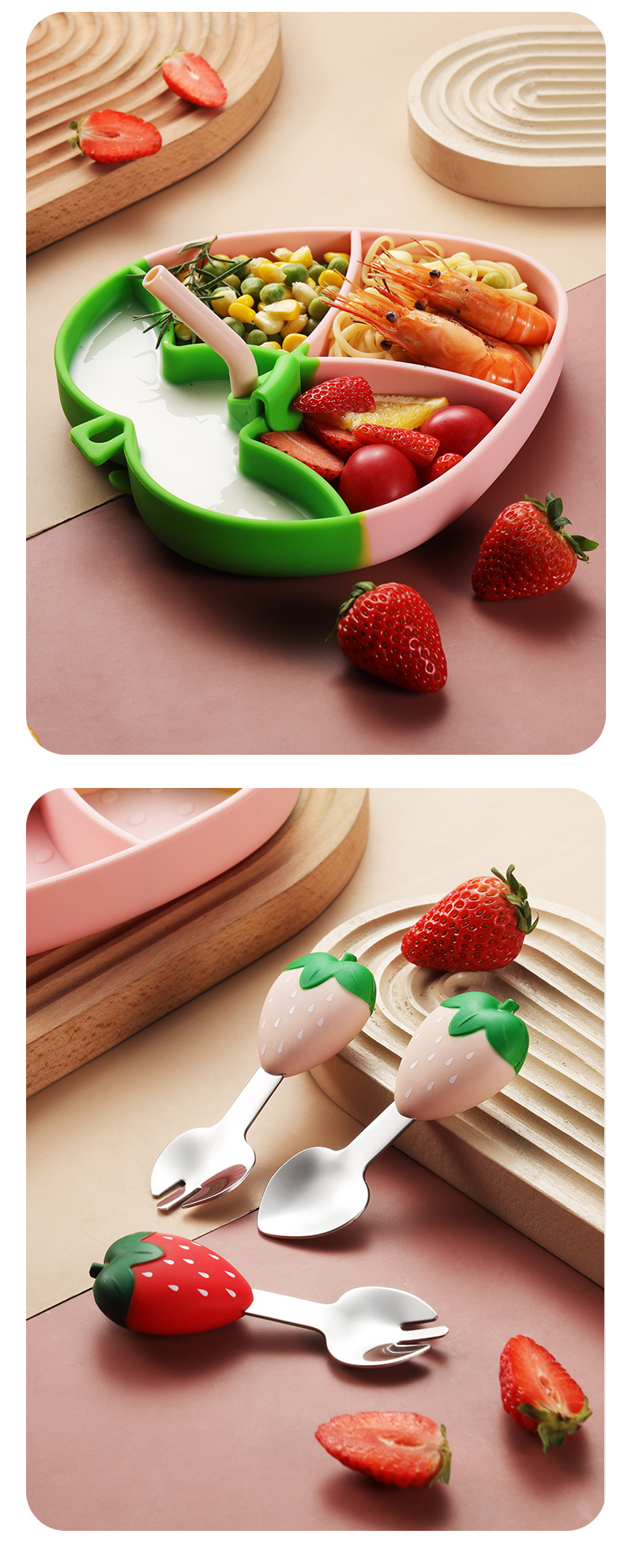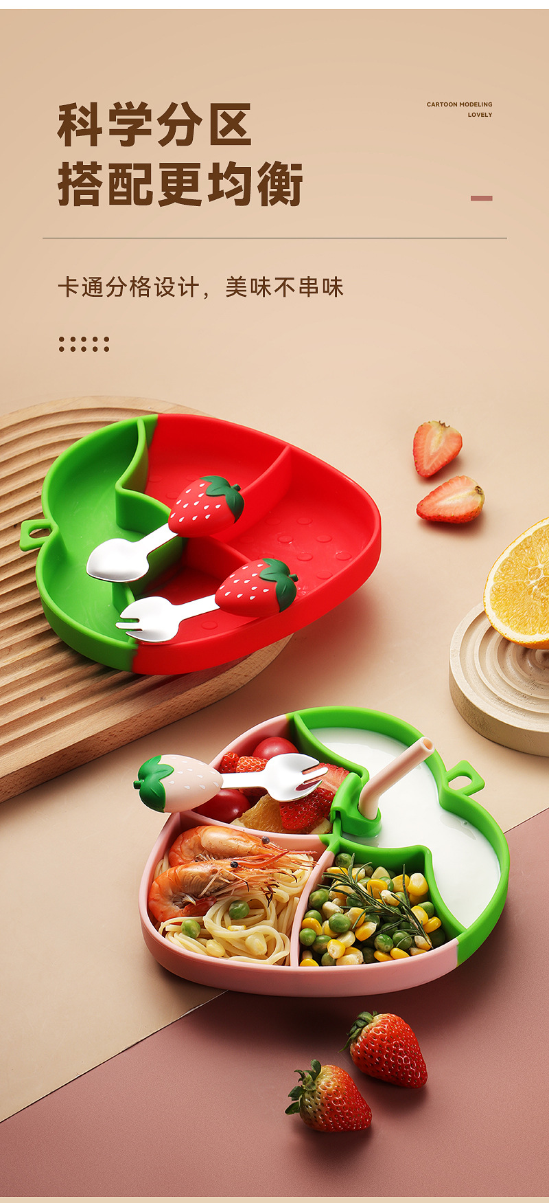 硅胶儿童餐盘草莓吸盘式304不锈钢叉勺婴儿宝宝辅食分格餐盘 套装