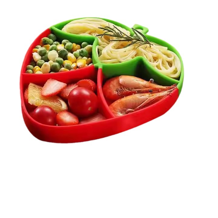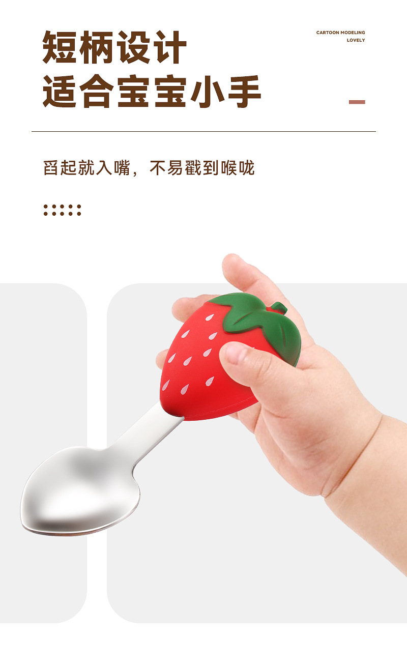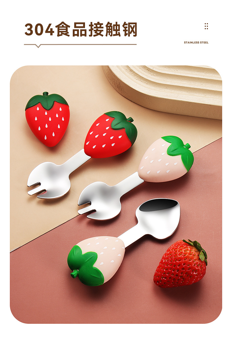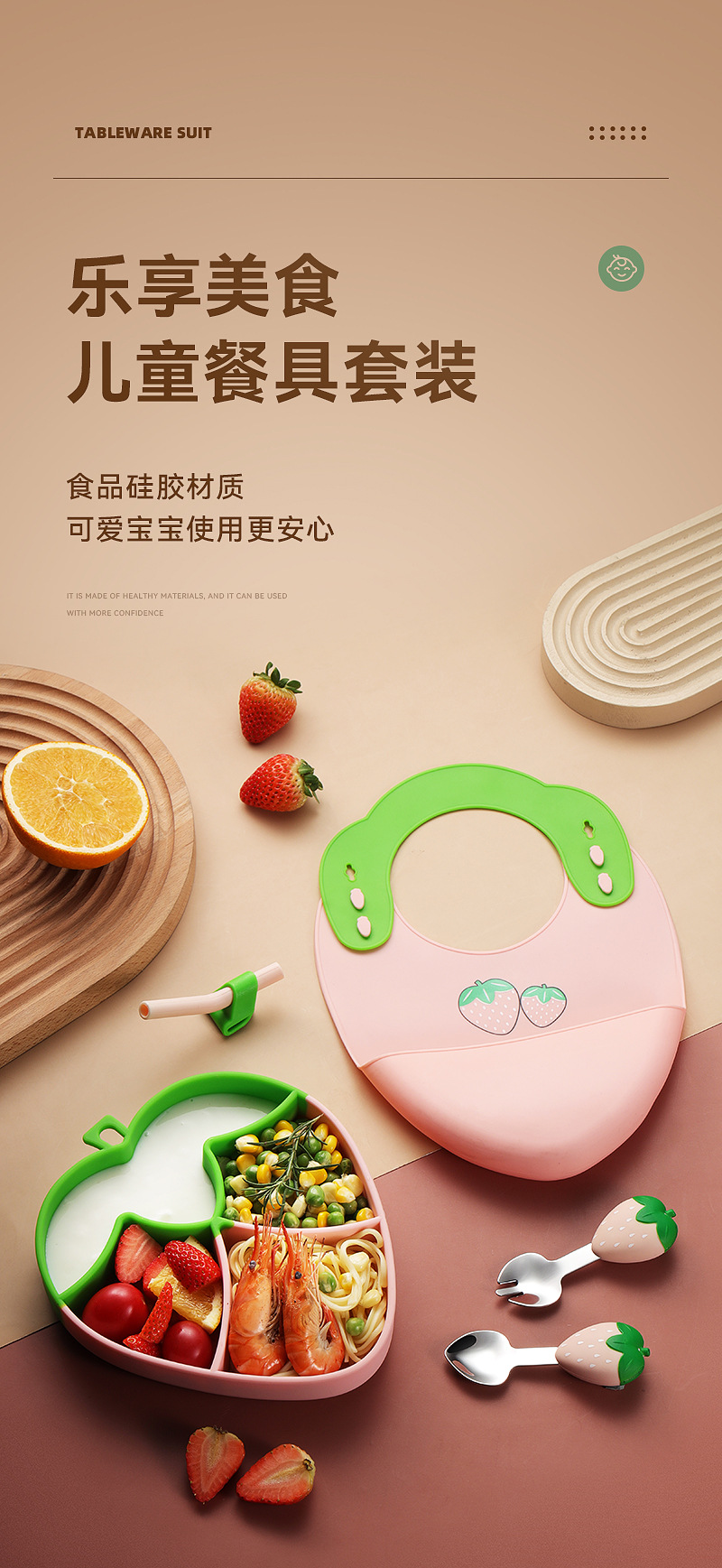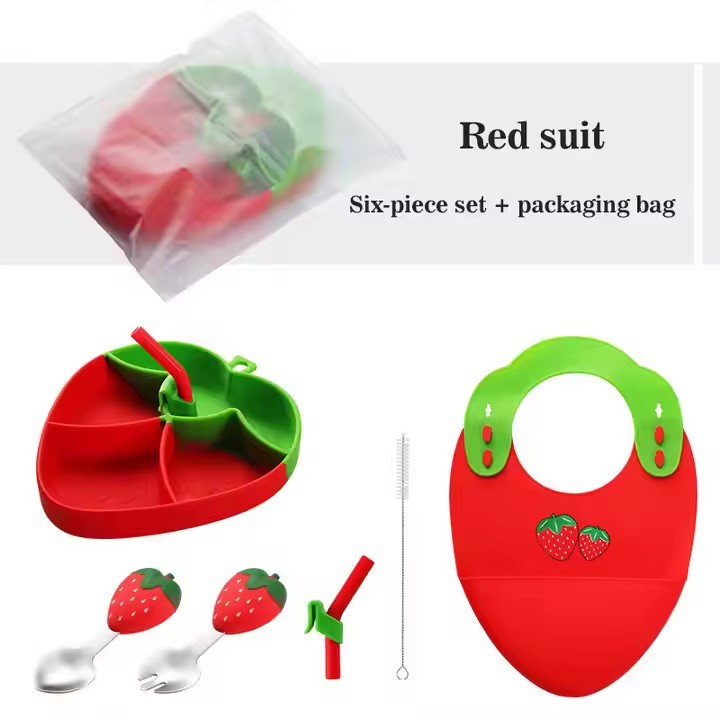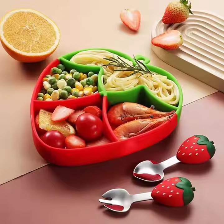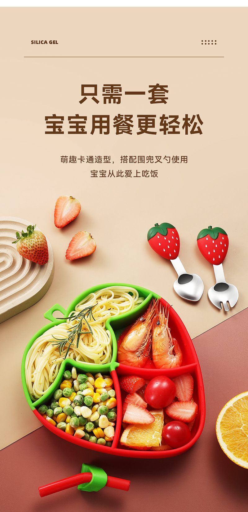 硅胶儿童餐盘草莓吸盘式304不锈钢叉勺婴儿宝宝辅食分格餐盘 套装
