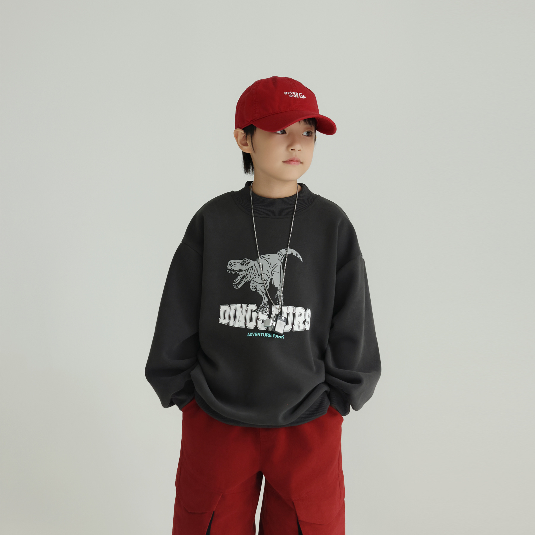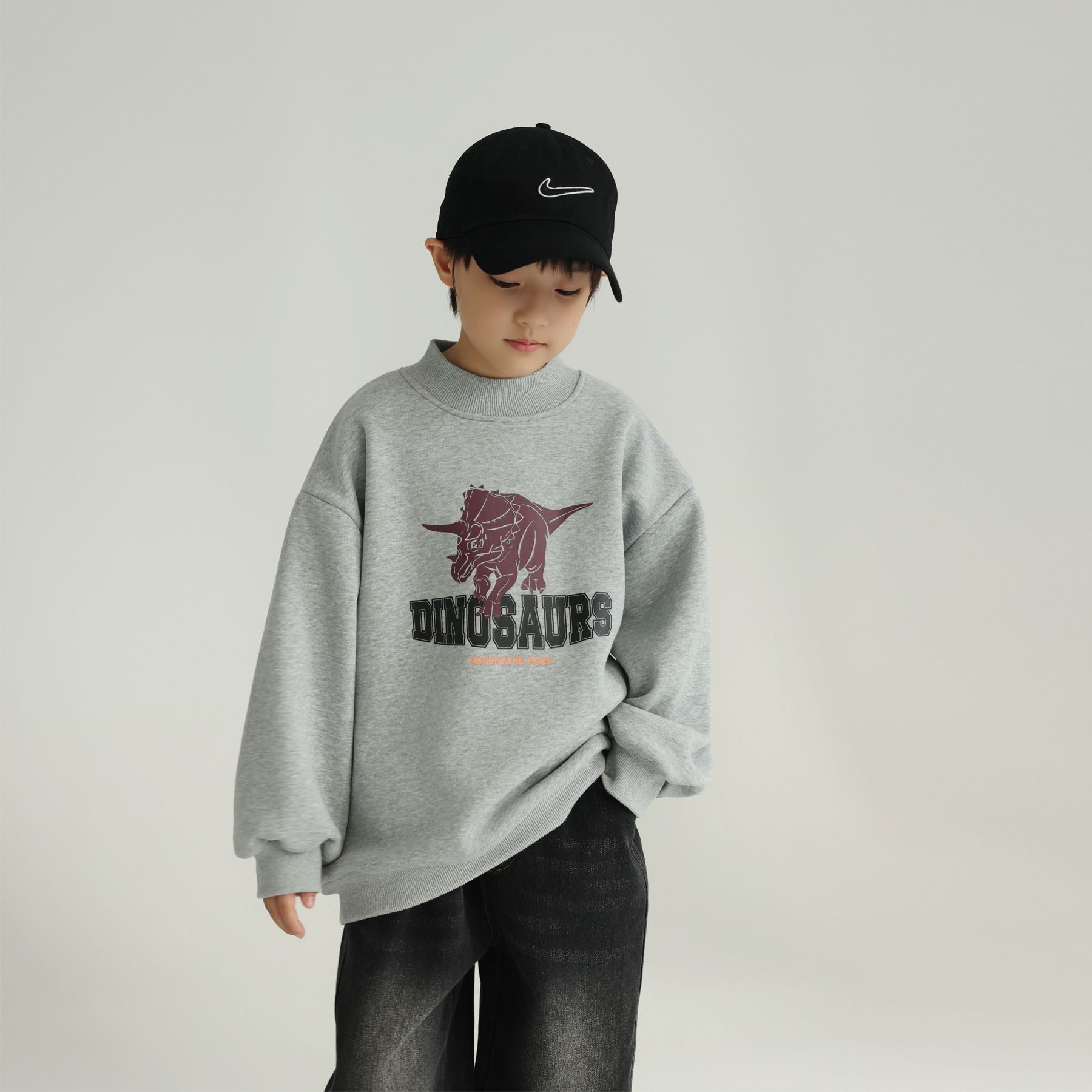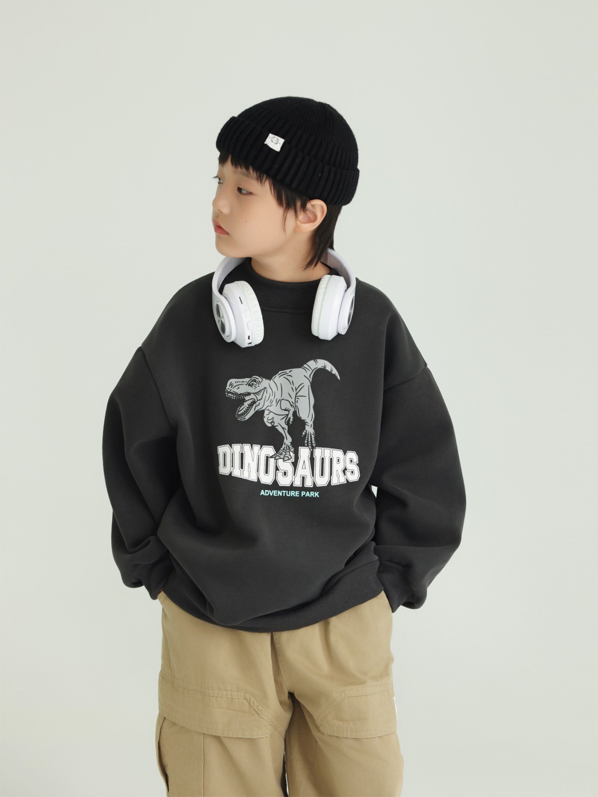 2024冬季新款中大童加厚保暖上衣男童洋气恐龙印花一体绒休闲卫衣