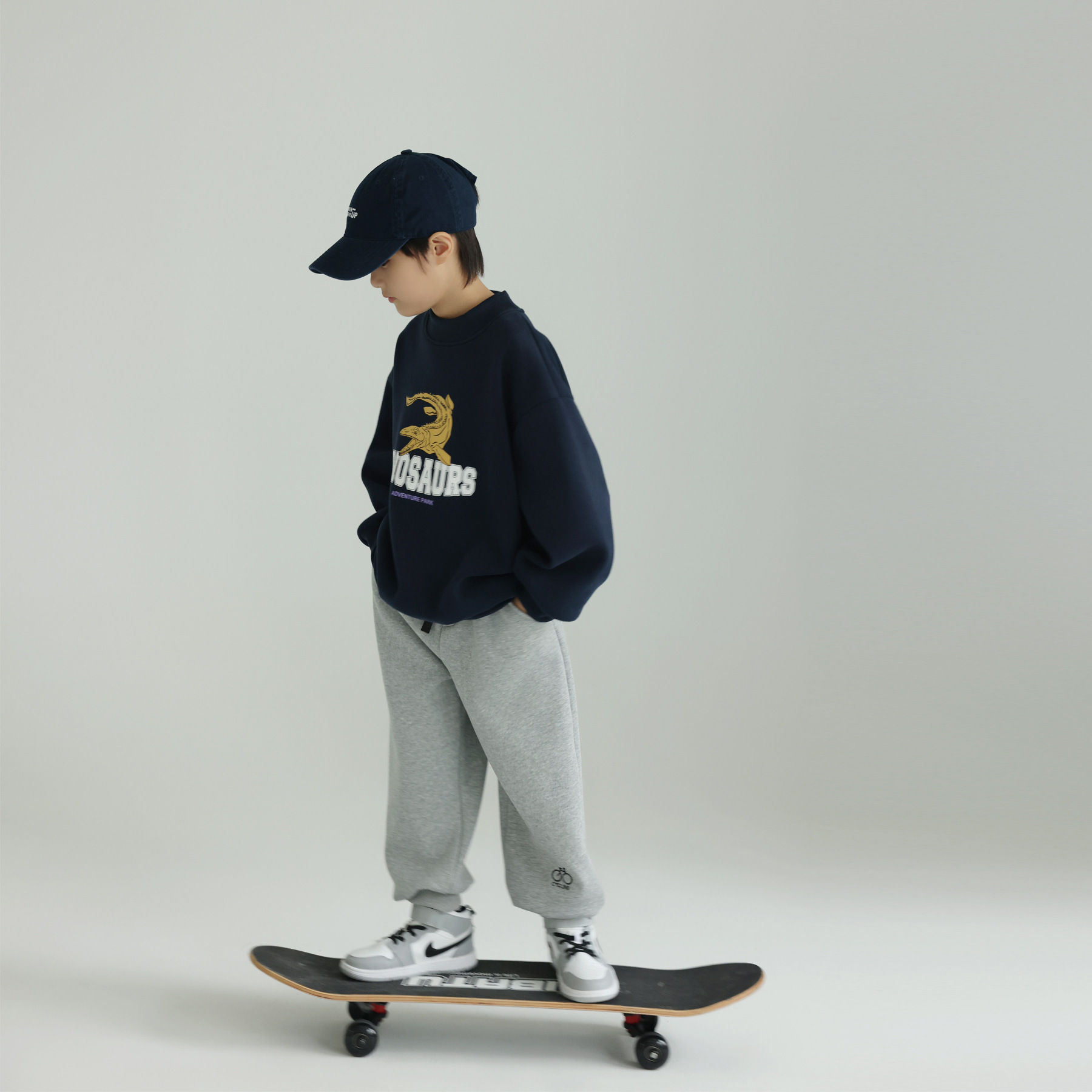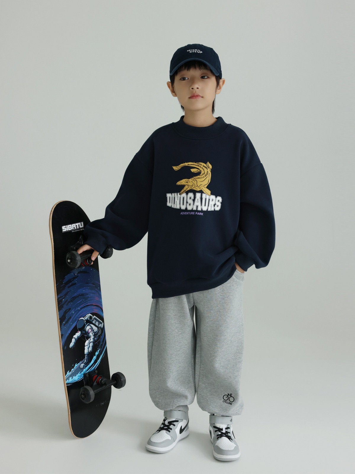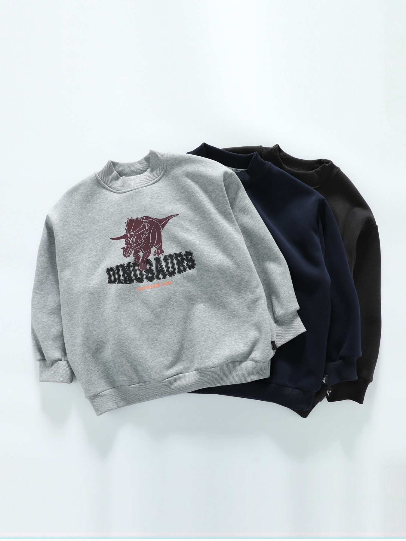 2024冬季新款中大童加厚保暖上衣男童洋气恐龙印花一体绒休闲卫衣
