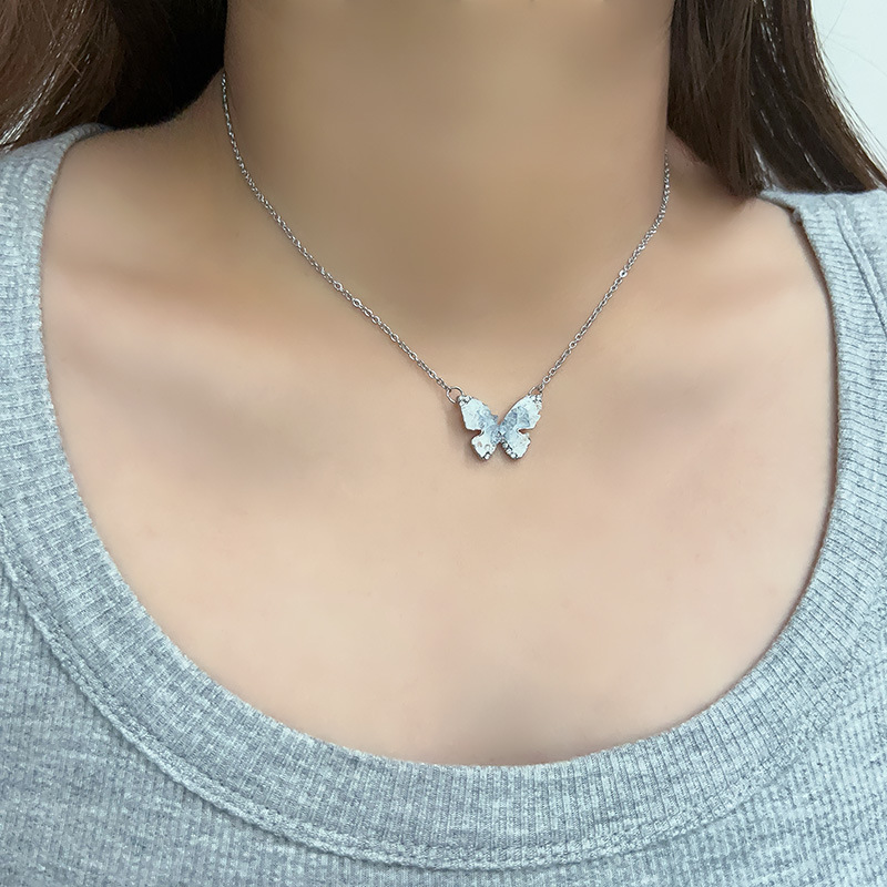日常百搭S925纯银海蓝宝蝴蝶项链女不掉色小众高级感轻奢锁骨链新