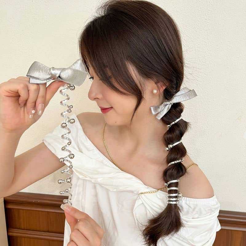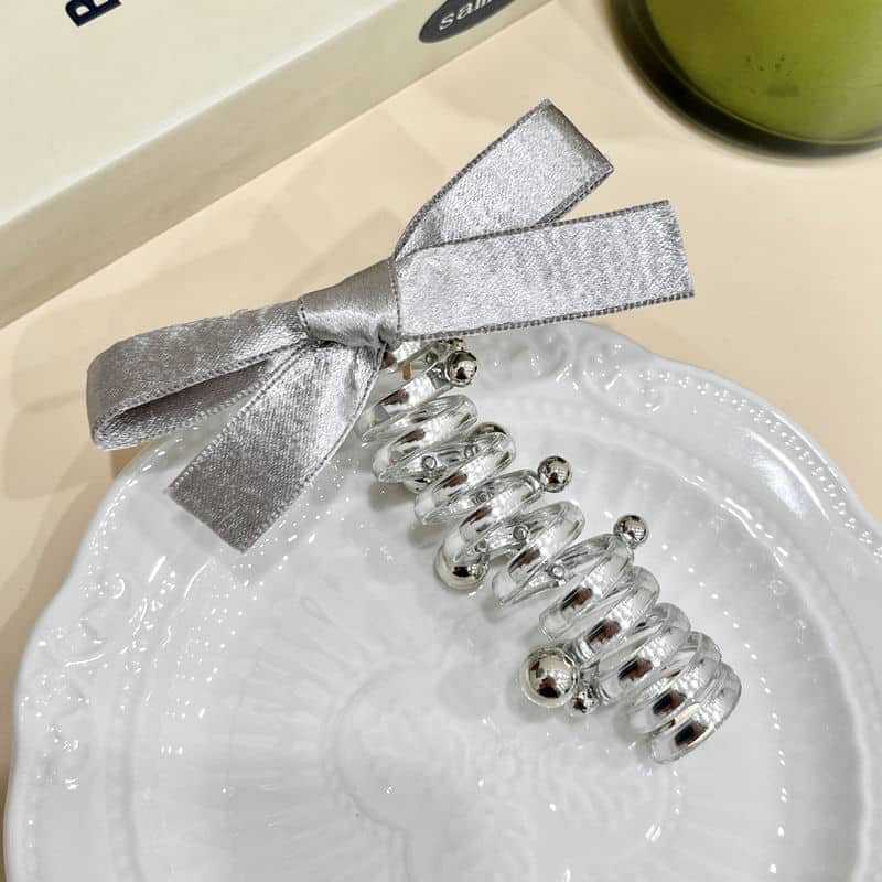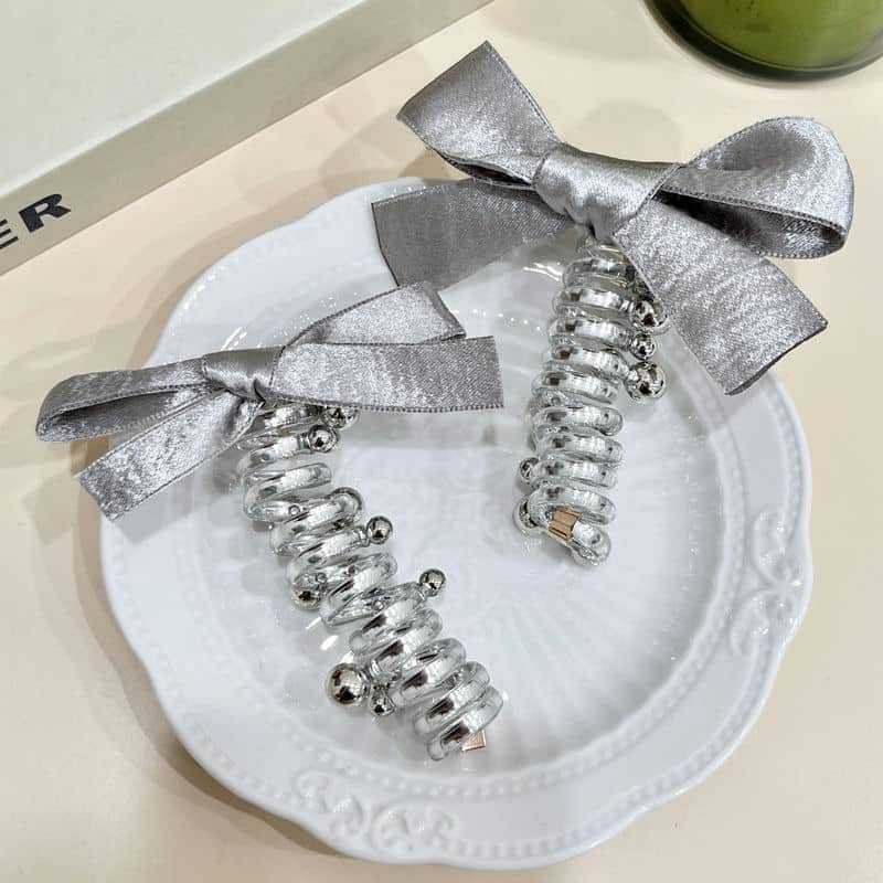 银色蝴蝶结电话线发圈高级感泡泡辫发绳扎马尾头绳甜美直条束发圈