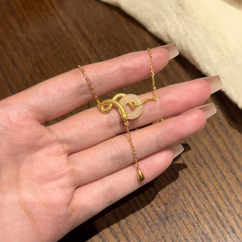 金色灵蛇白玉髓平安扣项链秋冬百搭精致蛇年钛钢不掉色锁骨链批发