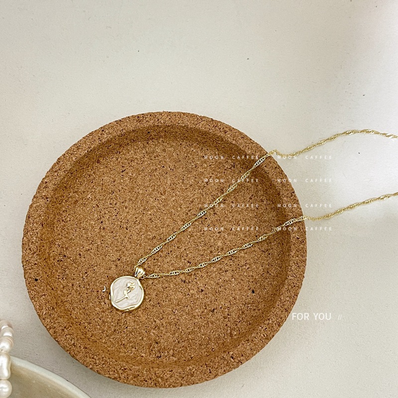 法式高雅珠光白色珐琅复古玫瑰花金币吊坠淡水真珍珠项链锁骨链女