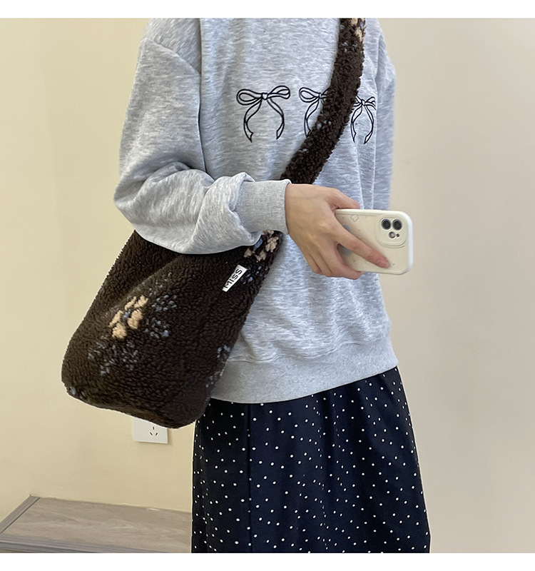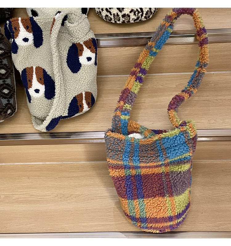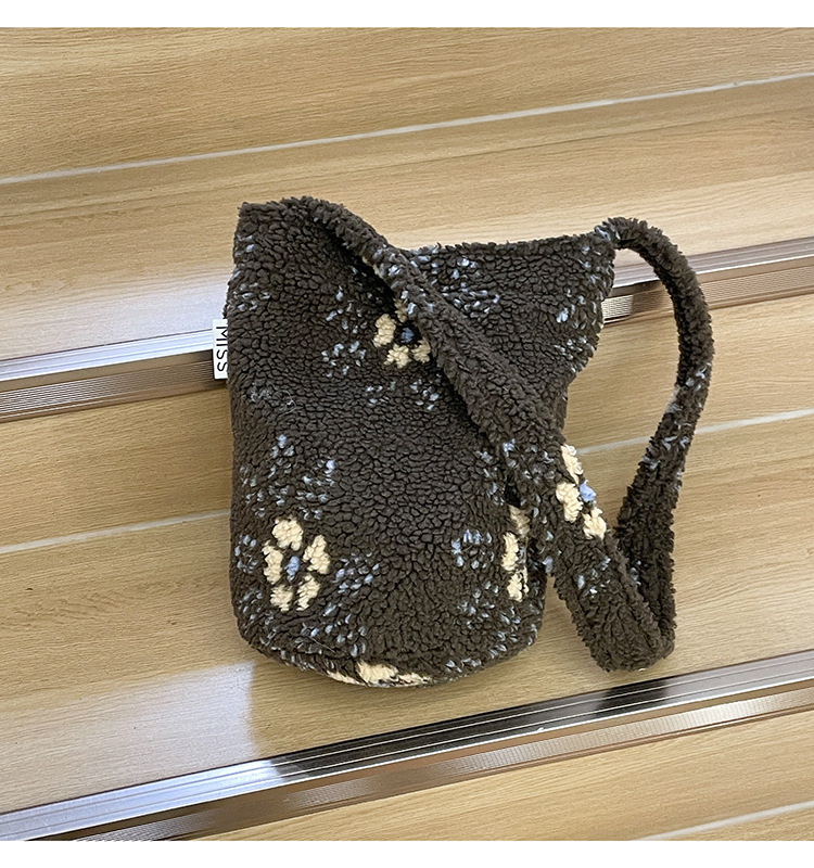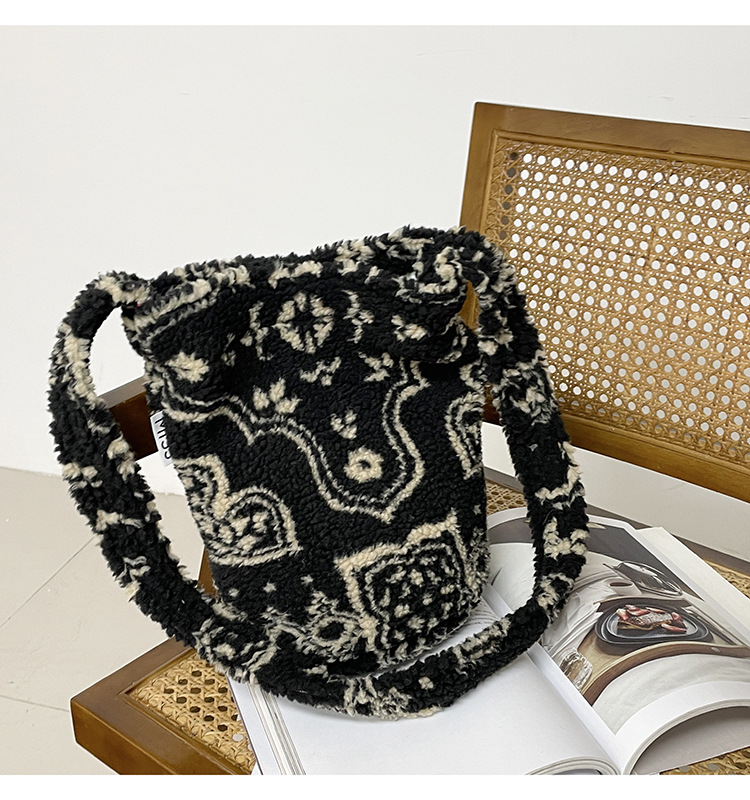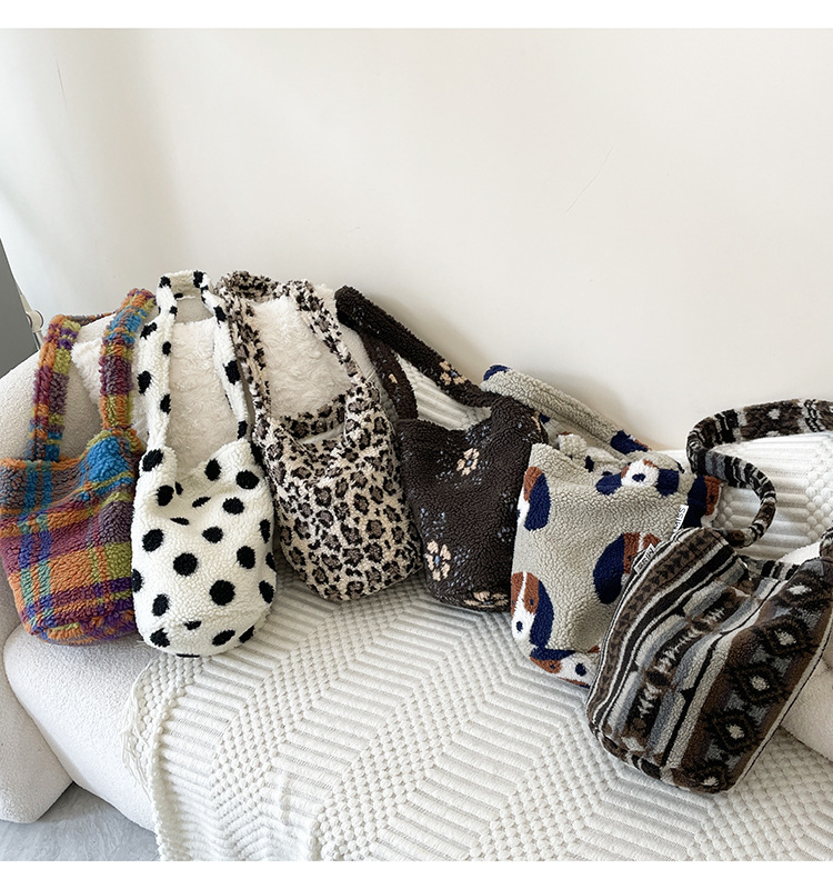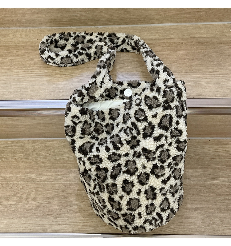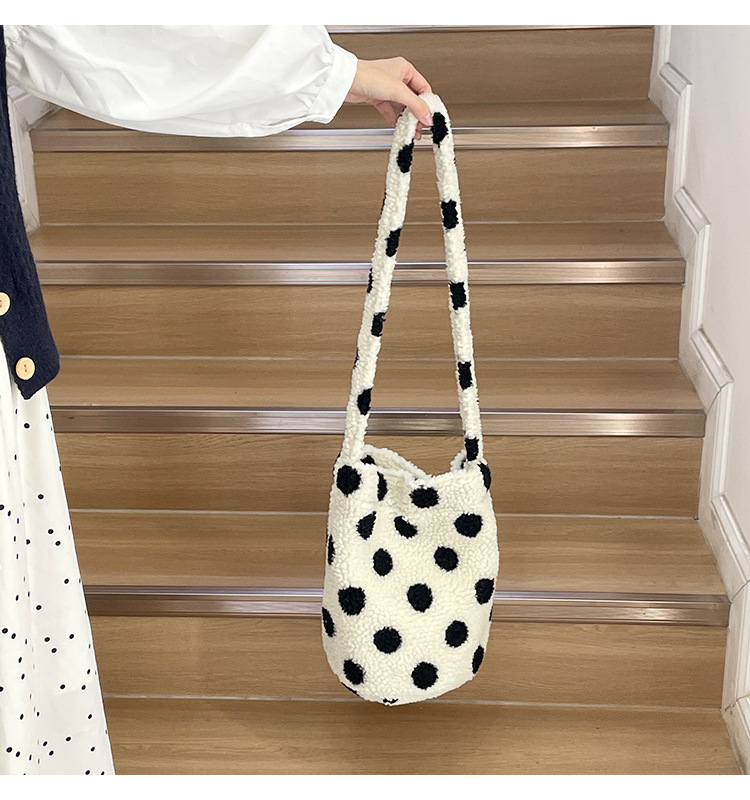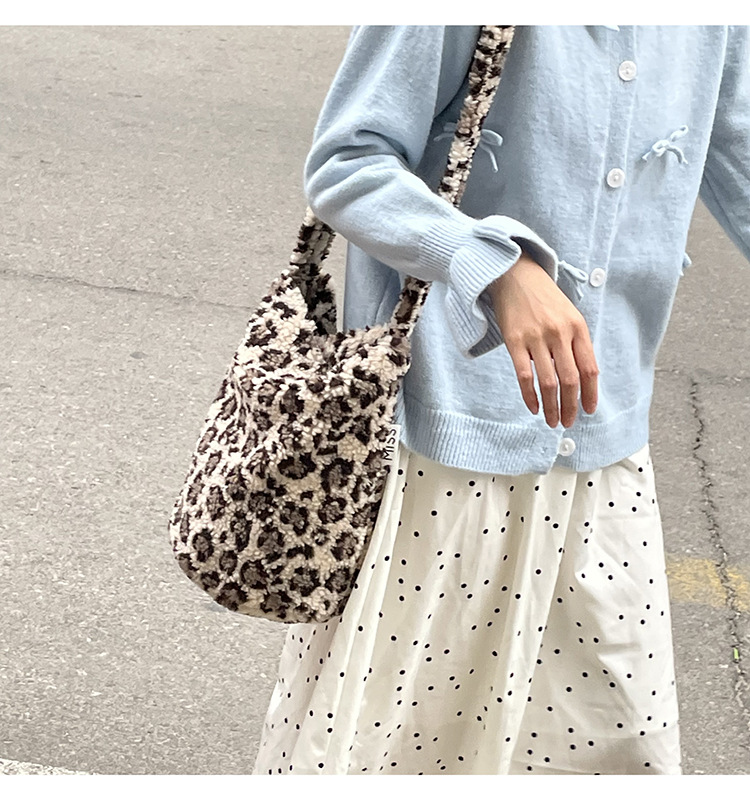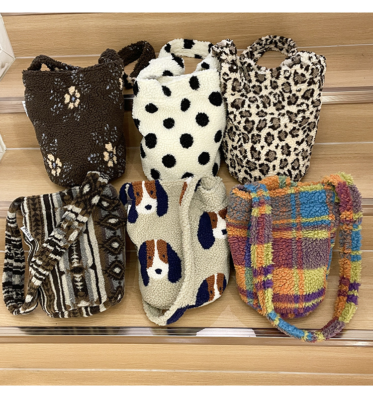 2024水桶包ins仿羊羔绒单肩包爱心豹纹波点图案毛绒斜挎包布袋