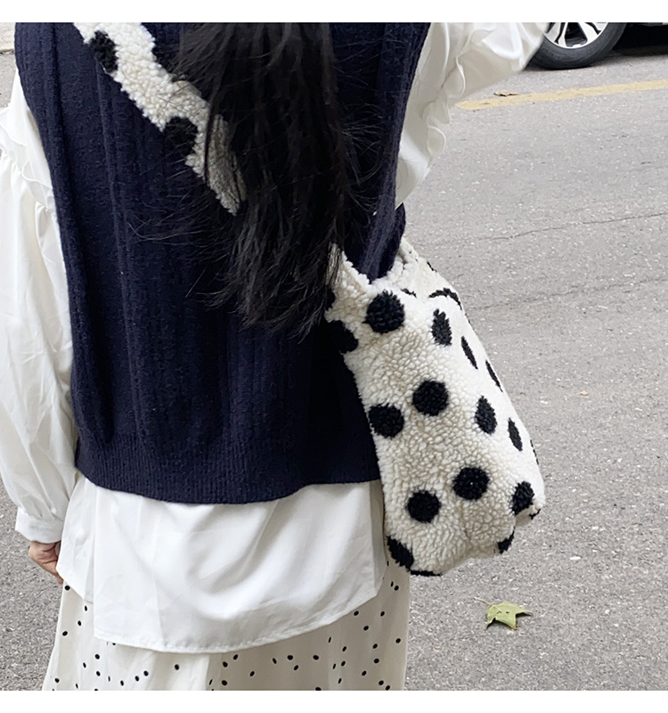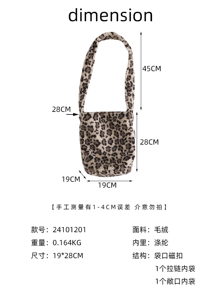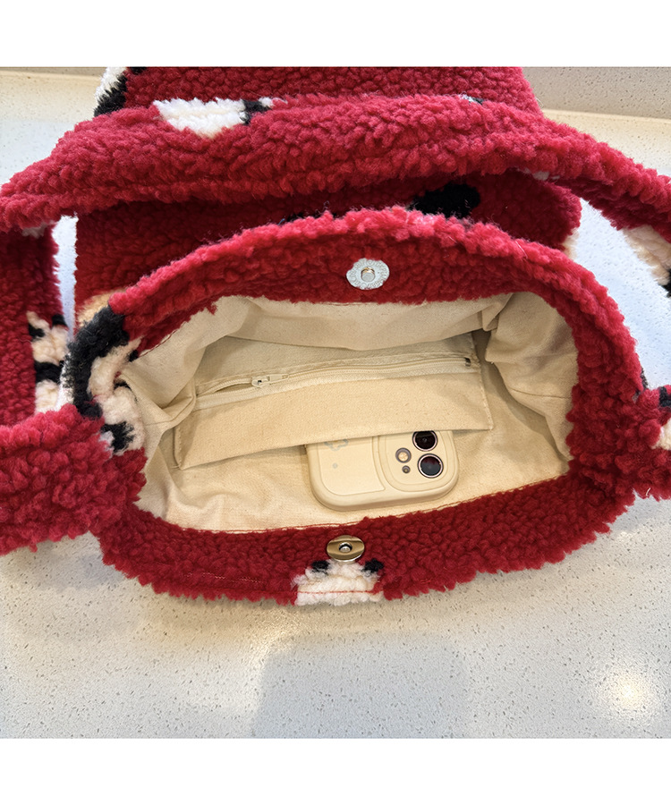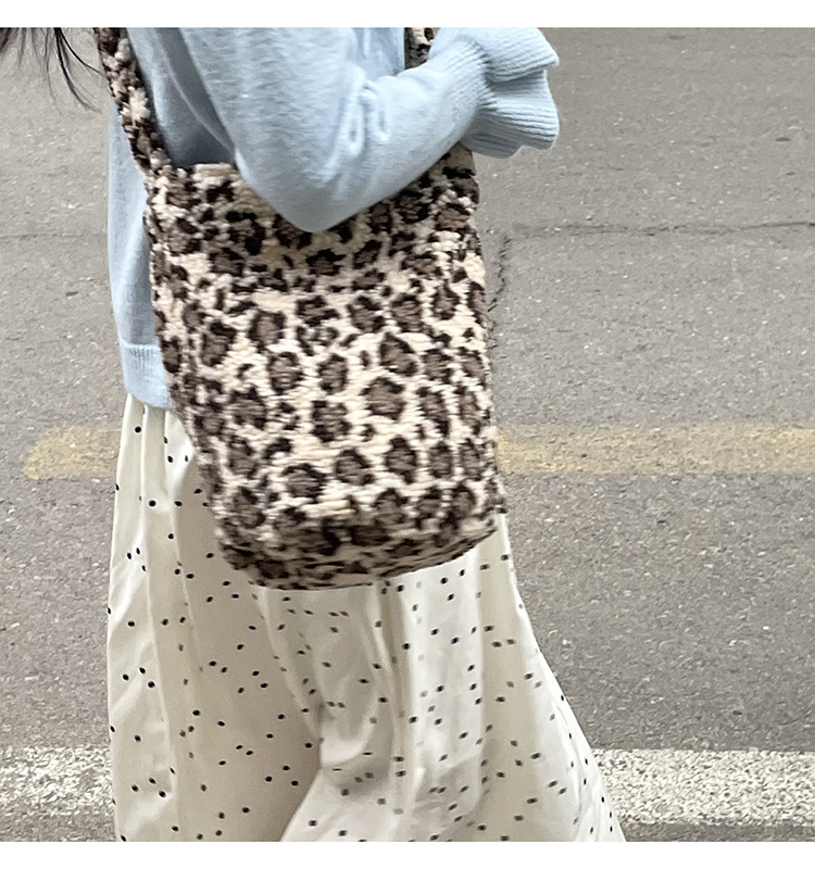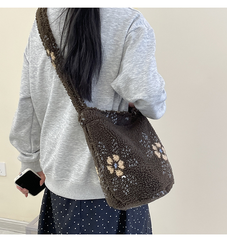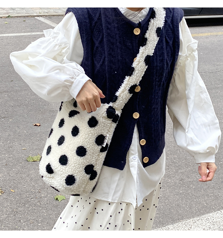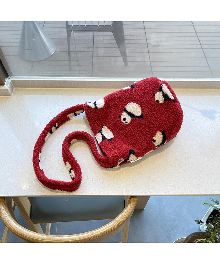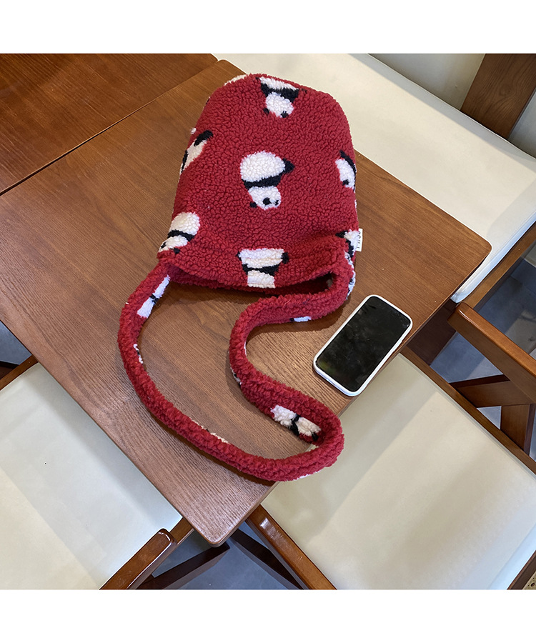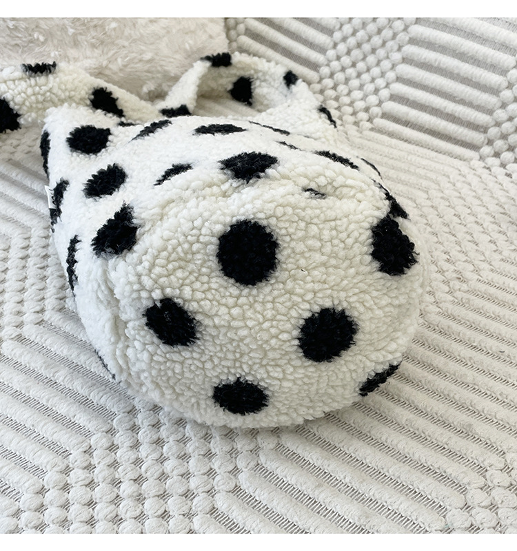 2024水桶包ins仿羊羔绒单肩包爱心豹纹波点图案毛绒斜挎包布袋