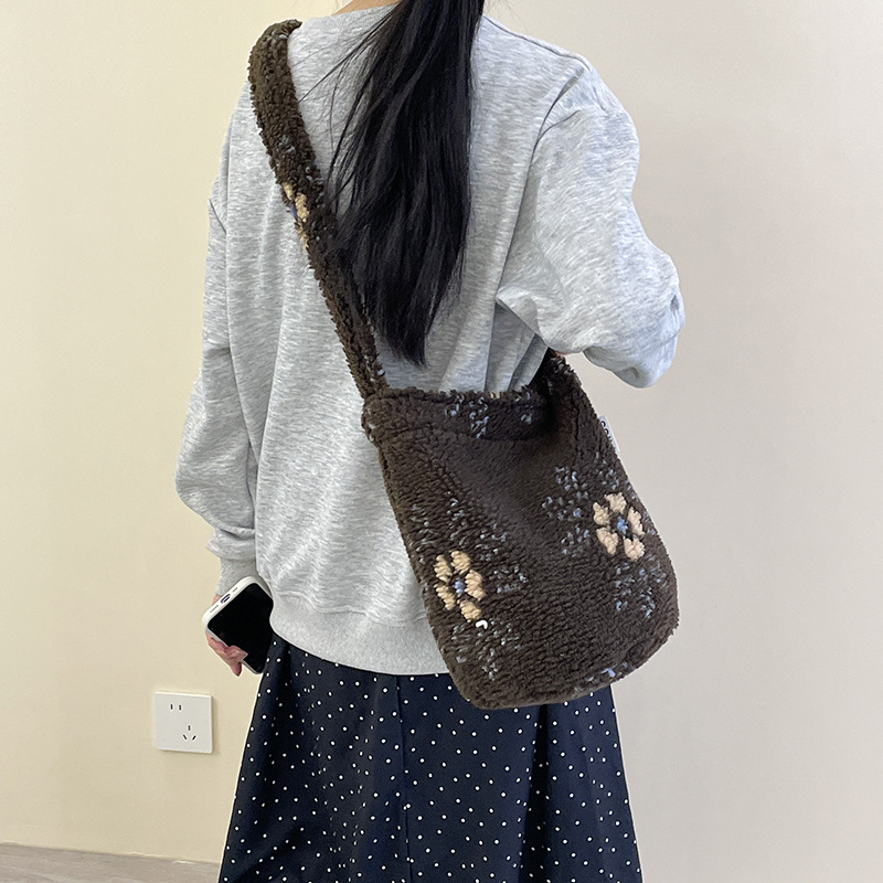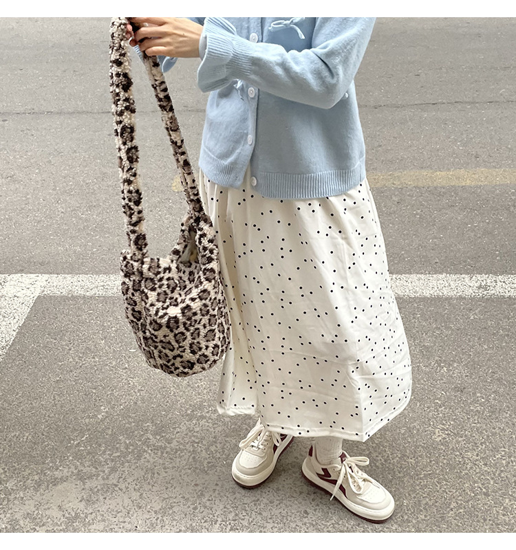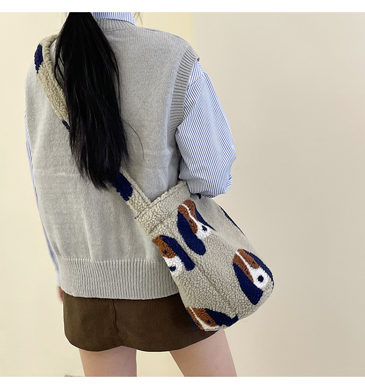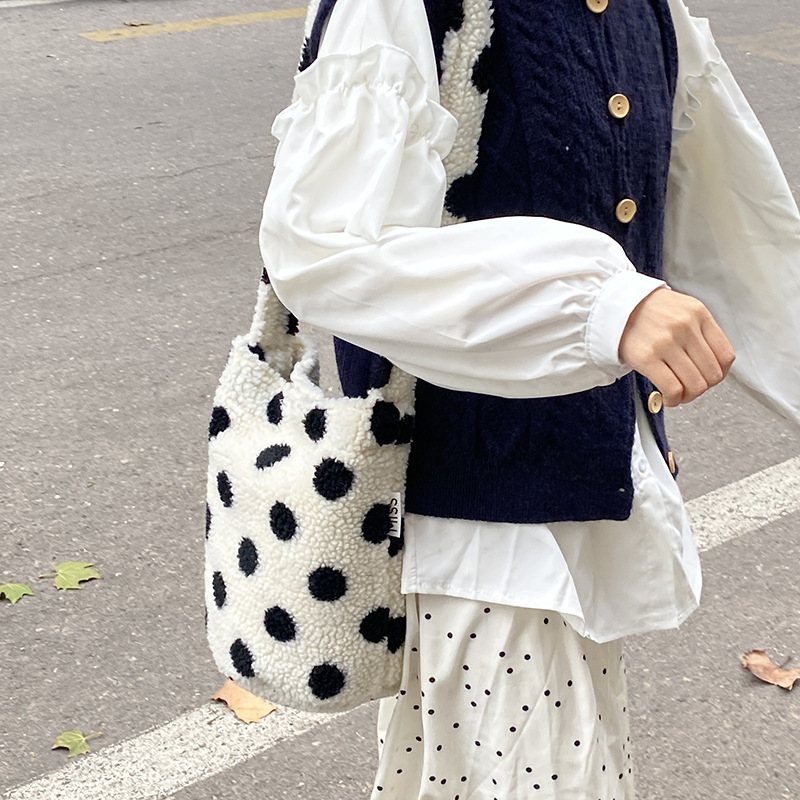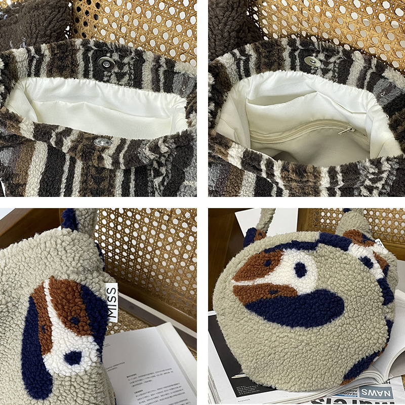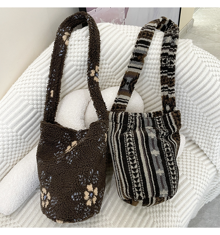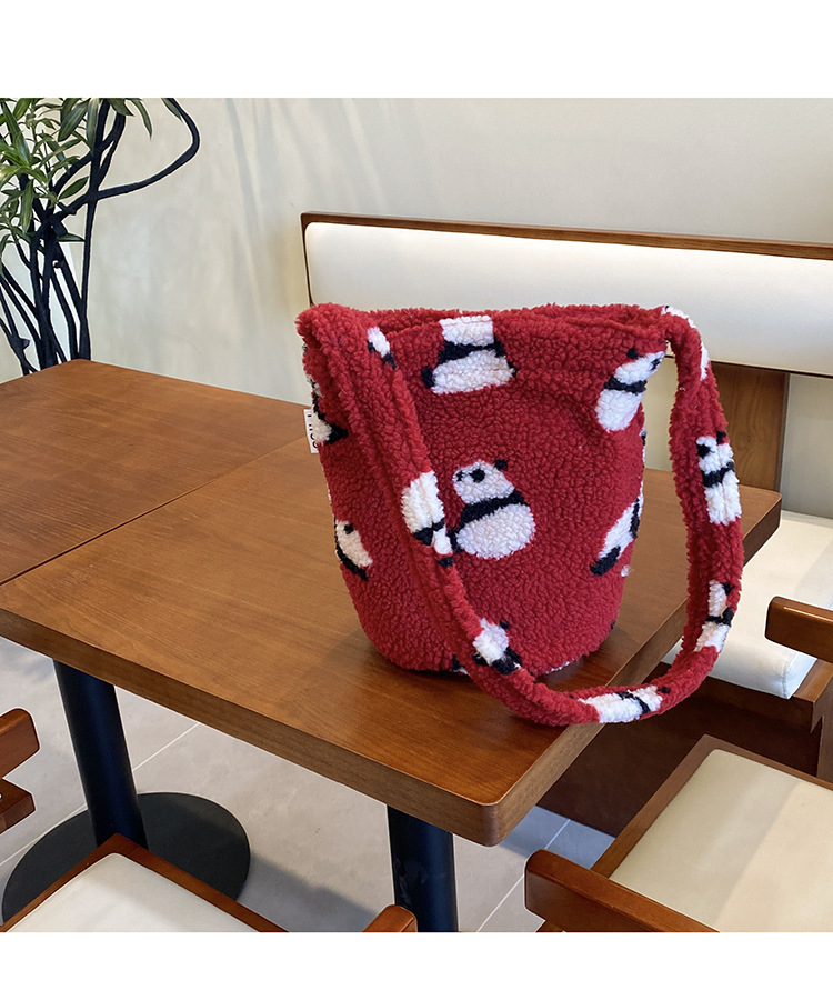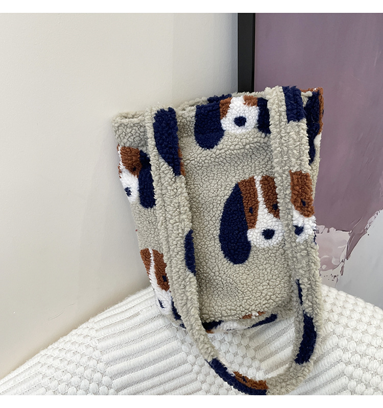 2024水桶包ins仿羊羔绒单肩包爱心豹纹波点图案毛绒斜挎包布袋