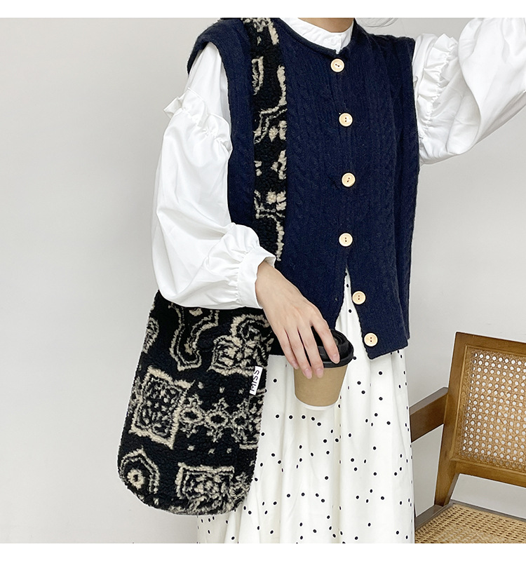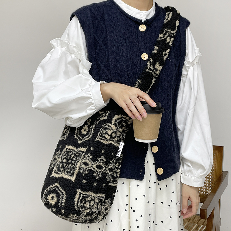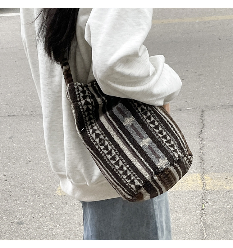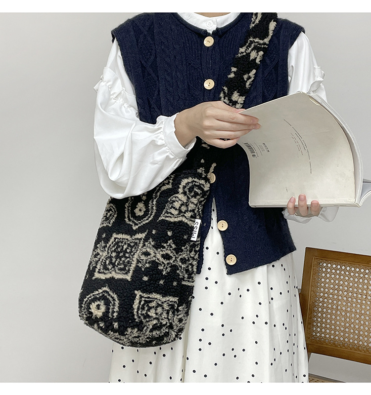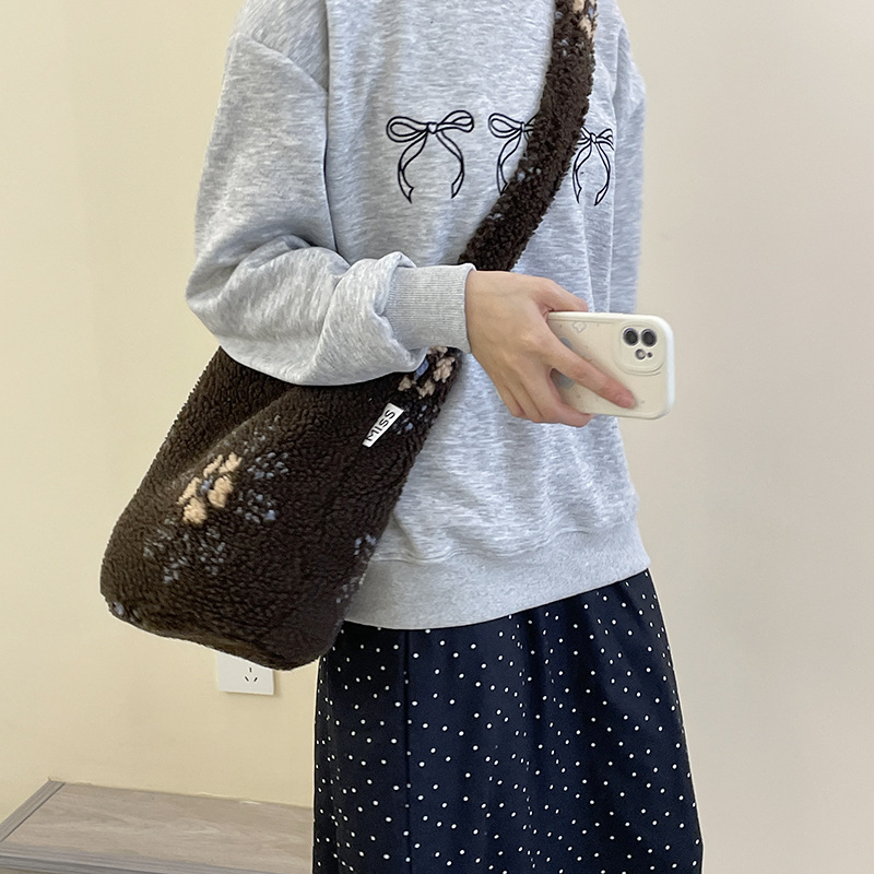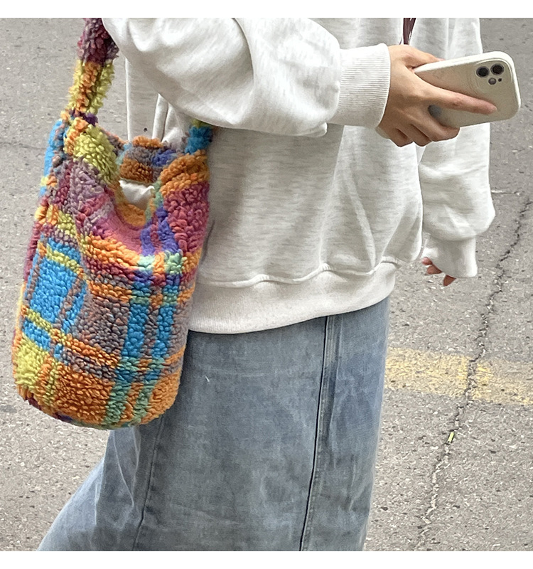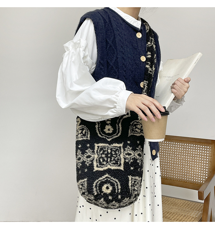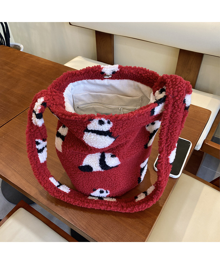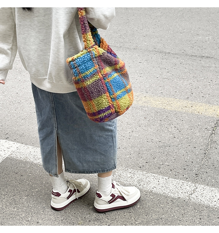 2024水桶包ins仿羊羔绒单肩包爱心豹纹波点图案毛绒斜挎包布袋