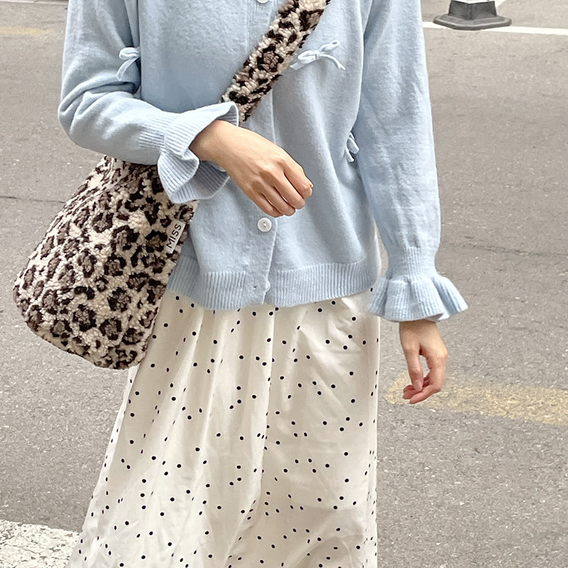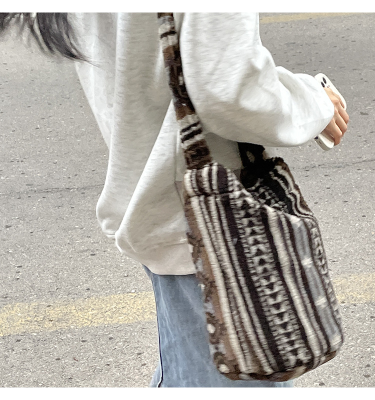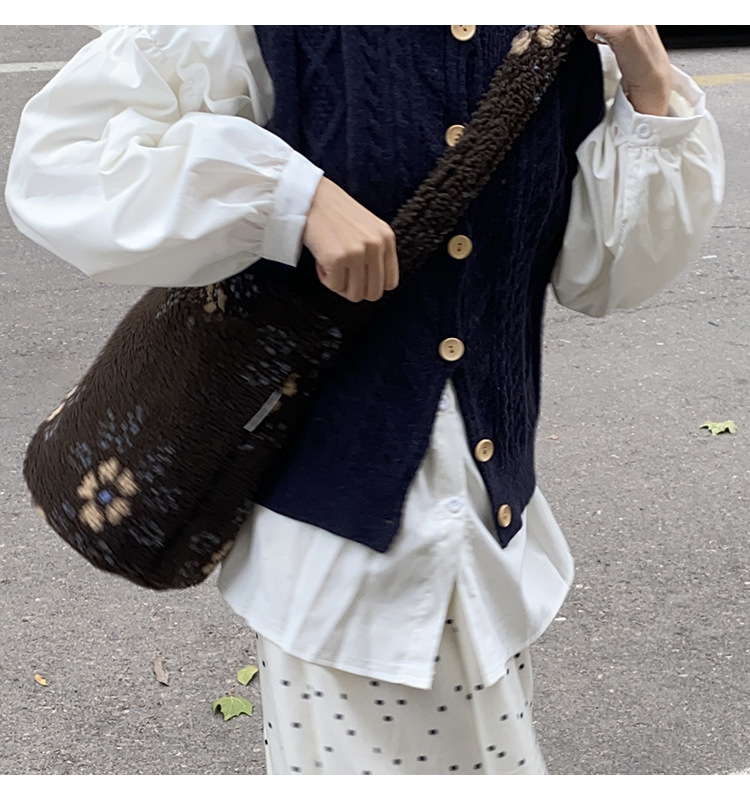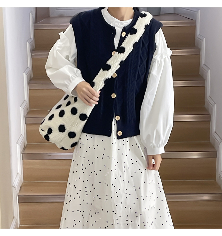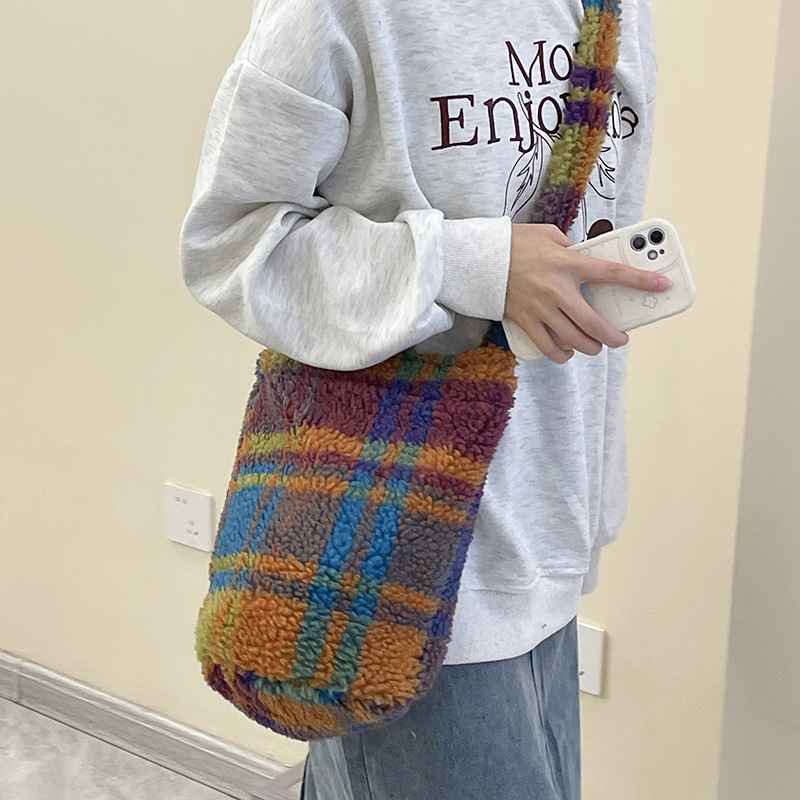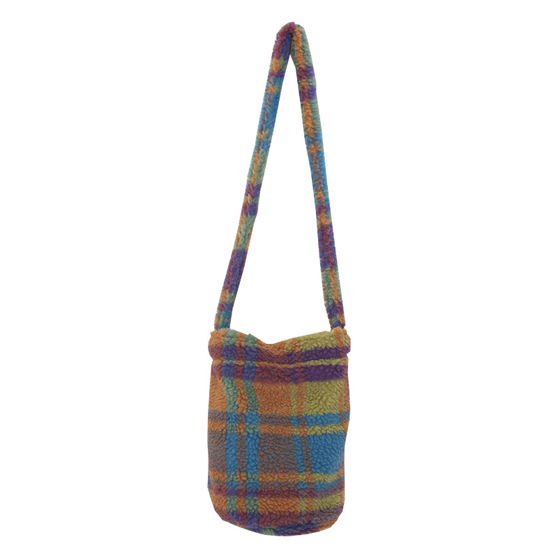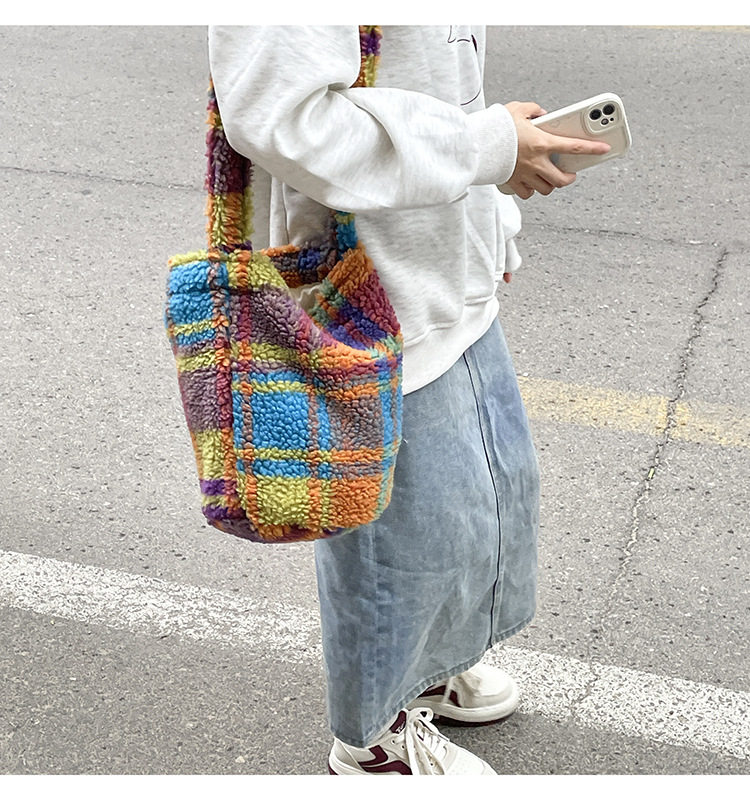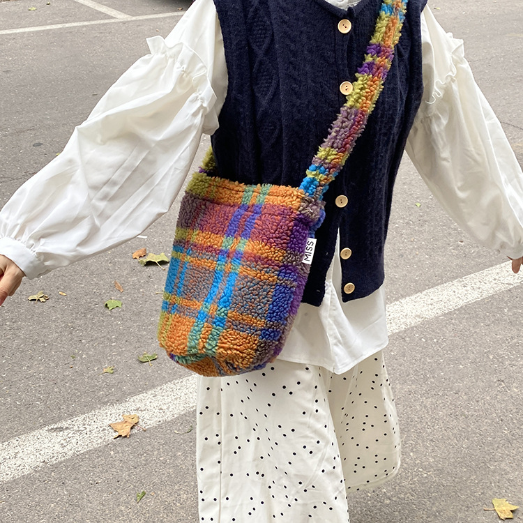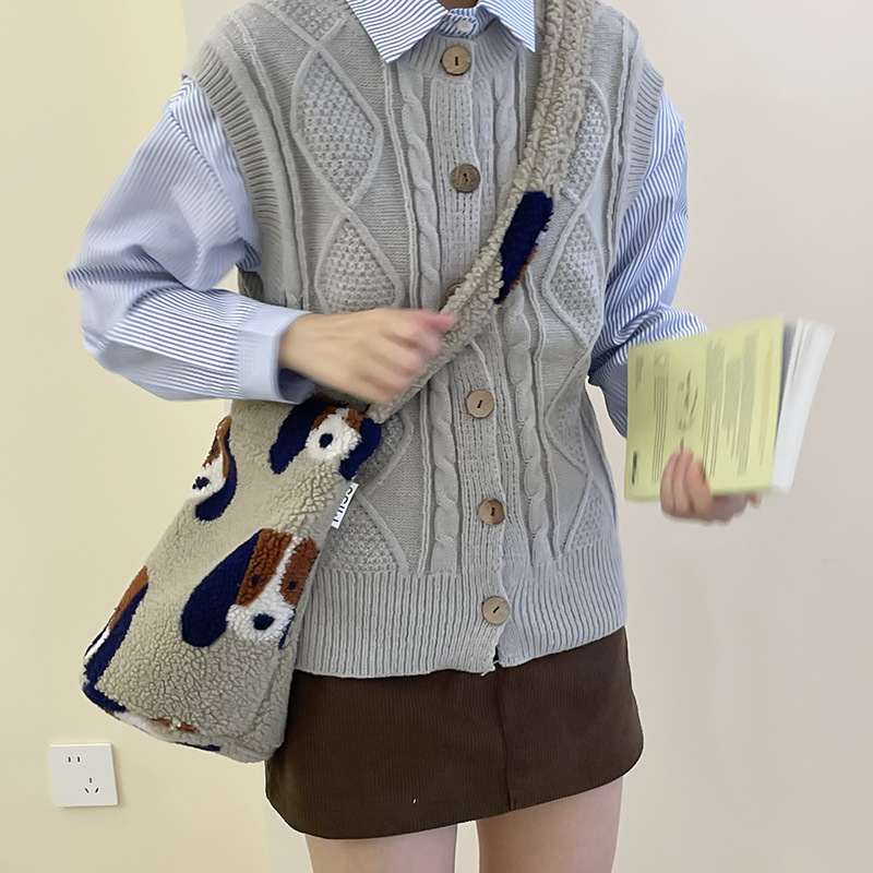 2024水桶包ins仿羊羔绒单肩包爱心豹纹波点图案毛绒斜挎包布袋