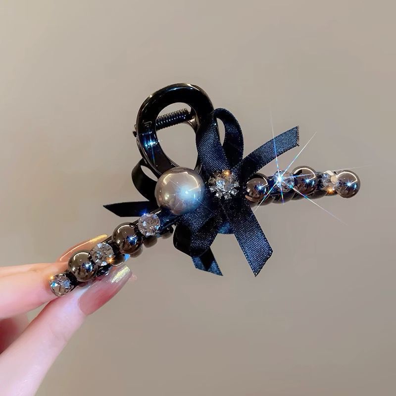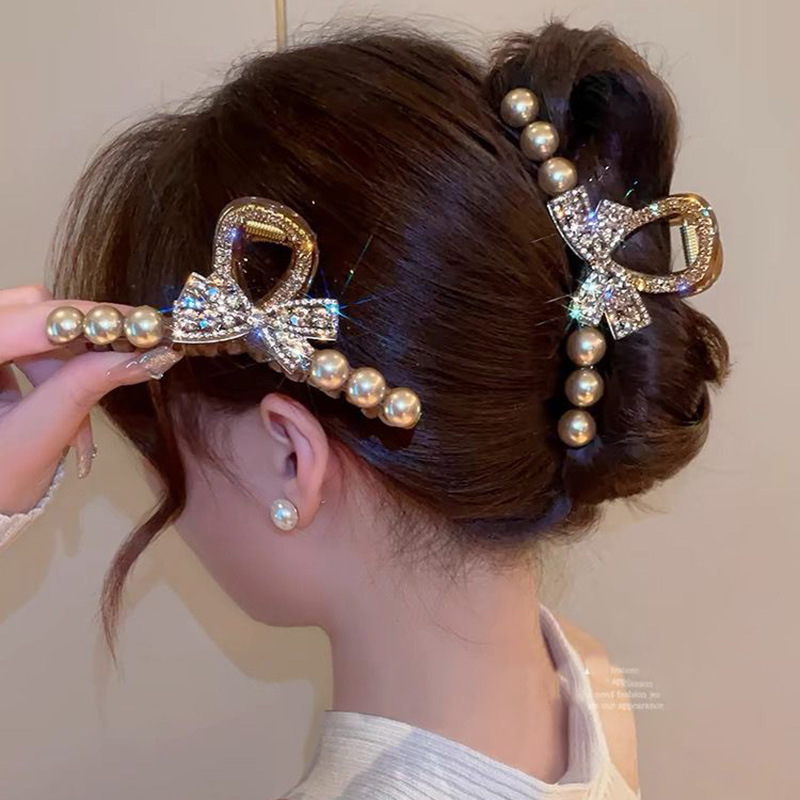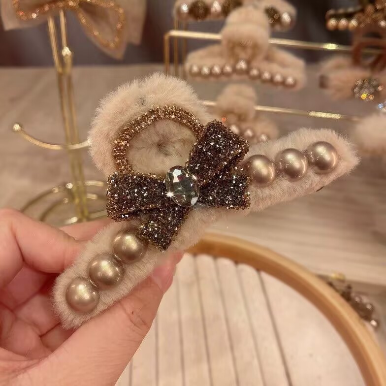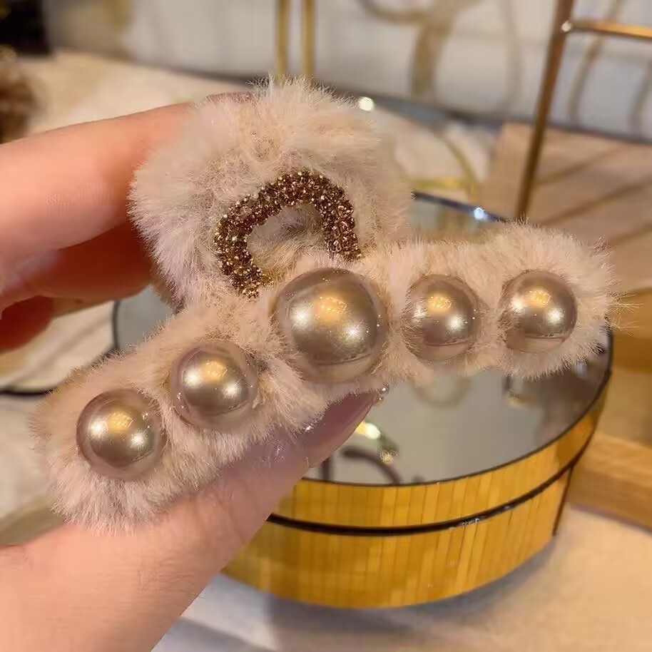 新款珍珠水貂毛抓夹字母水钻后脑勺发夹时尚百搭网红毛绒鲨鱼夹