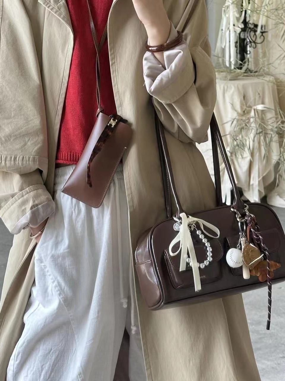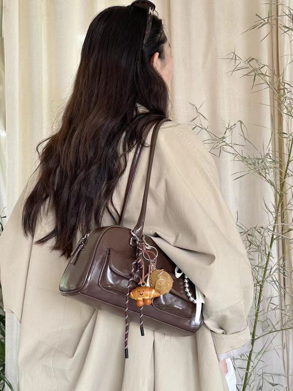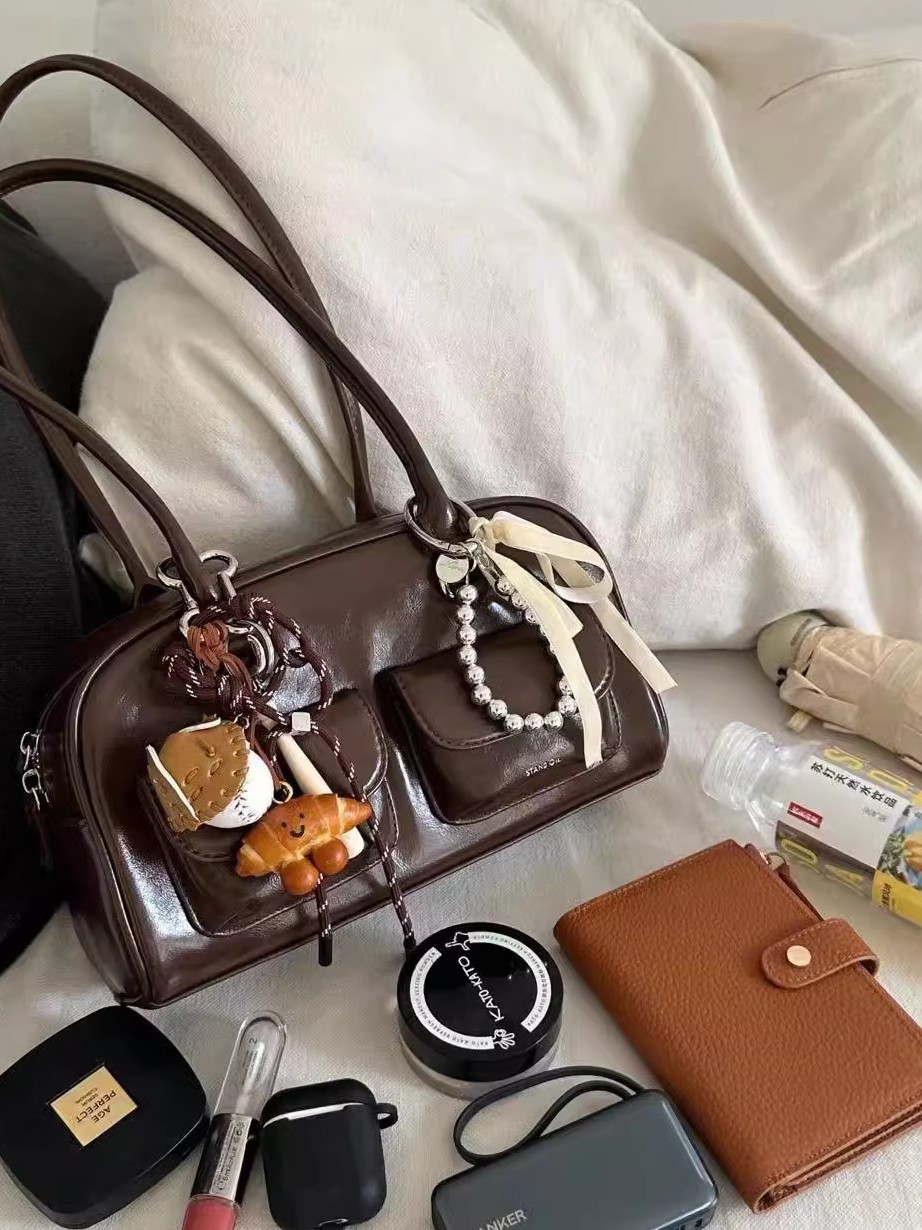 允真同款包包女2024秋冬新款韩国ins大容量复古保龄球手提单肩包
