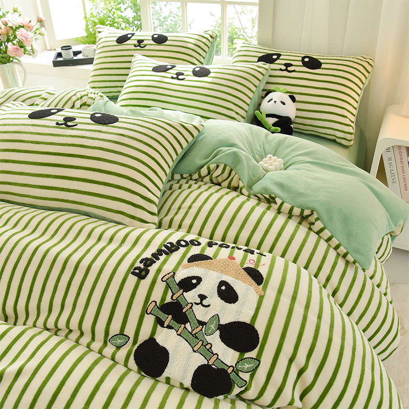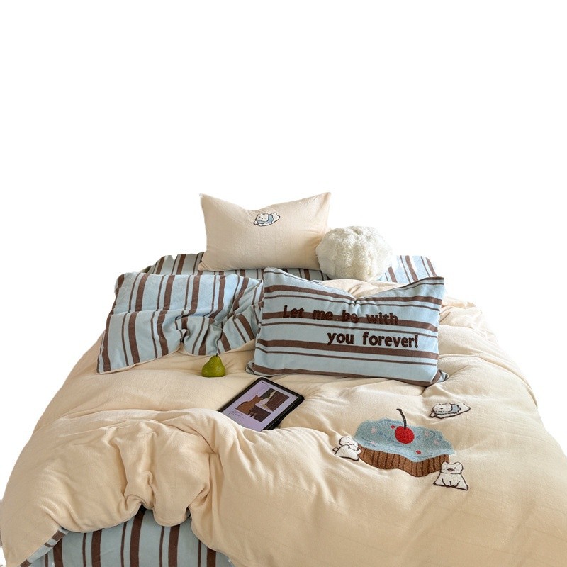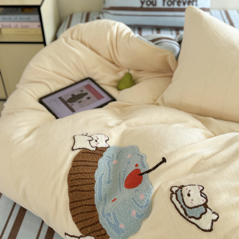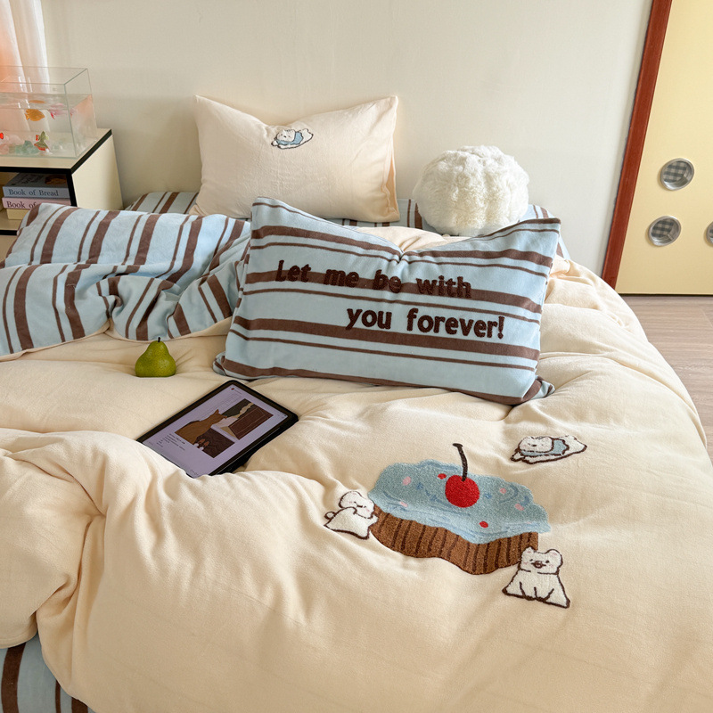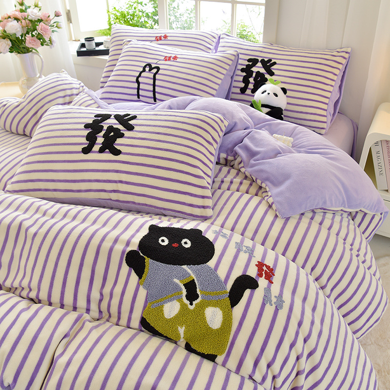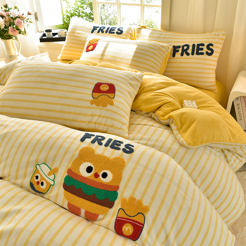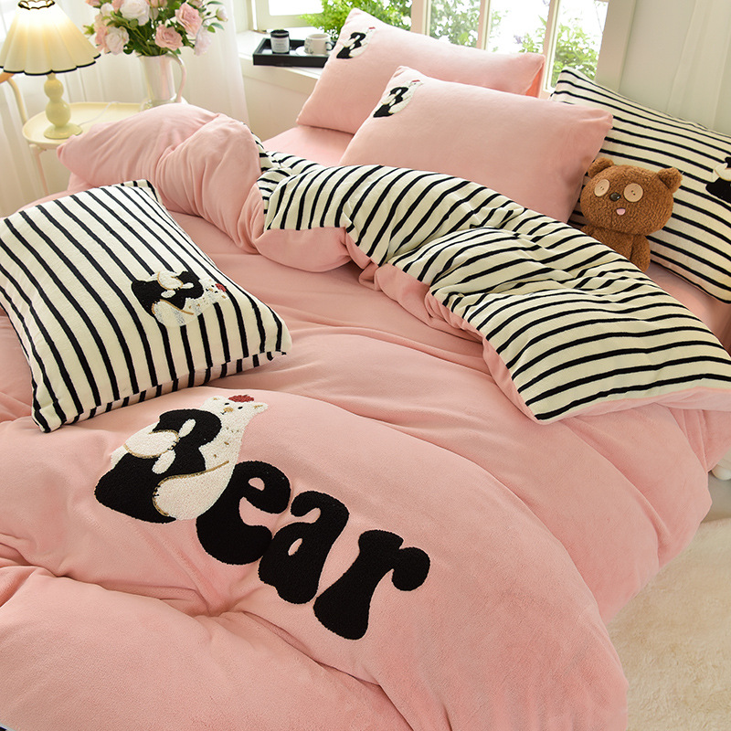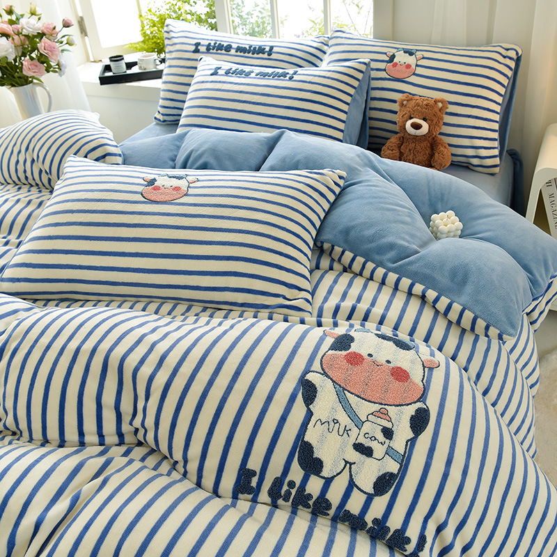 A类加厚牛奶绒四件套冬季可爱卡通刺绣珊瑚绒法兰绒床单被套床笠