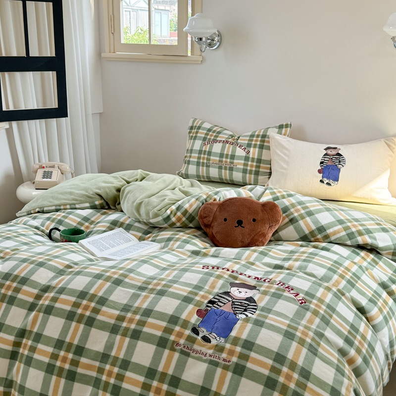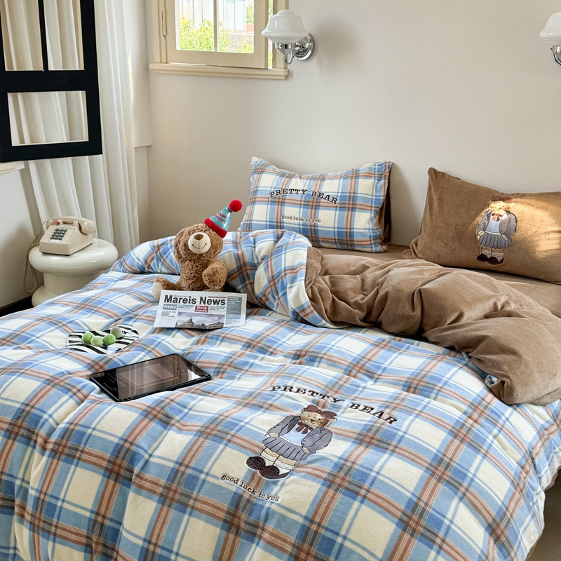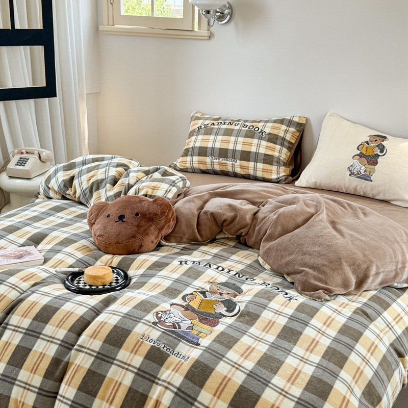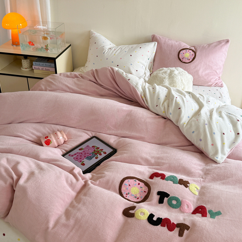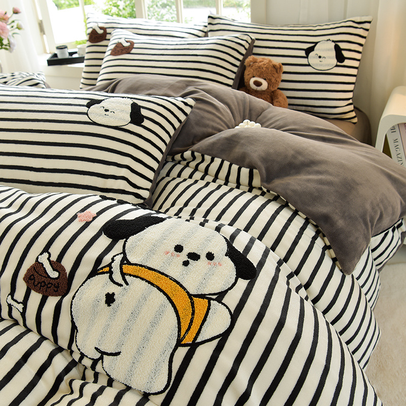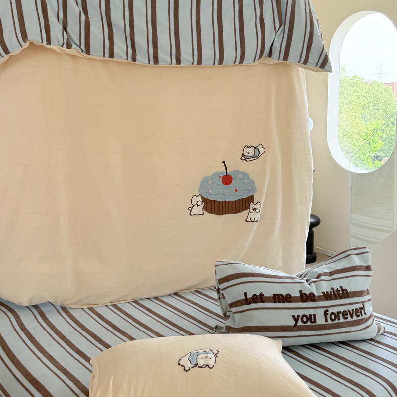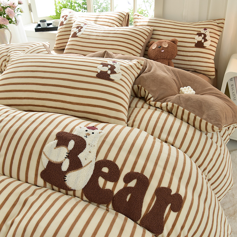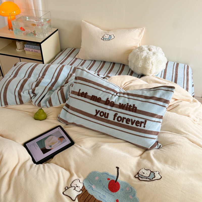 A类加厚牛奶绒四件套冬季可爱卡通刺绣珊瑚绒法兰绒床单被套床笠