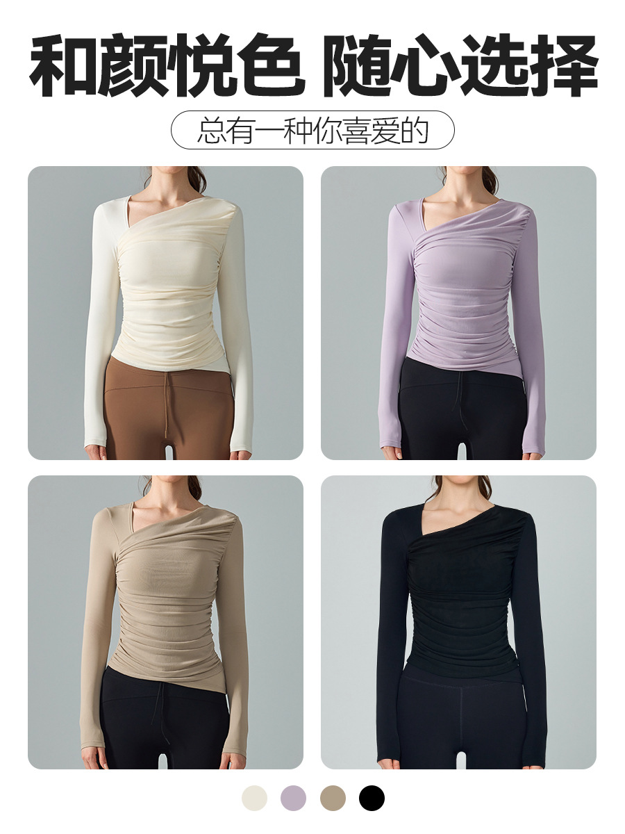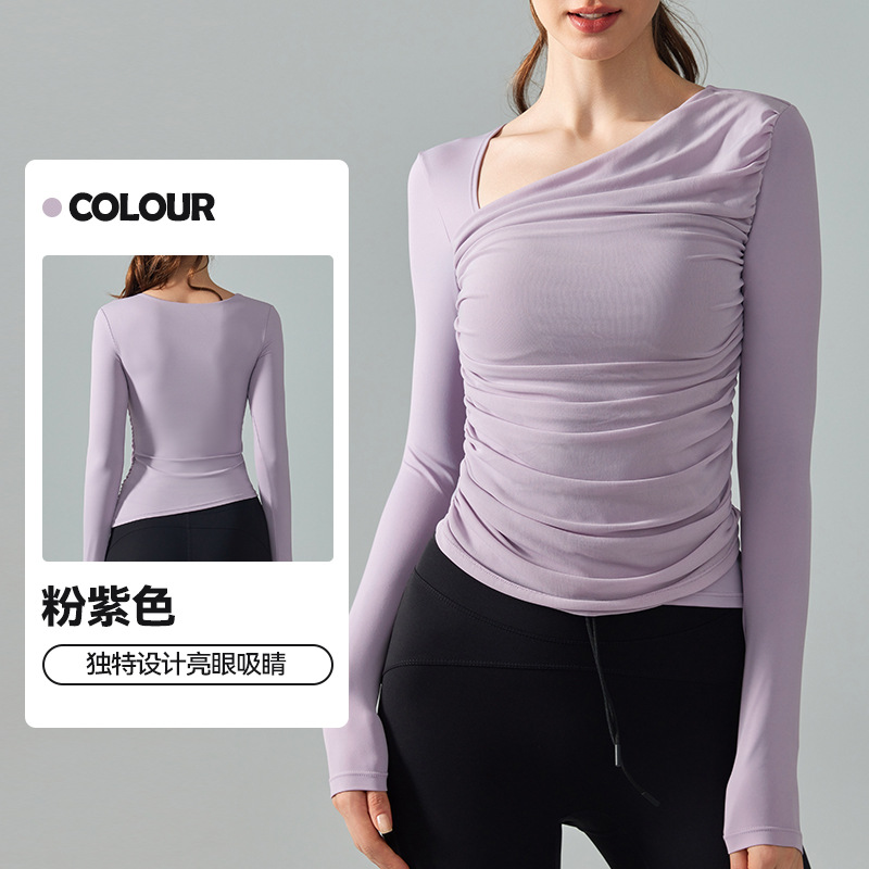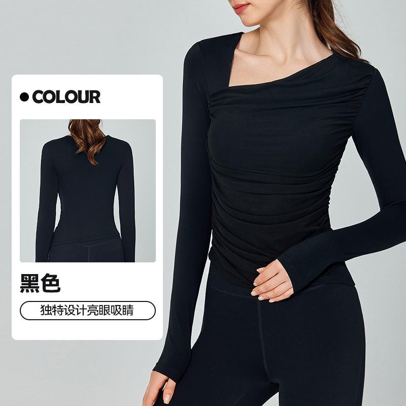 欧美斜领瑜伽长袖T恤女网纱拼接带胸垫运动上衣时尚显瘦健身上衣
