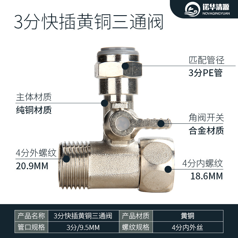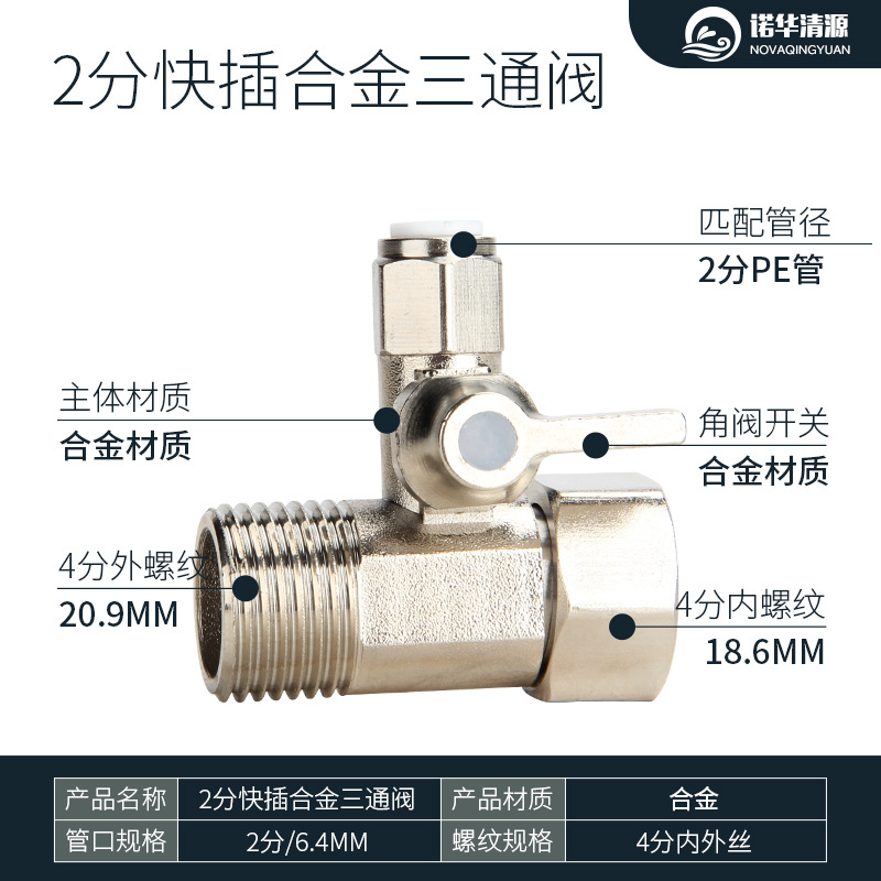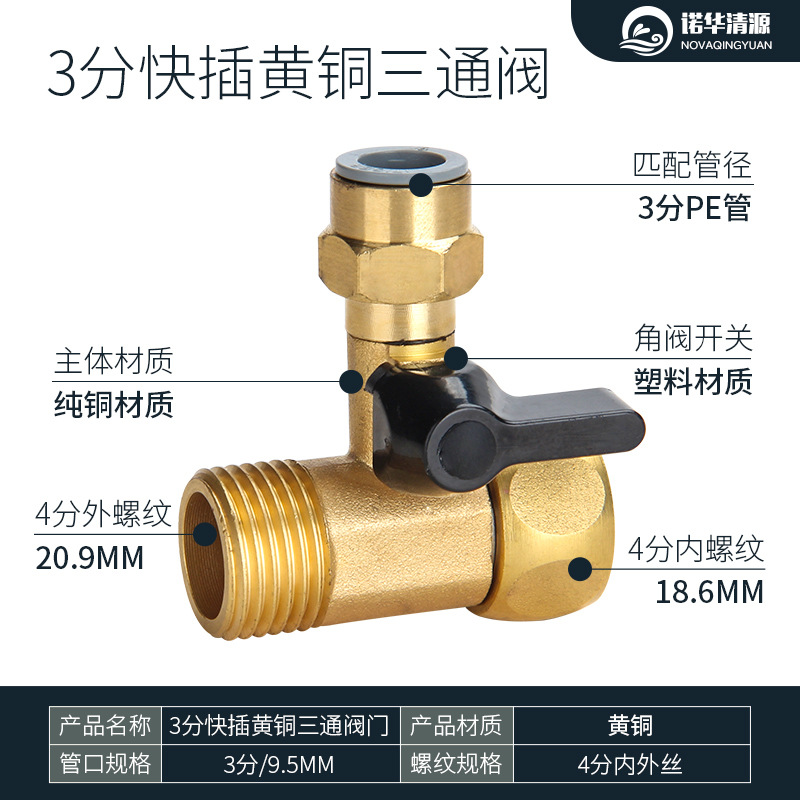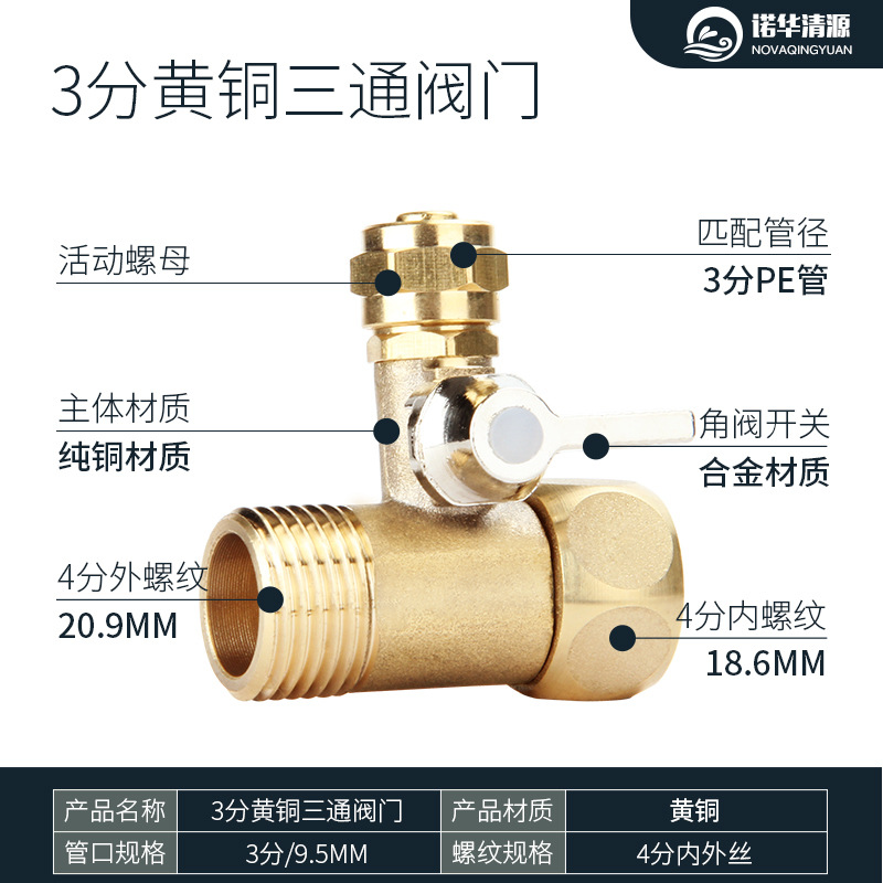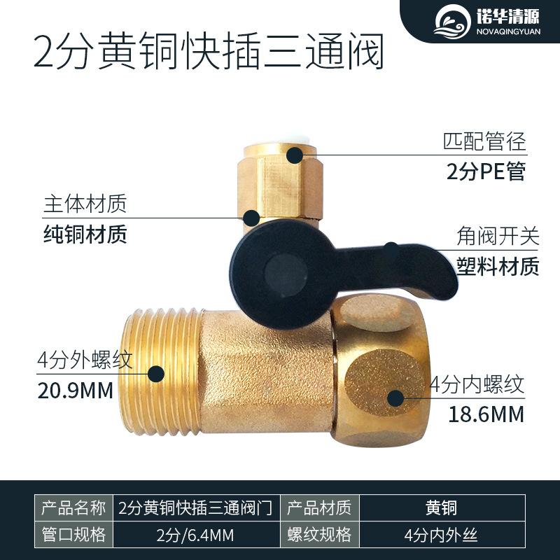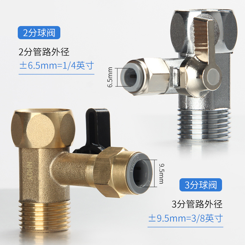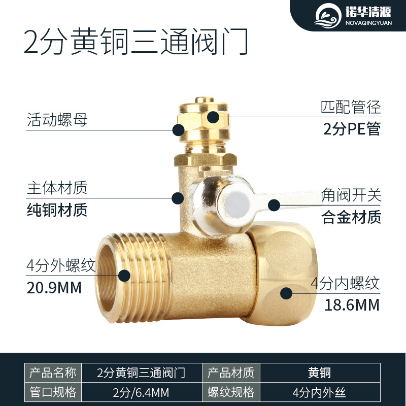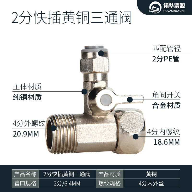 净水器配件2分3分进水三通阀门合金黄铜连体式4转2金属阀4转3开关