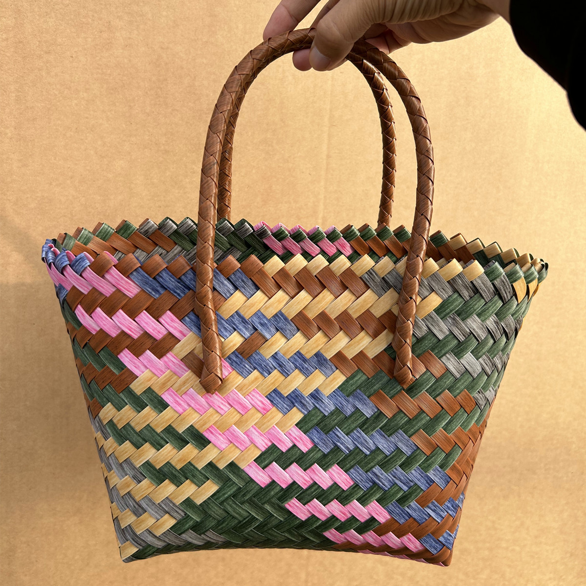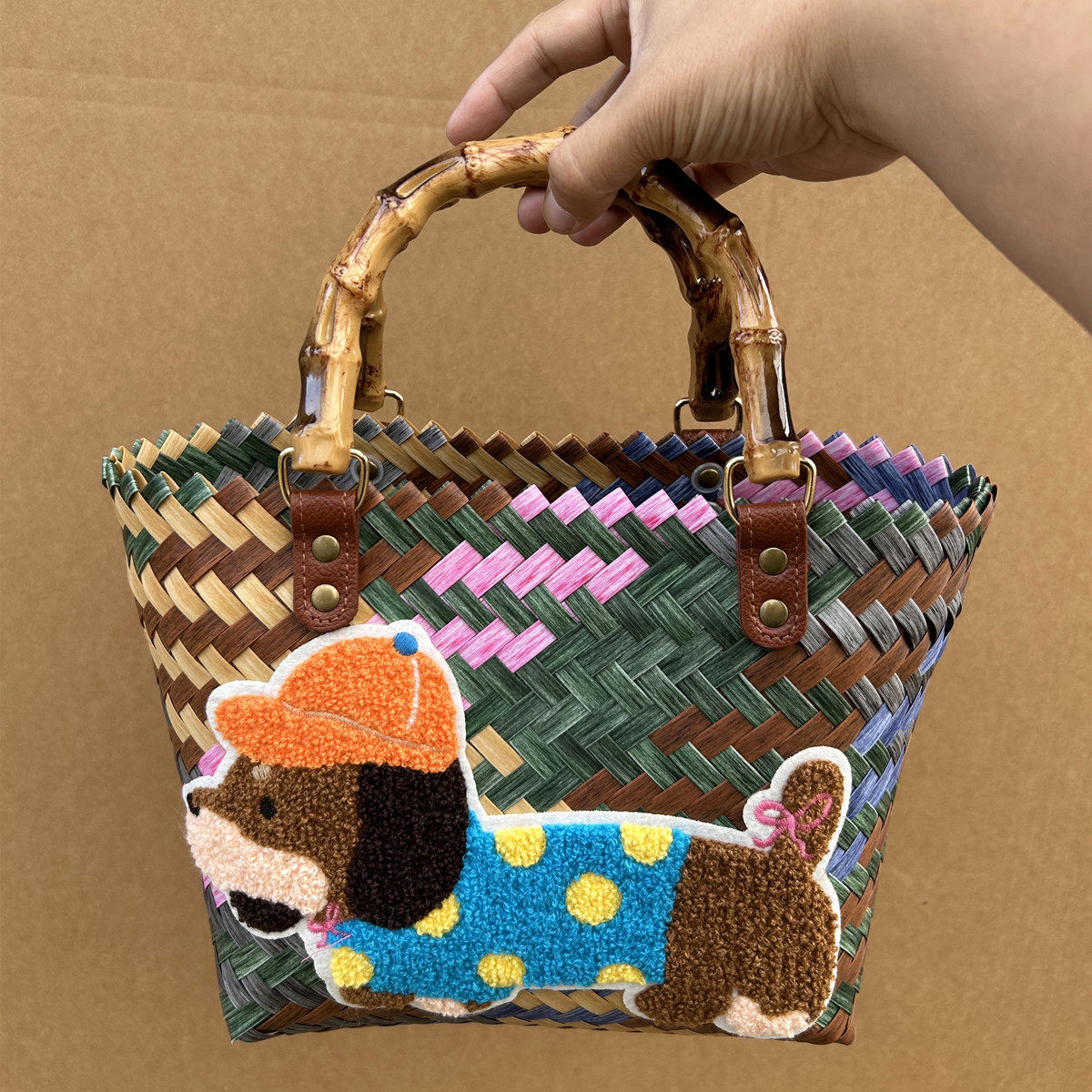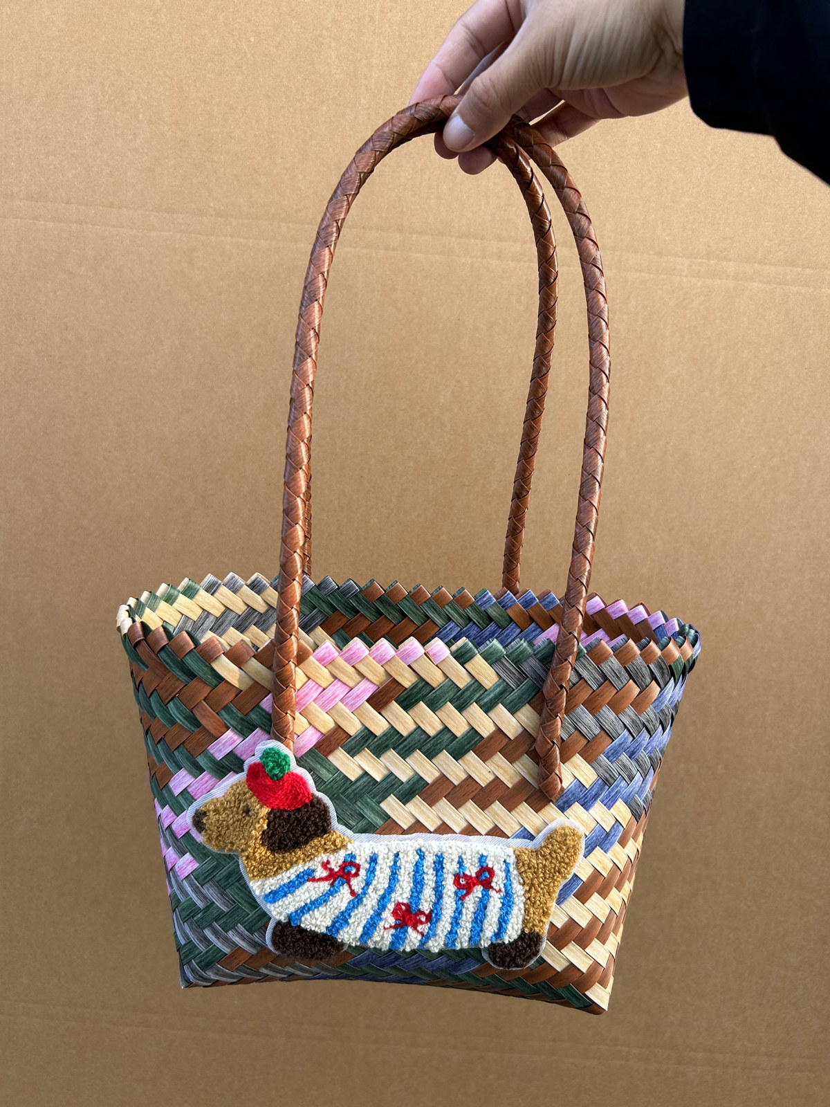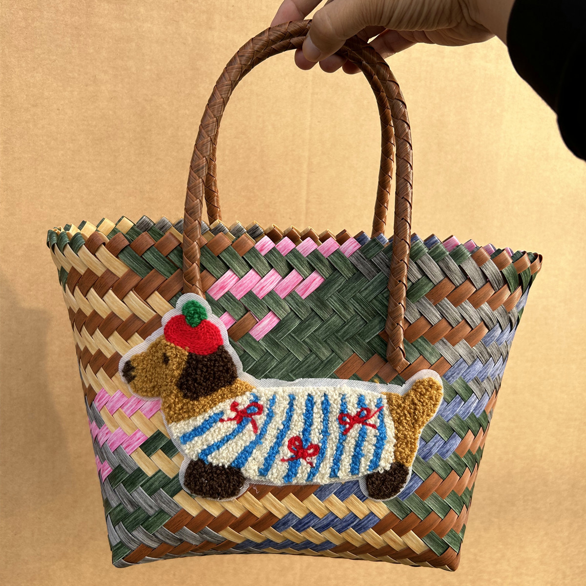复古条纹腊肠狗狗编织包手提包尼龙绳吊坠托特包手拎女包沙滩包