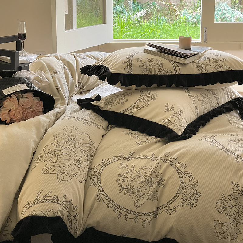 法式灯芯绒加厚牛奶绒四件套冬季保暖加绒被套床单珊瑚绒法兰绒
