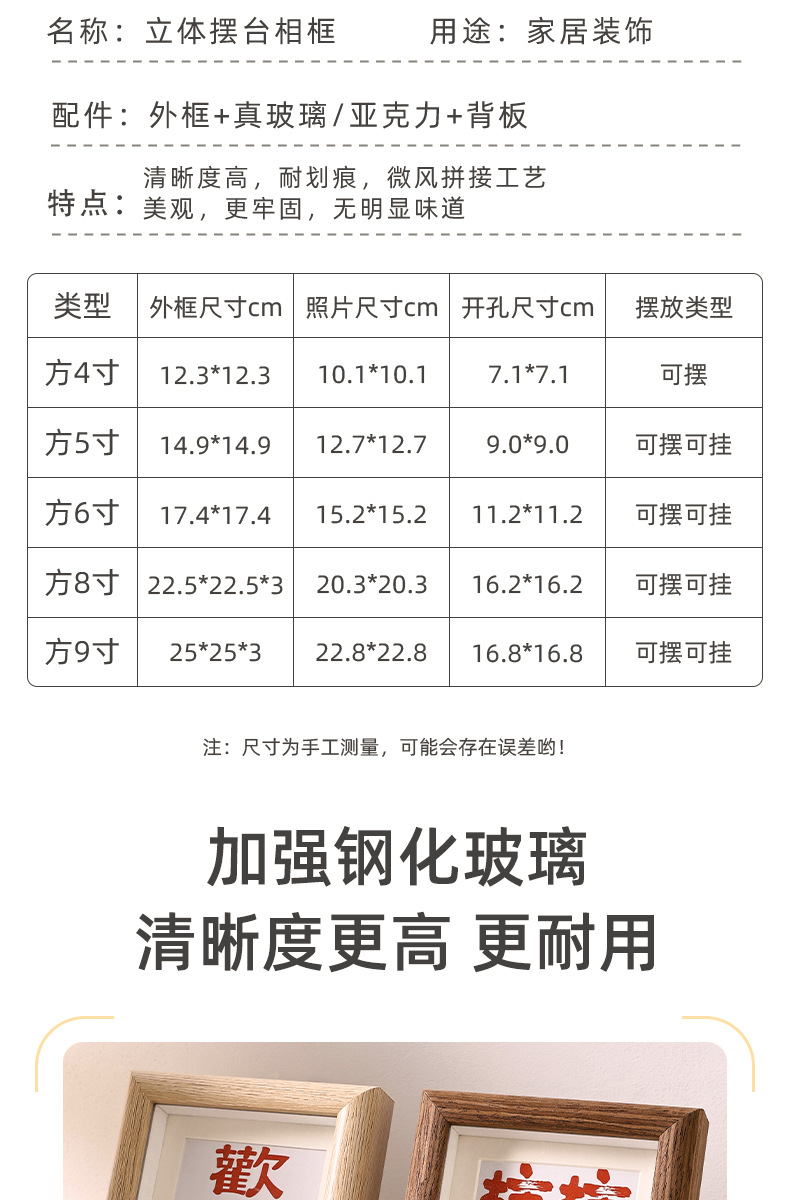 中空款:方形4寸 方形5寸 方形6寸均为玻璃材质 方形8寸跟方形9寸为玻璃跟有机玻璃两种随机发哈