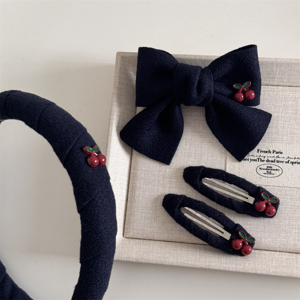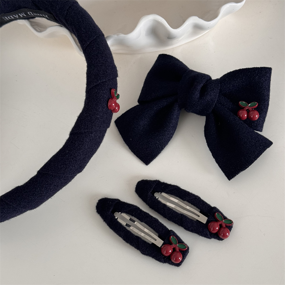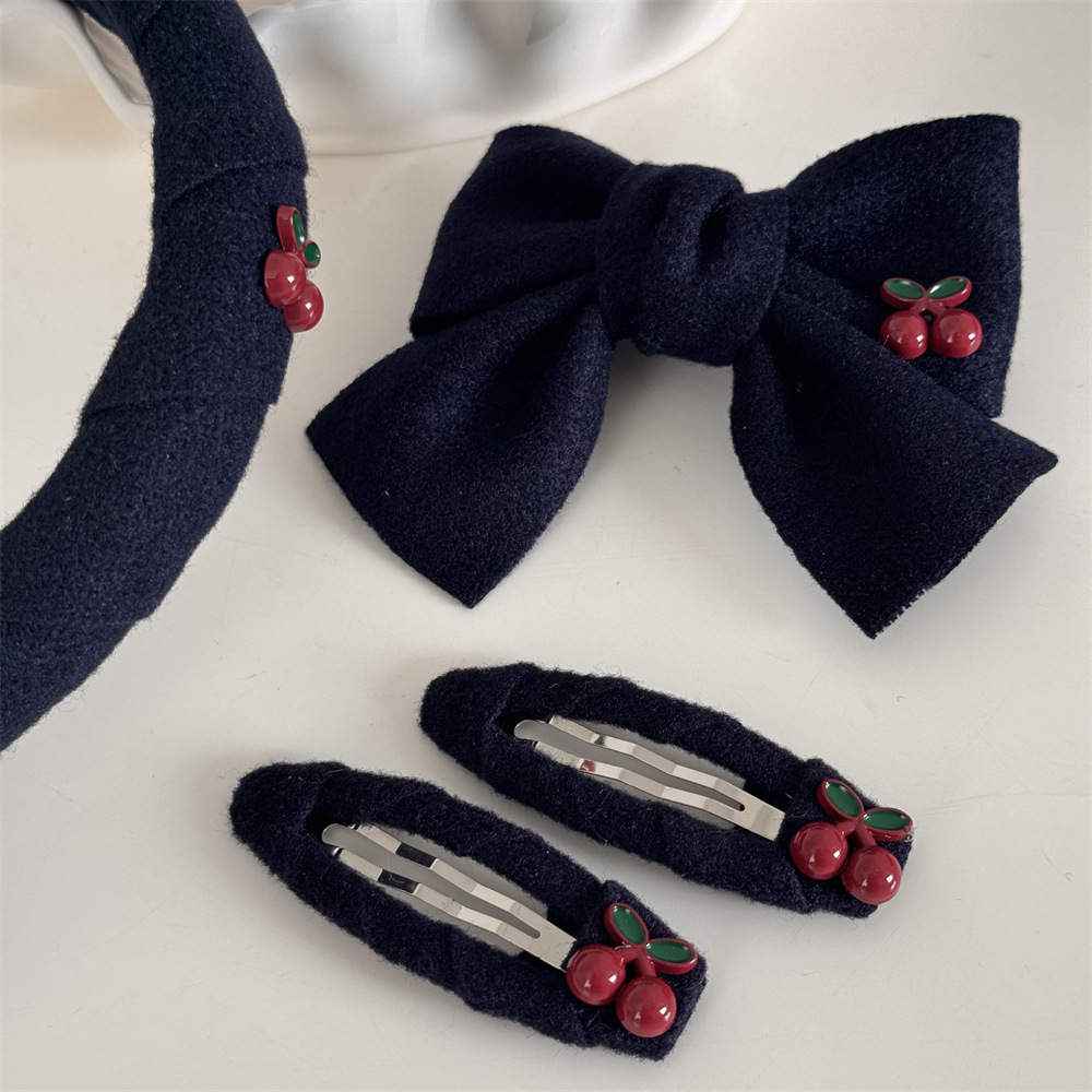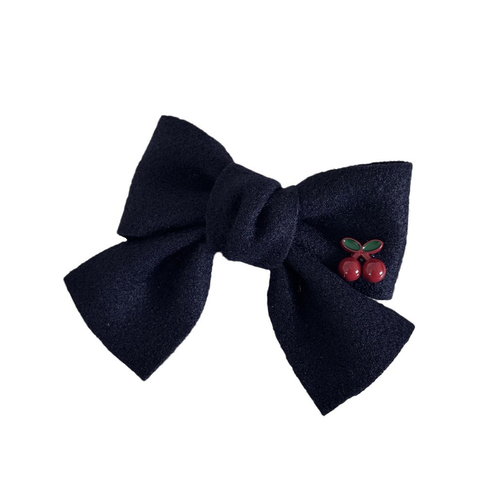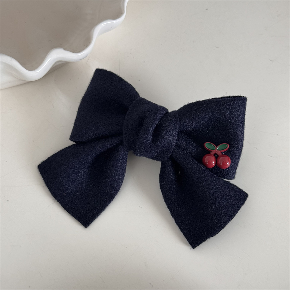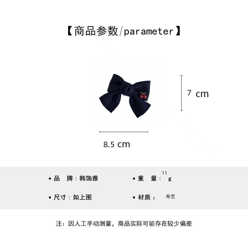 日系风格藏青小樱桃布艺发夹刘海夹BB夹高级感藏蓝色蝴蝶结发卡女