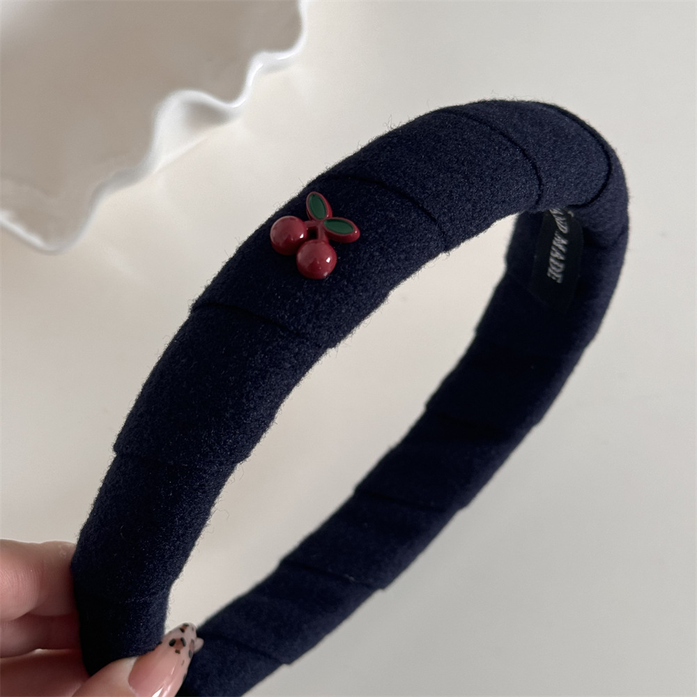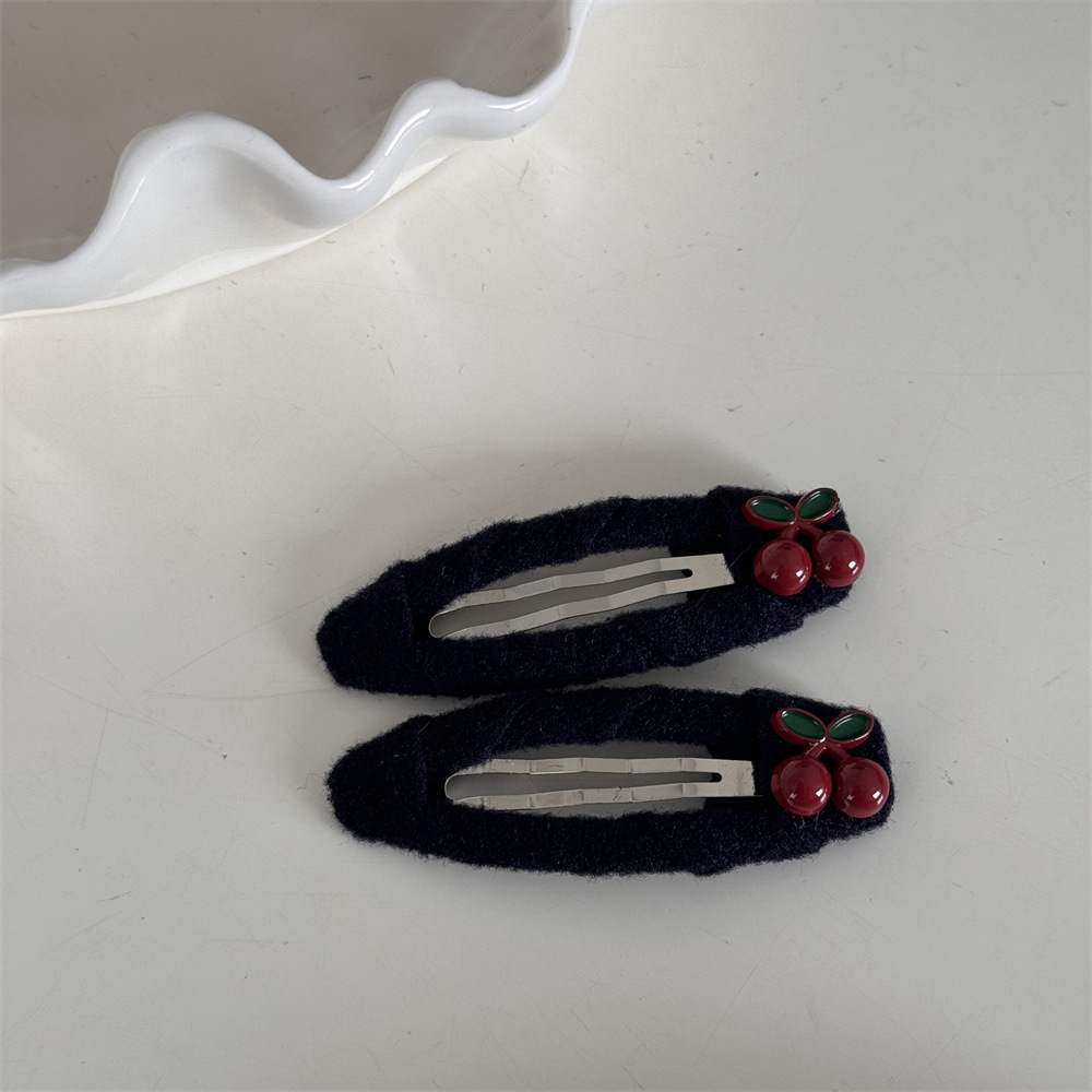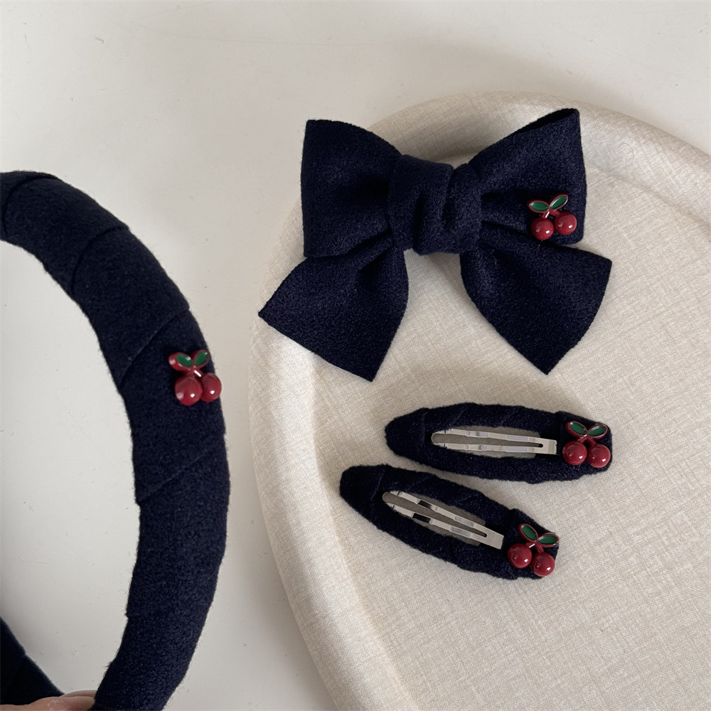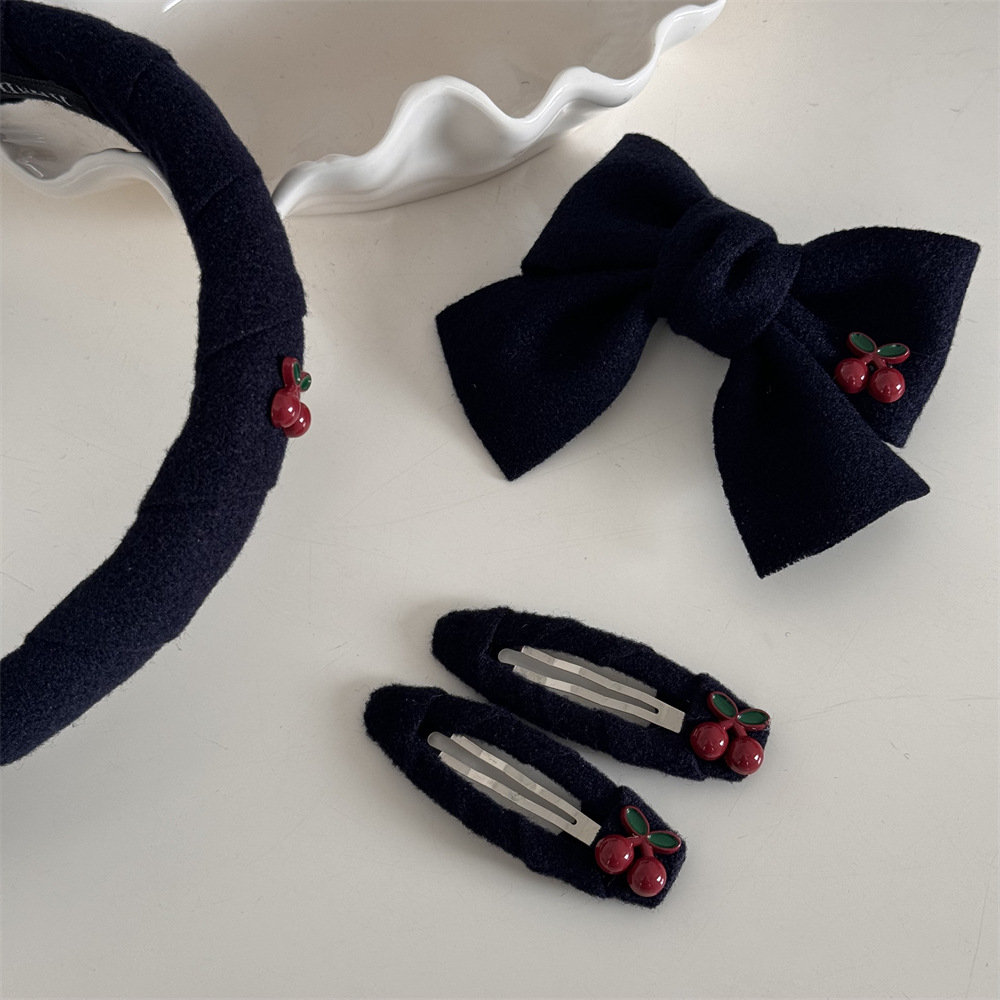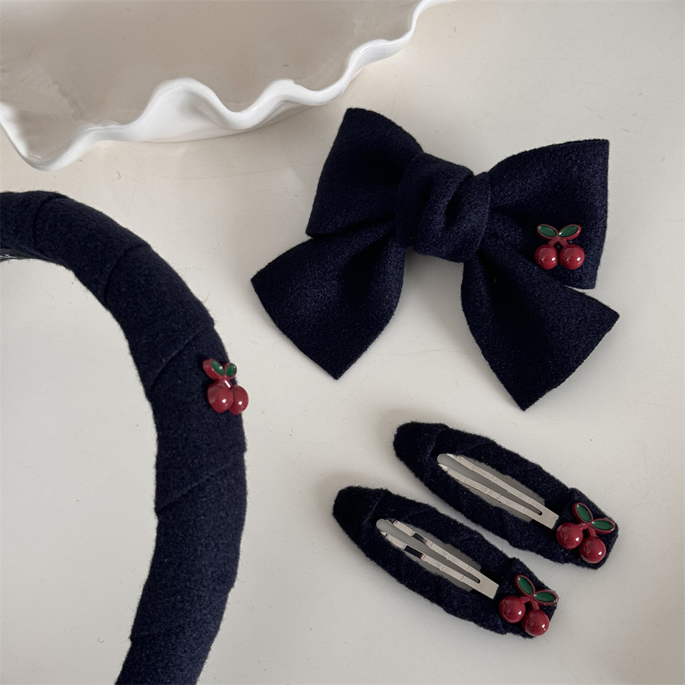 日系风格藏青小樱桃布艺发夹刘海夹BB夹高级感藏蓝色蝴蝶结发卡女