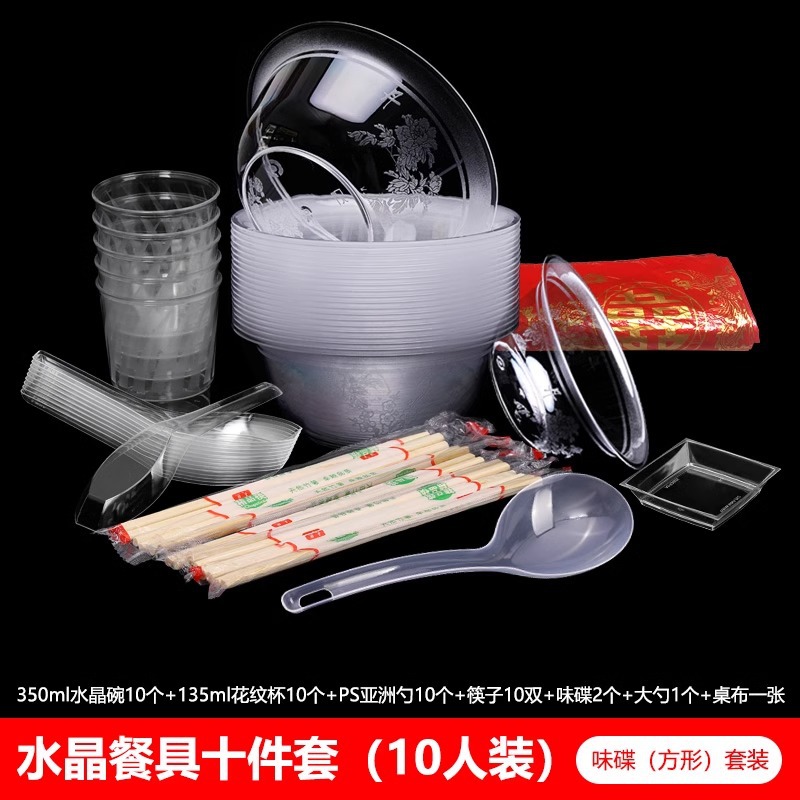 300ml一次性碗筷杯组合水晶碗盘硬塑料透明碗火锅汤饭碗餐具套装