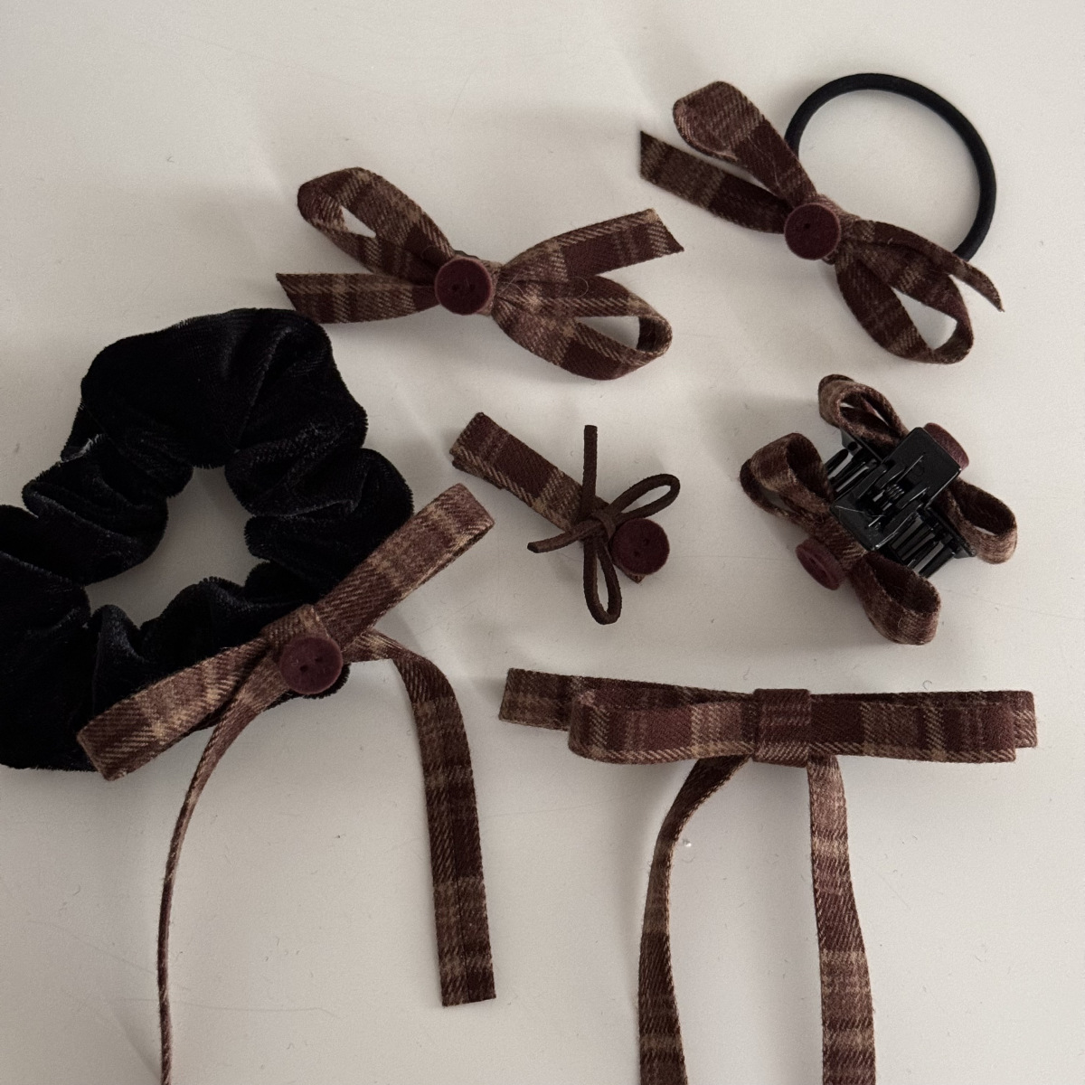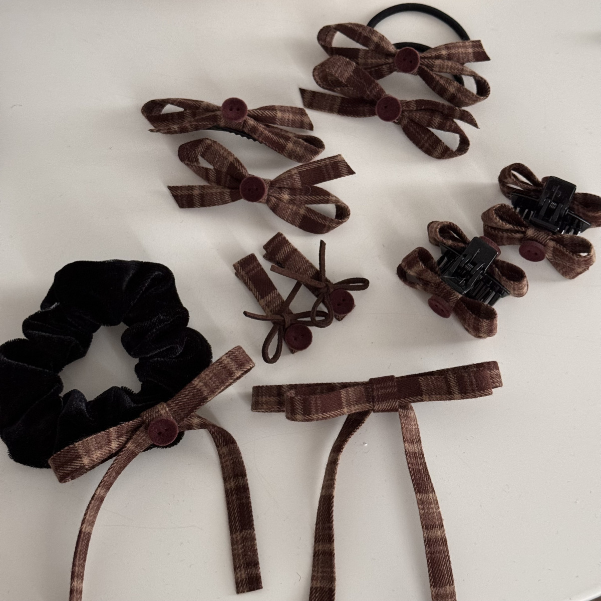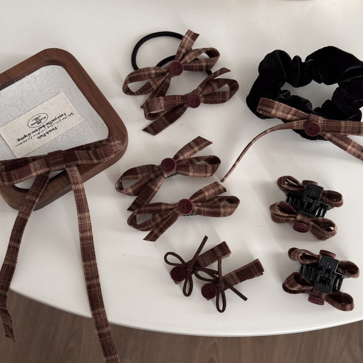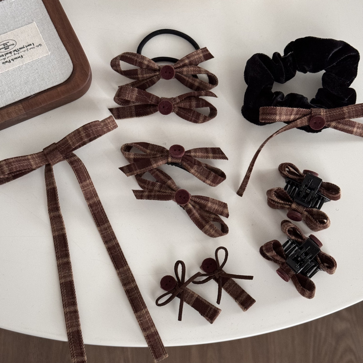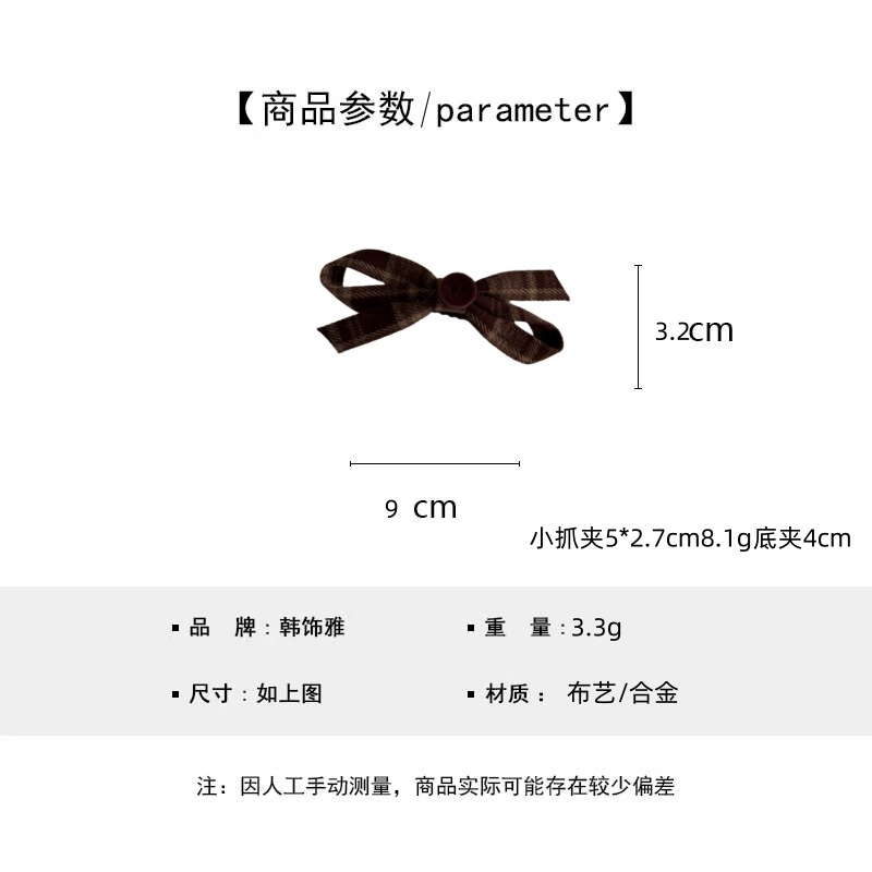 咖色格纹蝴蝶结纽扣发夹长飘带复古美拉德发饰新款刘海夹抓夹发饰